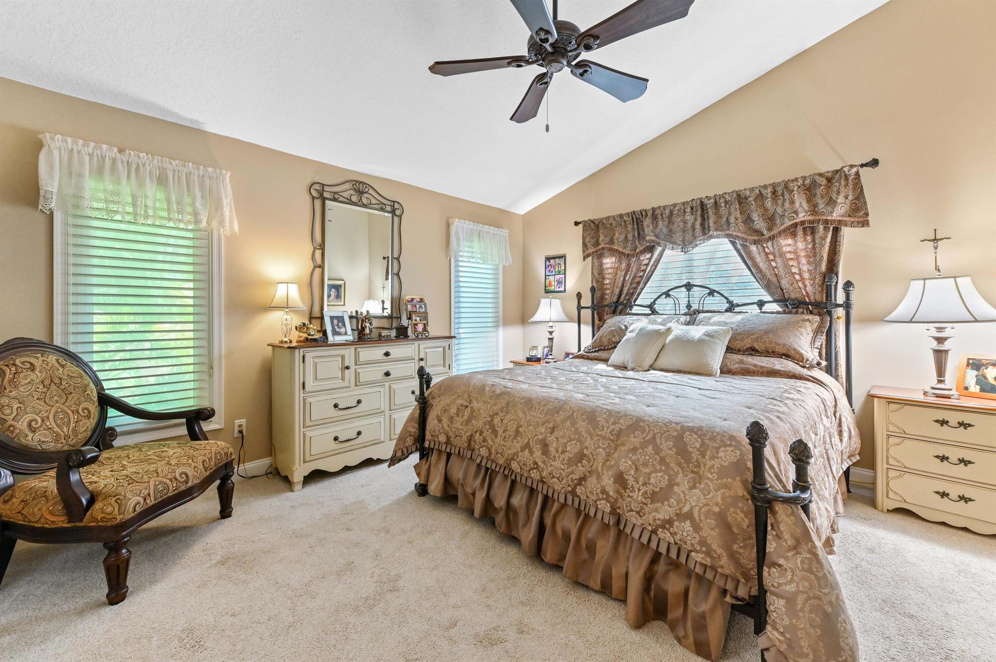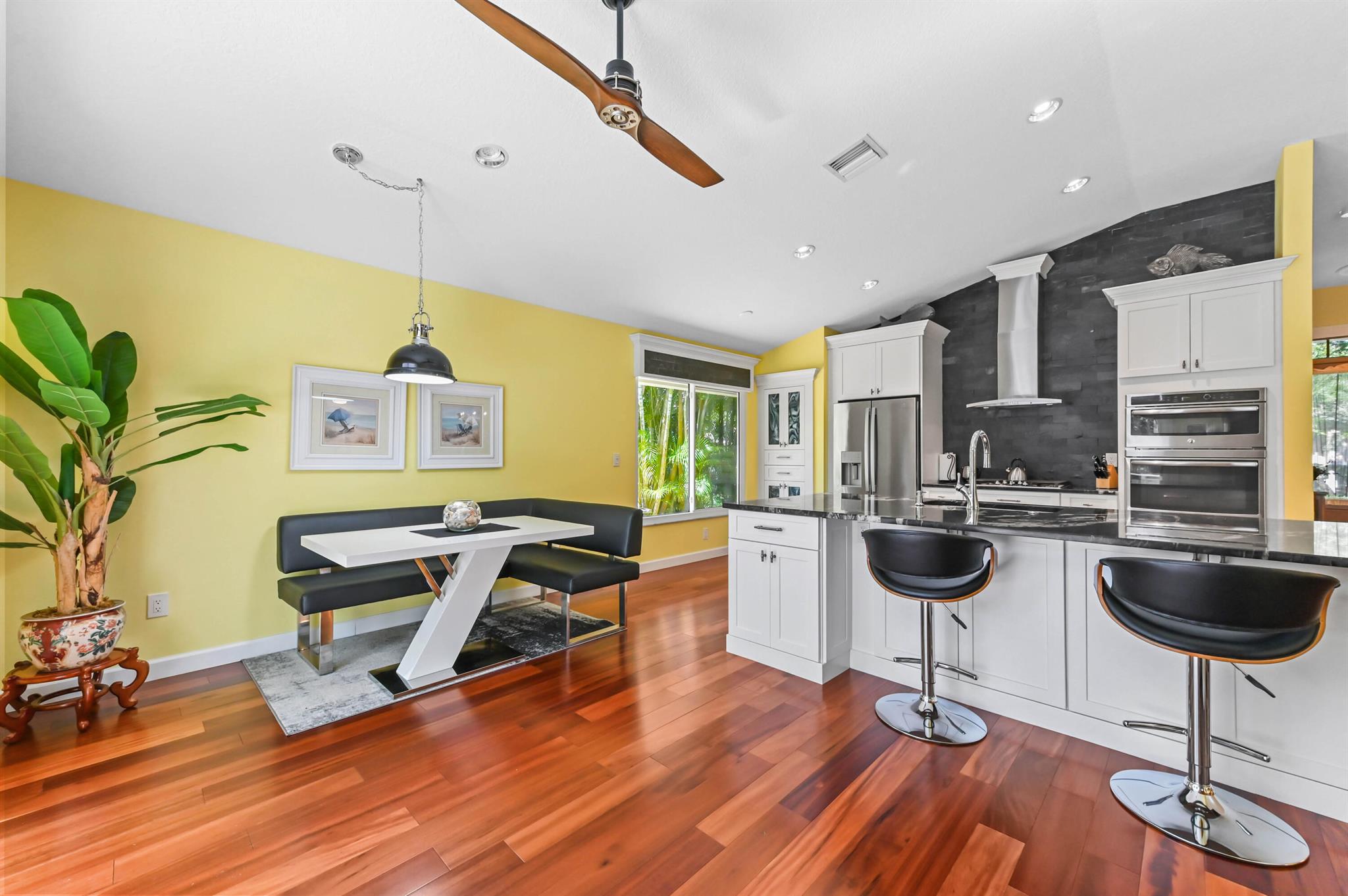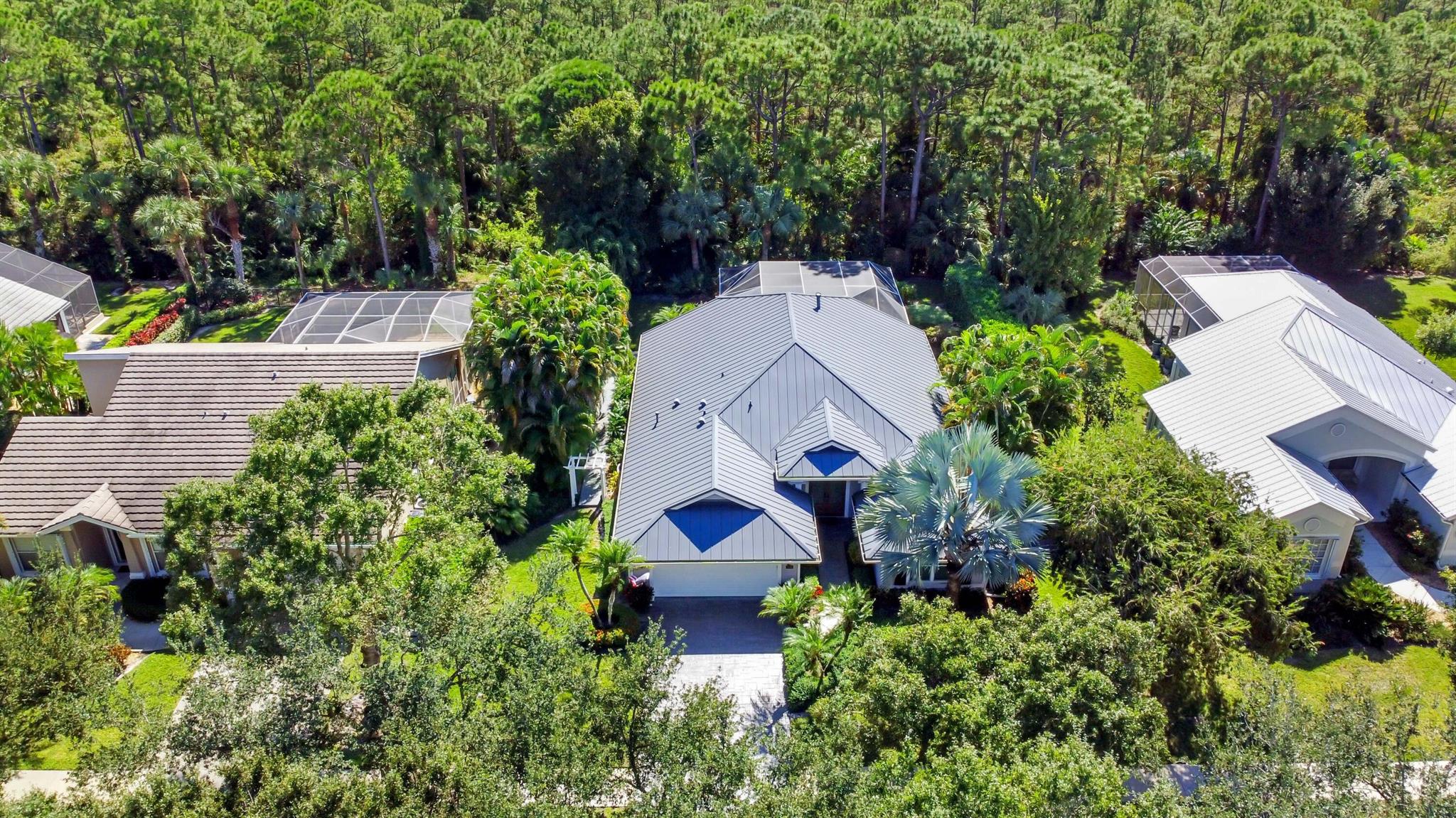 Prepare to be captivated by this stunning, custom-designed single-family pool home, perfectly situated in a desirable Hobe Sound community. The residence exudes charming curb appeal, featuring a modern metal roof, impact windows, a stylish stamped concrete driveway, and lush tropical landscaping that frames the home. The covered front entry features elegant columns and handsome double entry doors with unique dark hardware, setting a sophisticated tone from the moment you arrive.