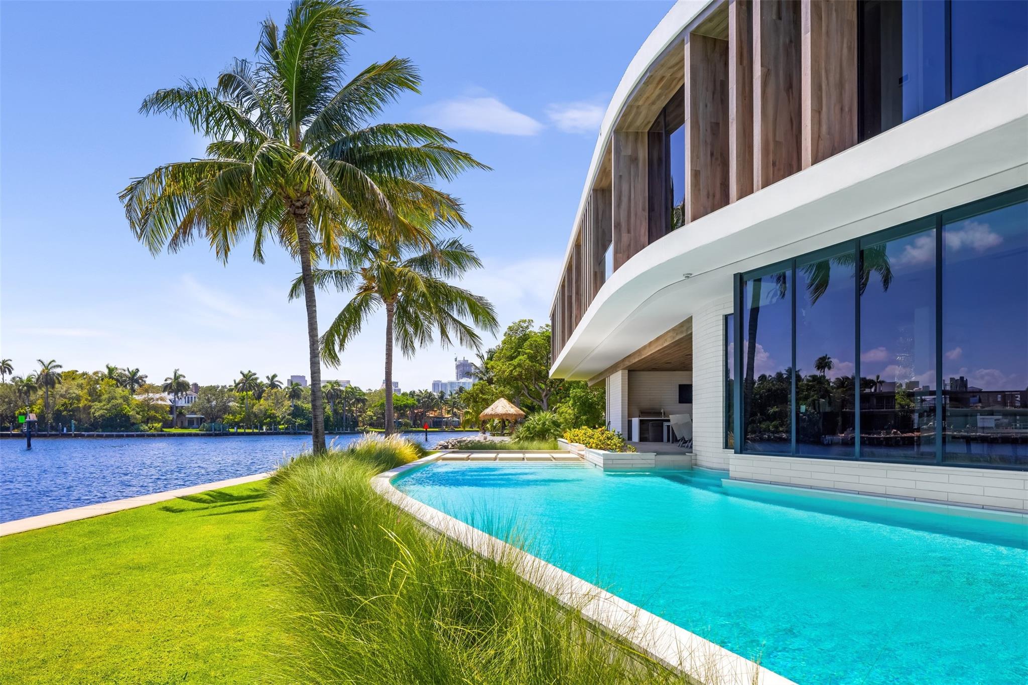 516 Mola. FTLs most unique, gated Peninsula Estate designed by renowned architect Max Strang & built by Bomar Builders, situated on 0.86 acres. Find panoramic views, a combined 640' of WF, a jaw-dropping floating Cantilever design & even a pickleball court! Notice a harmonious fusion of modern aesthetics and organic elements paired w/interior design by DKOR, crafted to complement the natural surroundings. Floor-to-ceiling windows & skylights grant natural light & Chef's Kitchen w/ hidden prep pantry w/ formal dining are perfect for entertaining. Be wowed by the Primary Suite's balcony w/New River views, gym, sitting room/office, expansive closet & spa-like bath. Home features include a full Apartment suite, movie theater, wet bar, European white oak wood floors & Savant/Lutron home system.