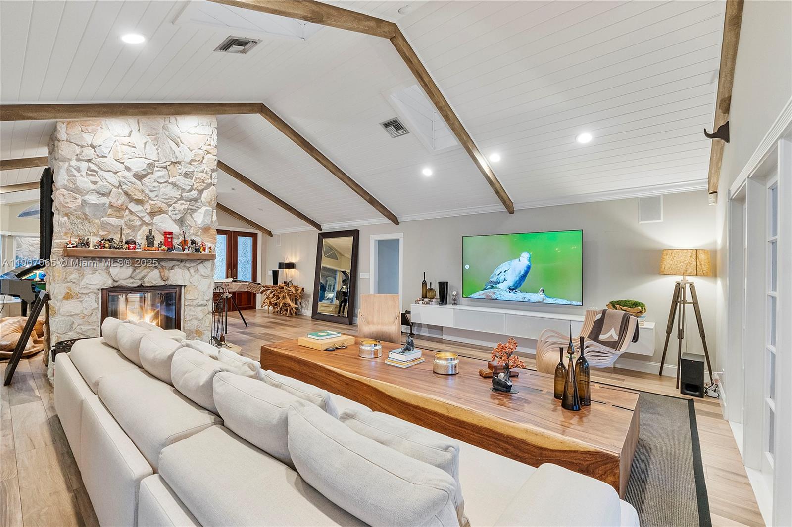 Coral Springs Incredible waterfront estate on a private cul-de-sac in the exclusive Whispering Woods community. Elegantly renovated with new plank flooring, a professional-grade kitchen, and a luxurious primary suite with a spa-inspired bath. Over 5,000sqft of open living and entertaining space featuring vaulted wood-beam ceilings, a striking two-sided fireplace, and a spacious room ideal for a gym, playroom, or in-law suite. Impact windows and doors, newer concrete tile roof, and exceptional outdoor living with a resort-style pool, spa, and tiki entertainment area. Set on one of the largest lots in the neighborhood with outstanding curb appeal easy to show and sure to impress. Huge price reduction - Furniture sold separately !!
