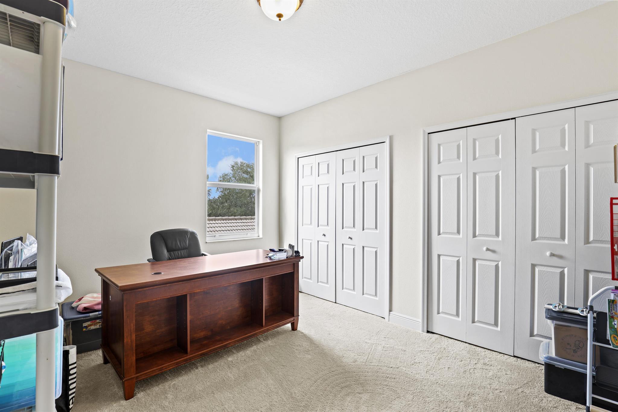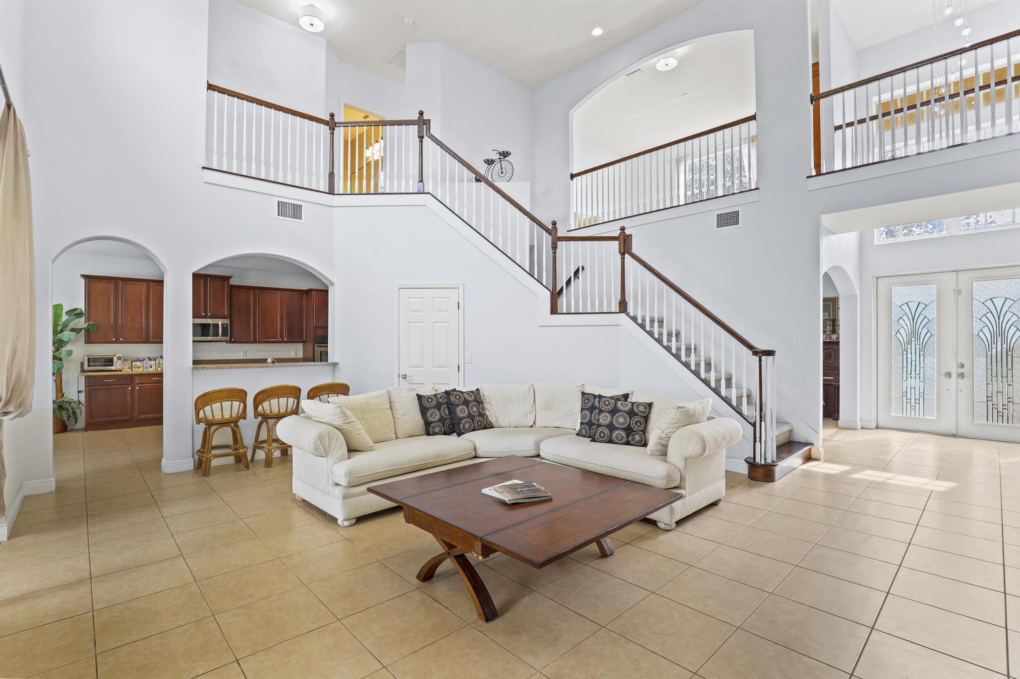 Perfect for multi-generational living, this spacious estate home is built w/ CBS construction, impact windows, doors & sited on a premier fully fenced lakefront lot. The gracious living area has volume ceilings and an outstanding floor plan. The primary suite plus additional bedroom are conveniently located on the main level. Upstairs, you'll find the remaining bedrooms, a loft, and a distinctive ''West Wing'' offering two bedrooms plus a grand bonus/flex space (perfect for a movie theater, golf simulator, club room, or any dream setup.) Other highlights include renovated primary bath, upstairs balcony, an additional staircase, extended driveway, and a striking front entry door. Exceptional value in this well-built home, ideally located within a gated community just minutes from I95
