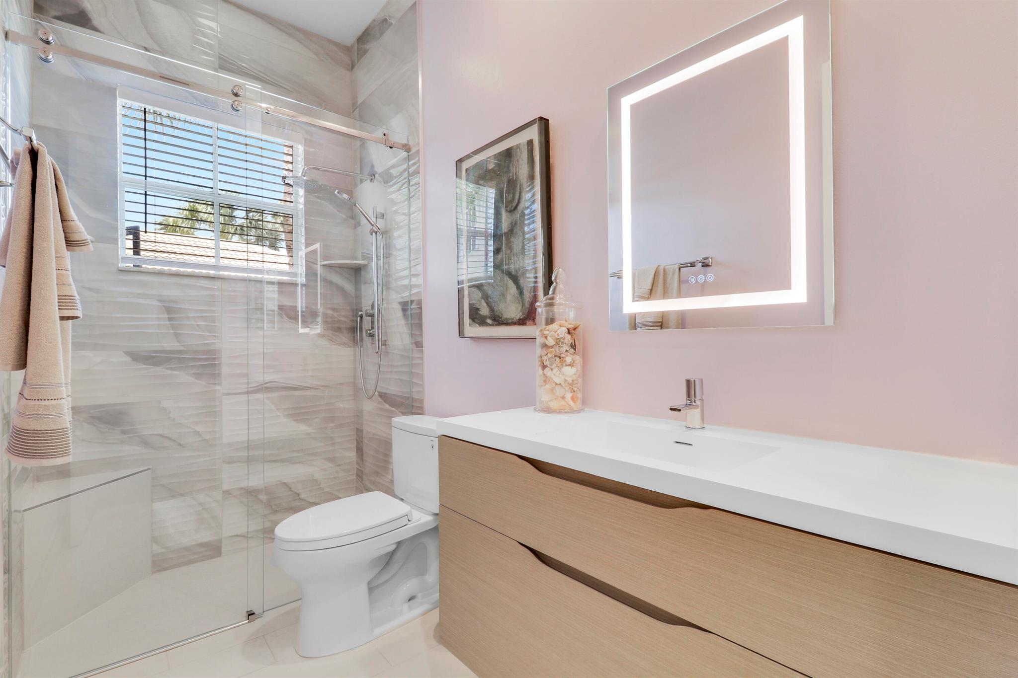 Welcome to this 4-bedroom, 2.5-bath home located in the desirable gated resort-style community of Mirabella. This extended El Prado model offers a spacious open layout with volume ceilings and a split floor plan with tile throughout; 4th bedroom currently set up as den. Perfect for both everyday living and entertaining the home features a large gathering room, open dining and kitchen with updated appliances and access to a private backyard oasis, complete with both covered and open patio areas and a peaceful green space. Additional upgrades include remodeled bathrooms with frameless glass showers, accordion shutters for storm protection, a tankless water heater, modern coach lights, and an extended-width driveway. Mirabella offers resort-style amenities including a gorgeous pool and