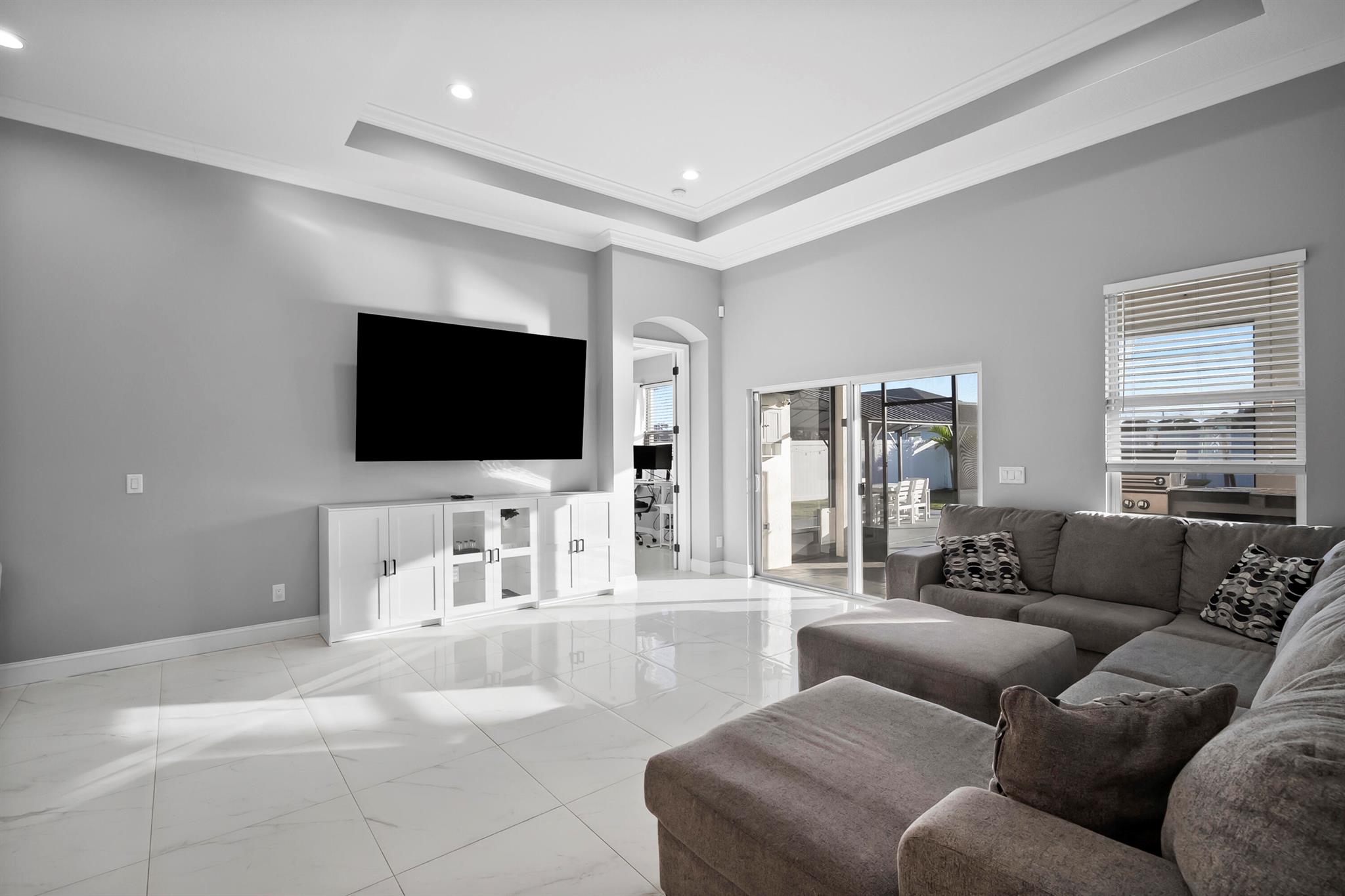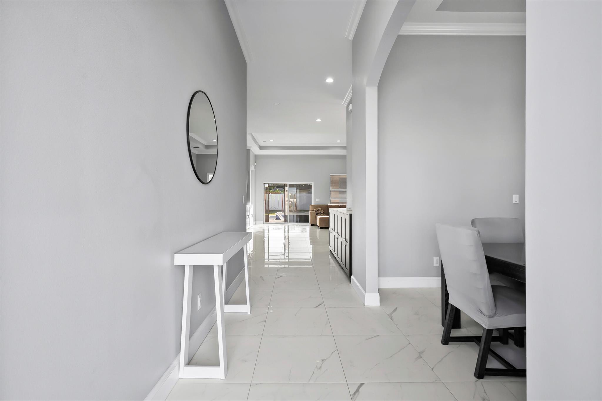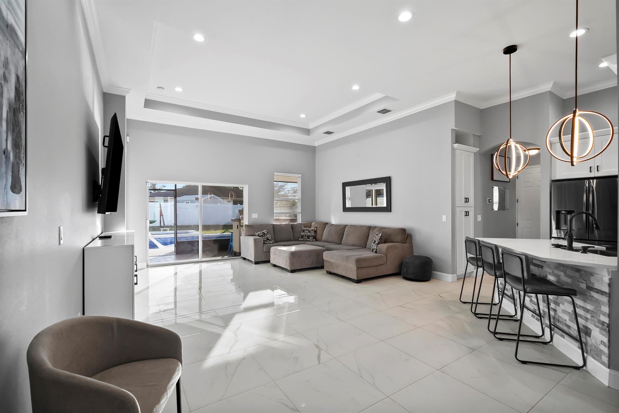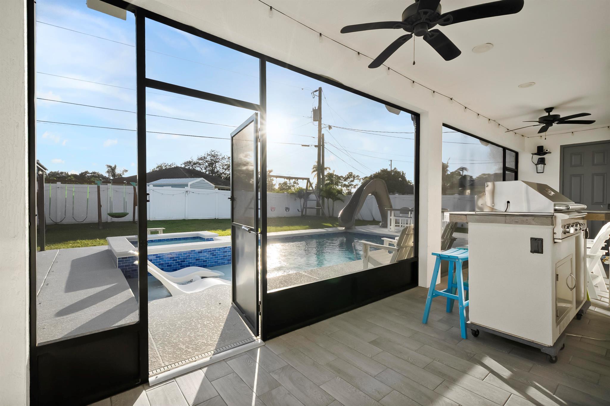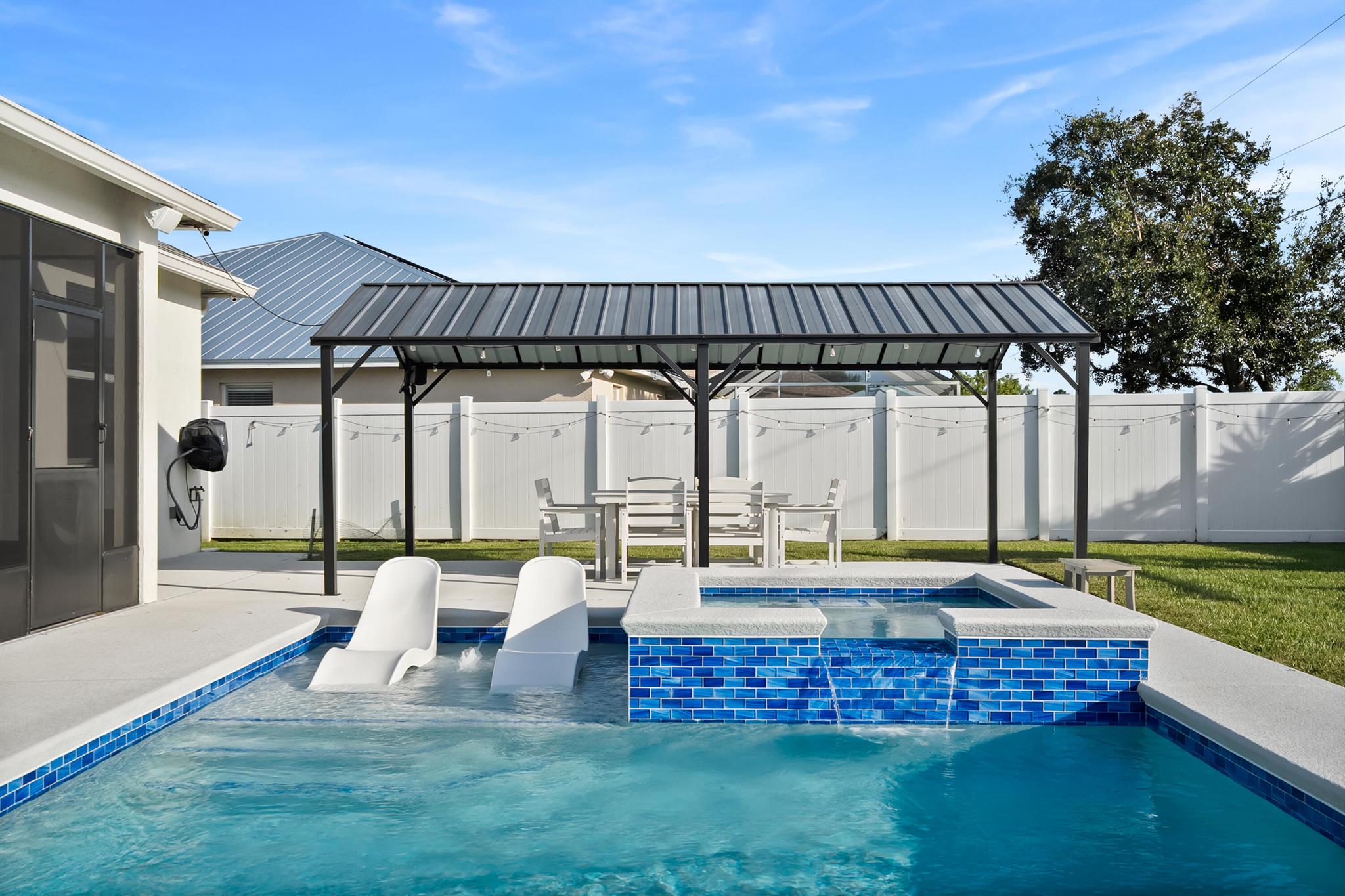Welcome home to this custom 2021 5-bed, 3-bath CBS home featuring impact windows, high ceilings, crown molding, 42'' cabinets with quartz countertops and backsplash, and a breakfast bar. The split floor plan offers a spacious primary suite with two walk-in closets. The luxurious primary bathroom includes dual vanities, a soaking tub, and an oversized walk-in shower. The back bedroom serves as an in-law suite with its own bath and exterior entrance, also acting as a cabana bath.Step outside to your private retreat, perfect for entertaining, complete with a brand-new heated saltwater pool and spa with Pentair IntelliCenter smart automation, sun shelf, water slide, and an extended patio with an oversized pergola, all within a fully fenced yard! Bring all your toys!