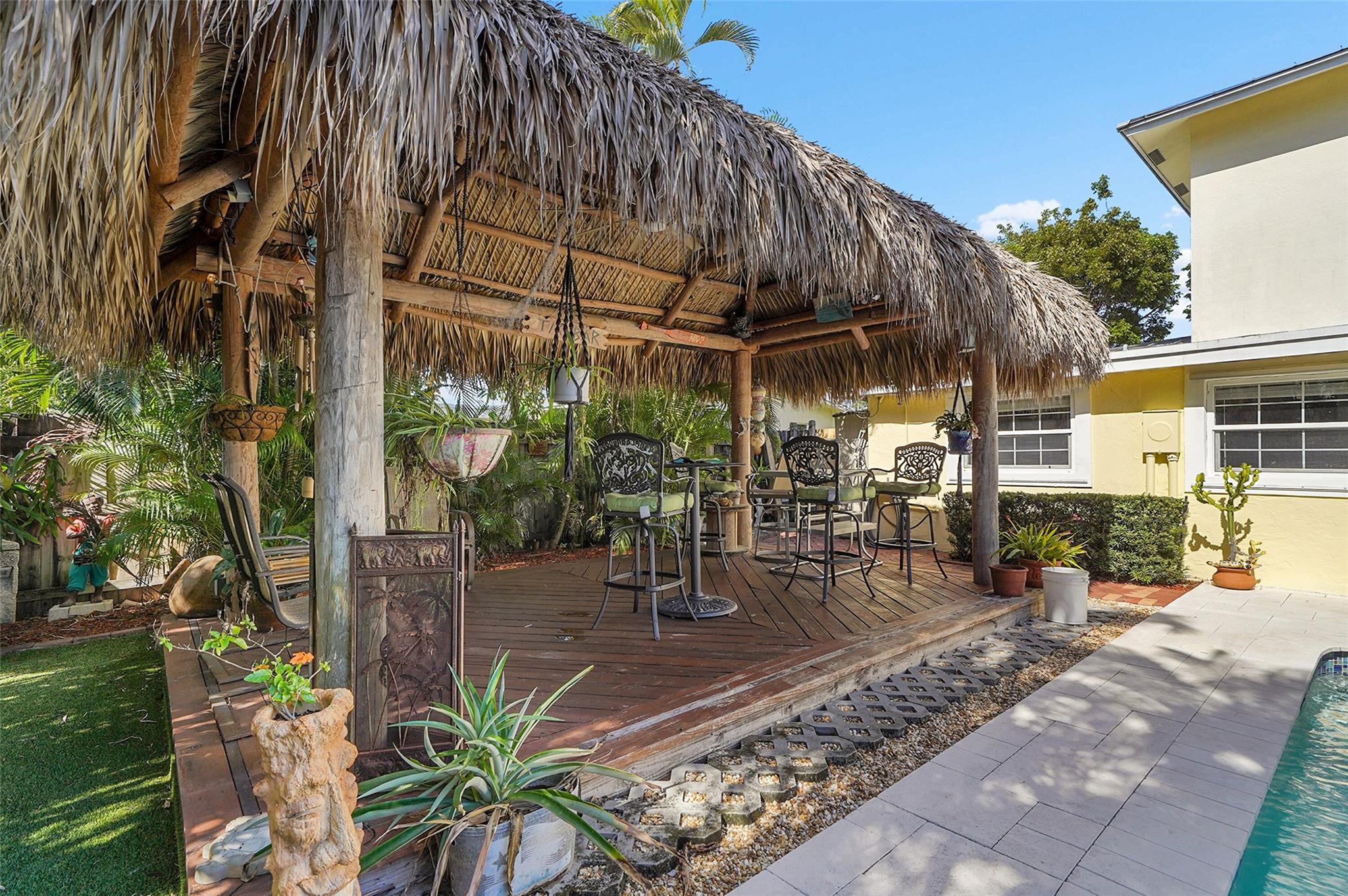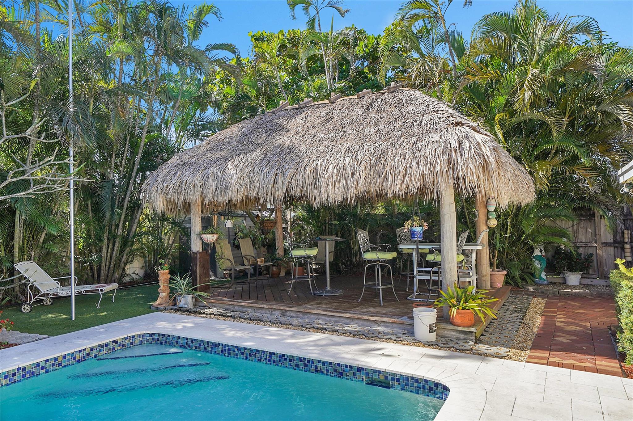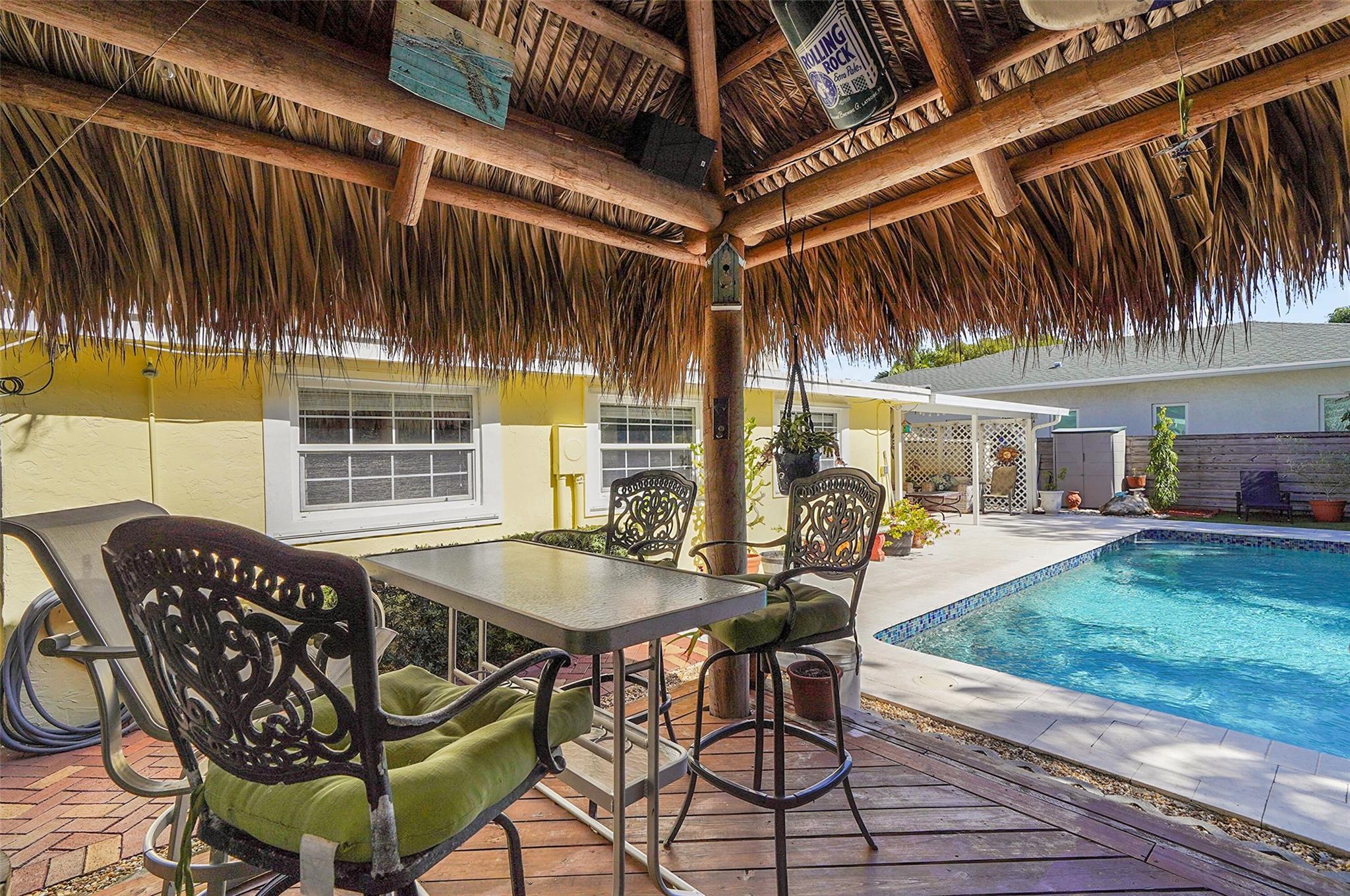 Live the dream in this Key West style home located just minutes from beautiful Deerfield Beach! This home has it all Ride your bike to the beach, shopping and great restaurants, entertain your friends by your pool ,watch the games in your own Tiki hut while enjoying your own private oasis. This home features: metal roof (2007) 2 A/C units. Laundry room W/ full size front loader W/D, Work space garage, Updated kitchen and baths, private oversized primary room upstairs, cozy living space downstairs. fenced yard, side gate for boat storage (up to 28 foot limit), 3 storage sheds, cool water spa, salt water pool system, resurfaced with new decking in 2015, Hurricane panels, Impact French back door and Impact bathroom window all for peace of mind. This home is ready for you and easy to show.