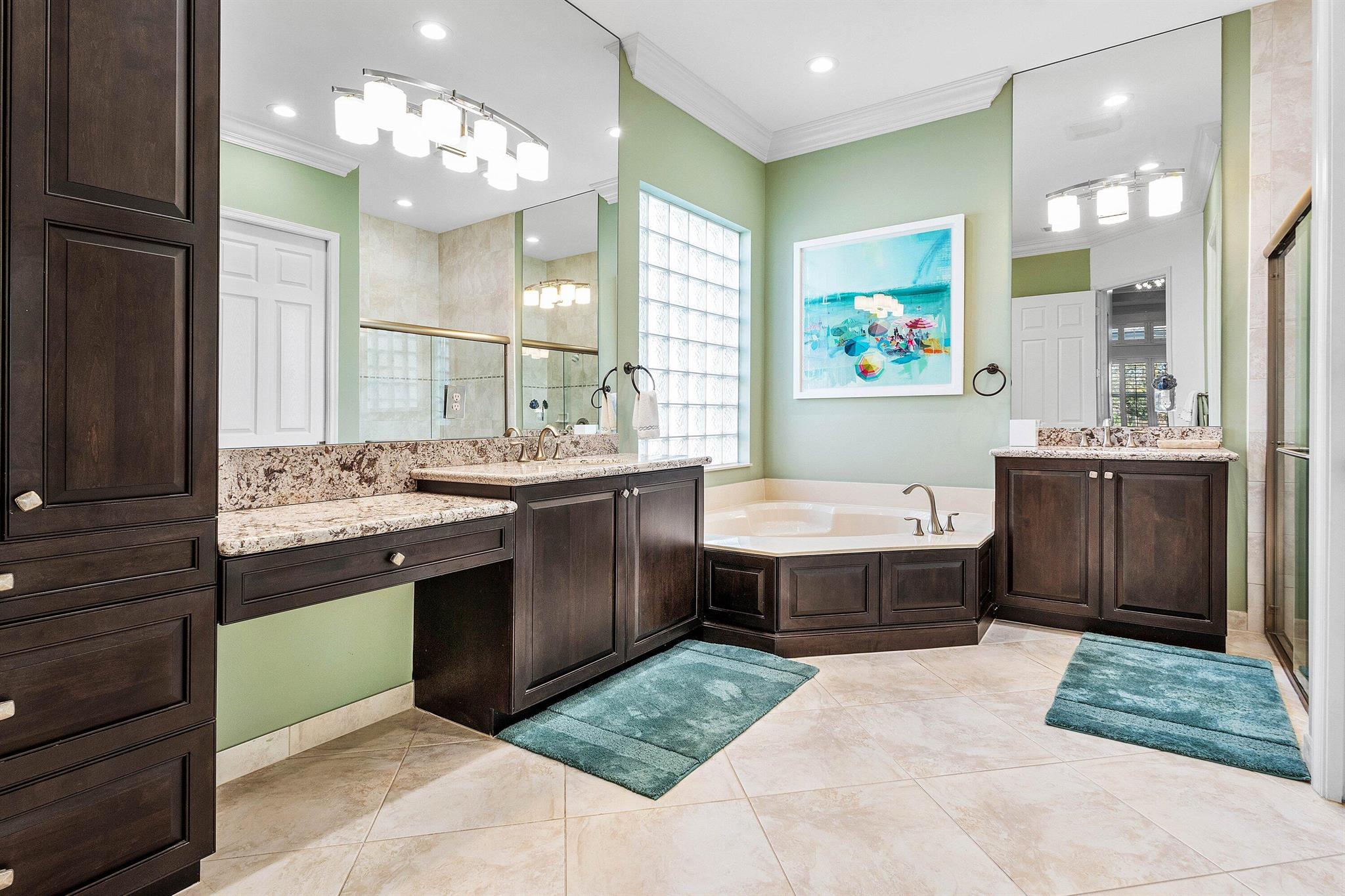 • Interior Feature:BreakfastBar, BuiltInFeatures, DiningArea, SeparateFormalDiningRoom, DualSinks, EatInKitchen, GardenTubRomanTub, HighCeilings, Pantry, SplitBedrooms, SeparateShower, WalkInClosets