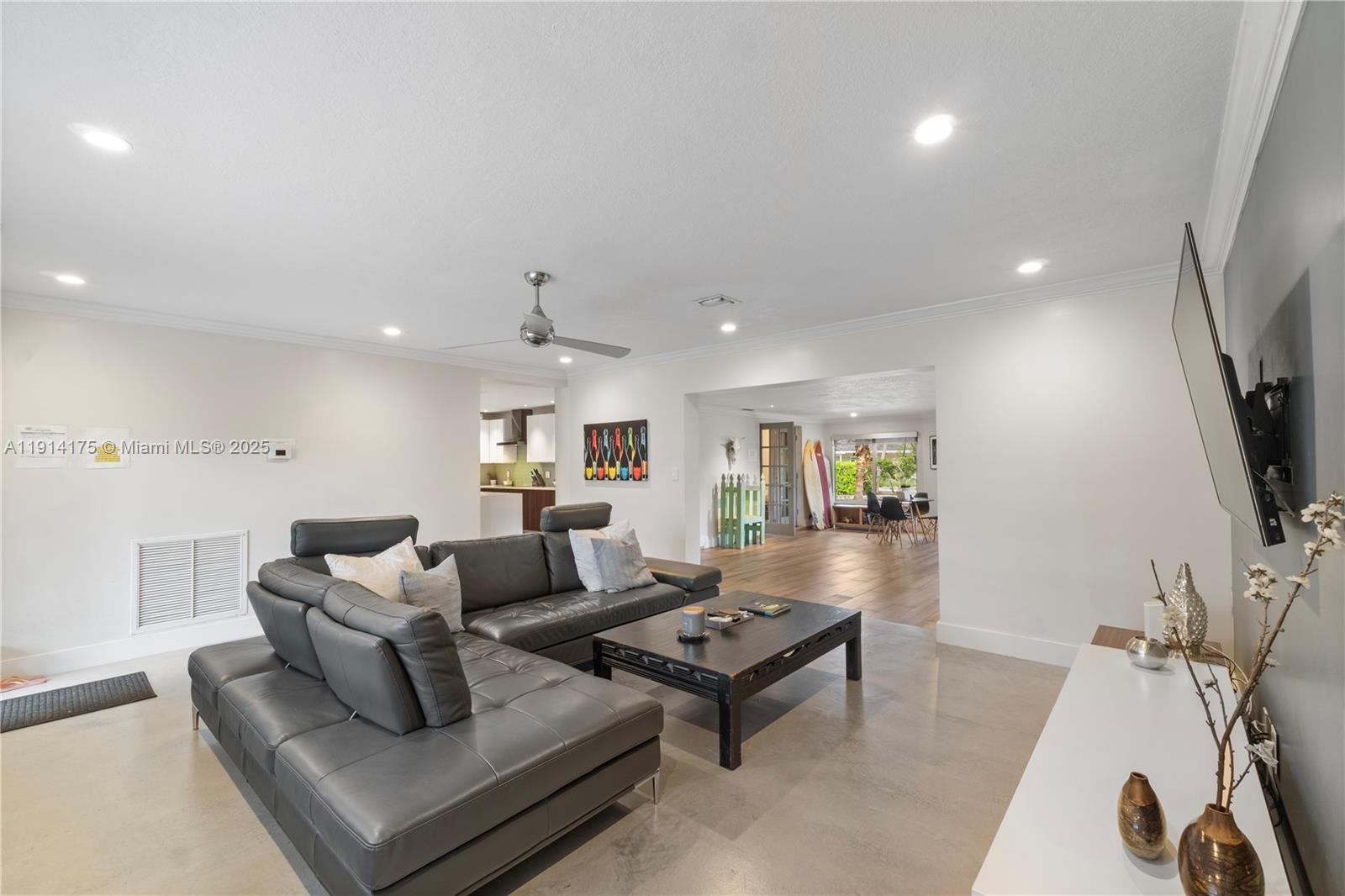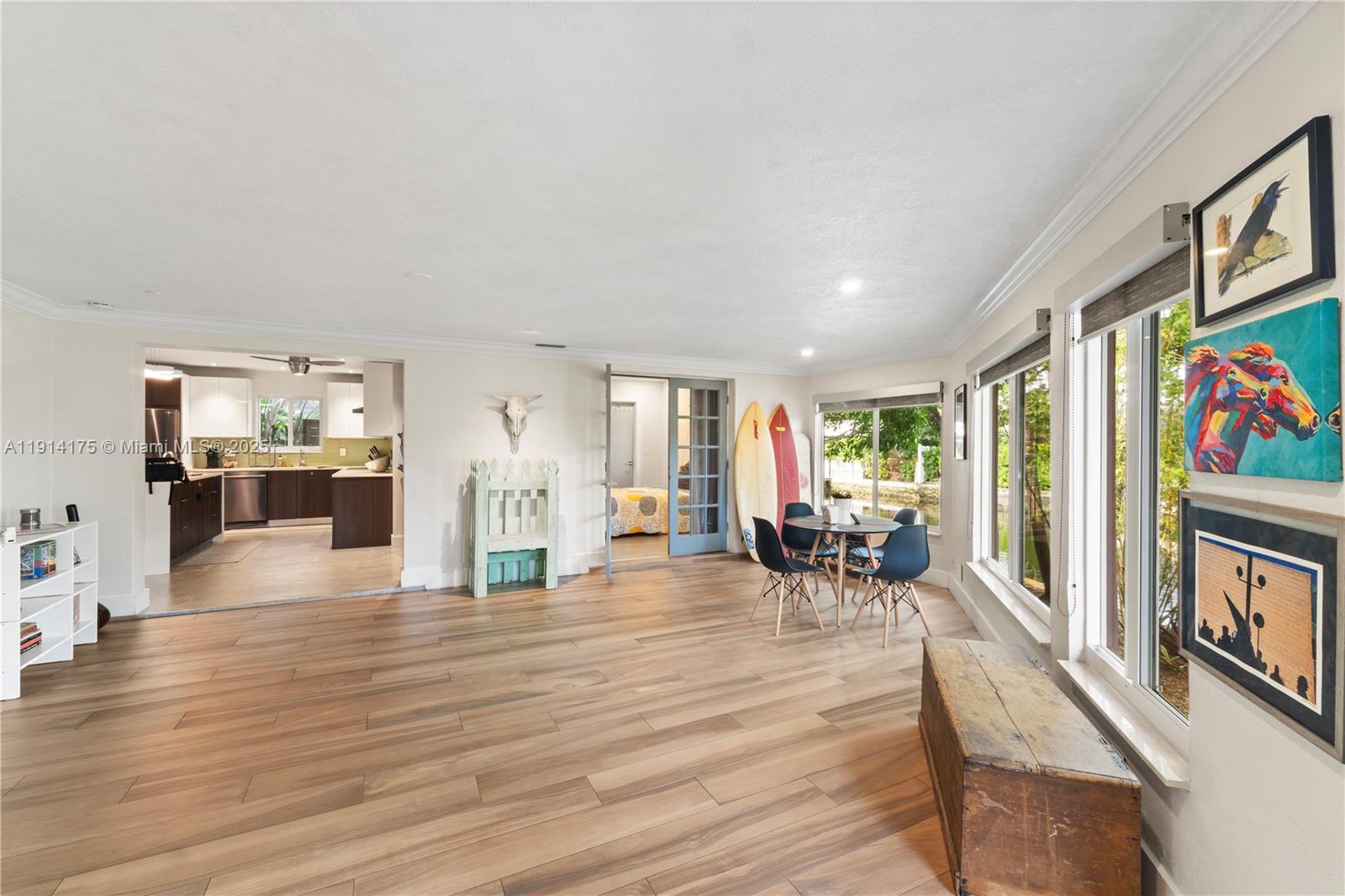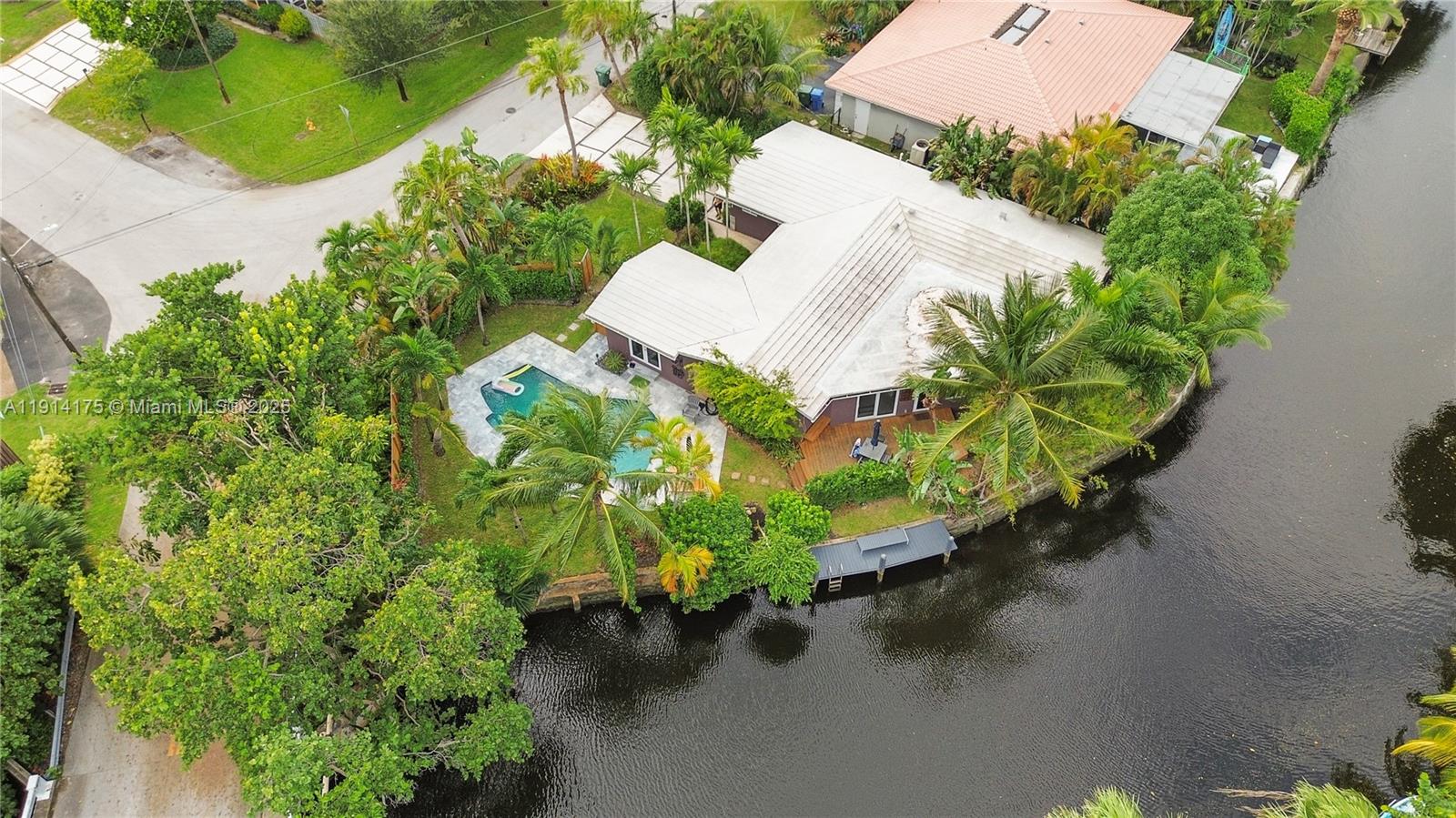 TRUE two car garage/utility sink,all impact,double wide modern slab driveway, resurfaced pool (new tahoe paver).Modern open concept,w 128 ft.curved frontage,dock,water view from every room,OCEAN ACCESS for small craft,watersport toys,outside shower.Oversized corner lot,lush landscaping. Upgraded LED lighting throughout&exterior dimmers/smart switches.Newer electrical/fuse box,PVC plumbing, tankless water heater,well irrigation,new deck,newer fence.Soft close kitchen custom cabinets,quartz countertops&large island w double sinks(food prep & main sink),Thor induction range,polished concrete floors, available furnished. Minutes to Funky Buddha, LA Fitness,Fresh Market,5 min to Wilton,LBS,10 min to Las Olas & Airport.