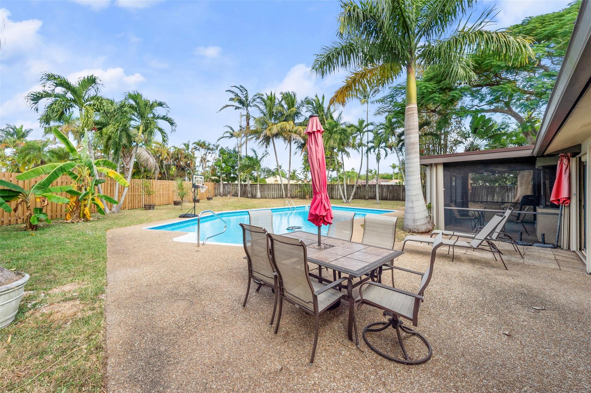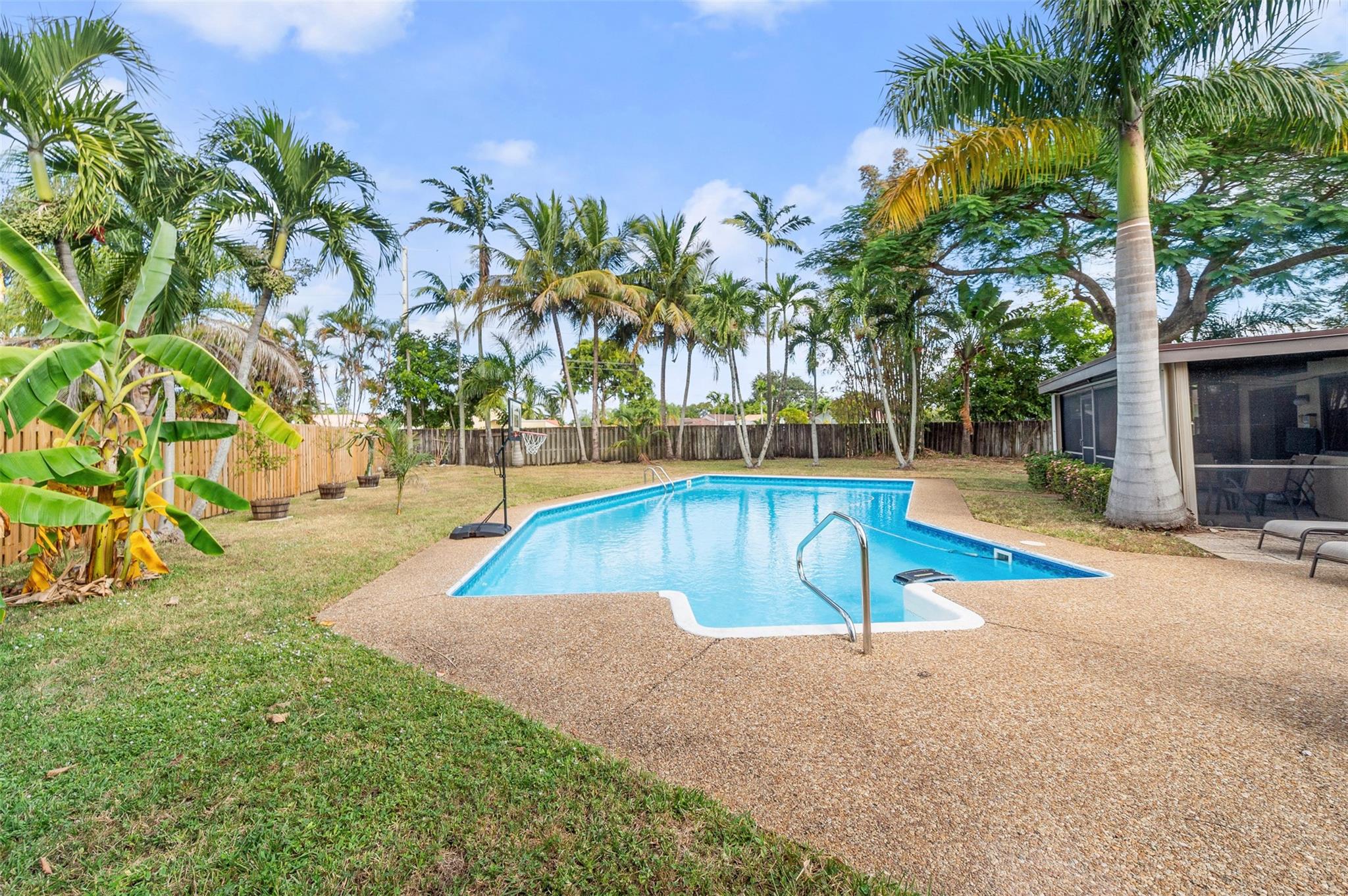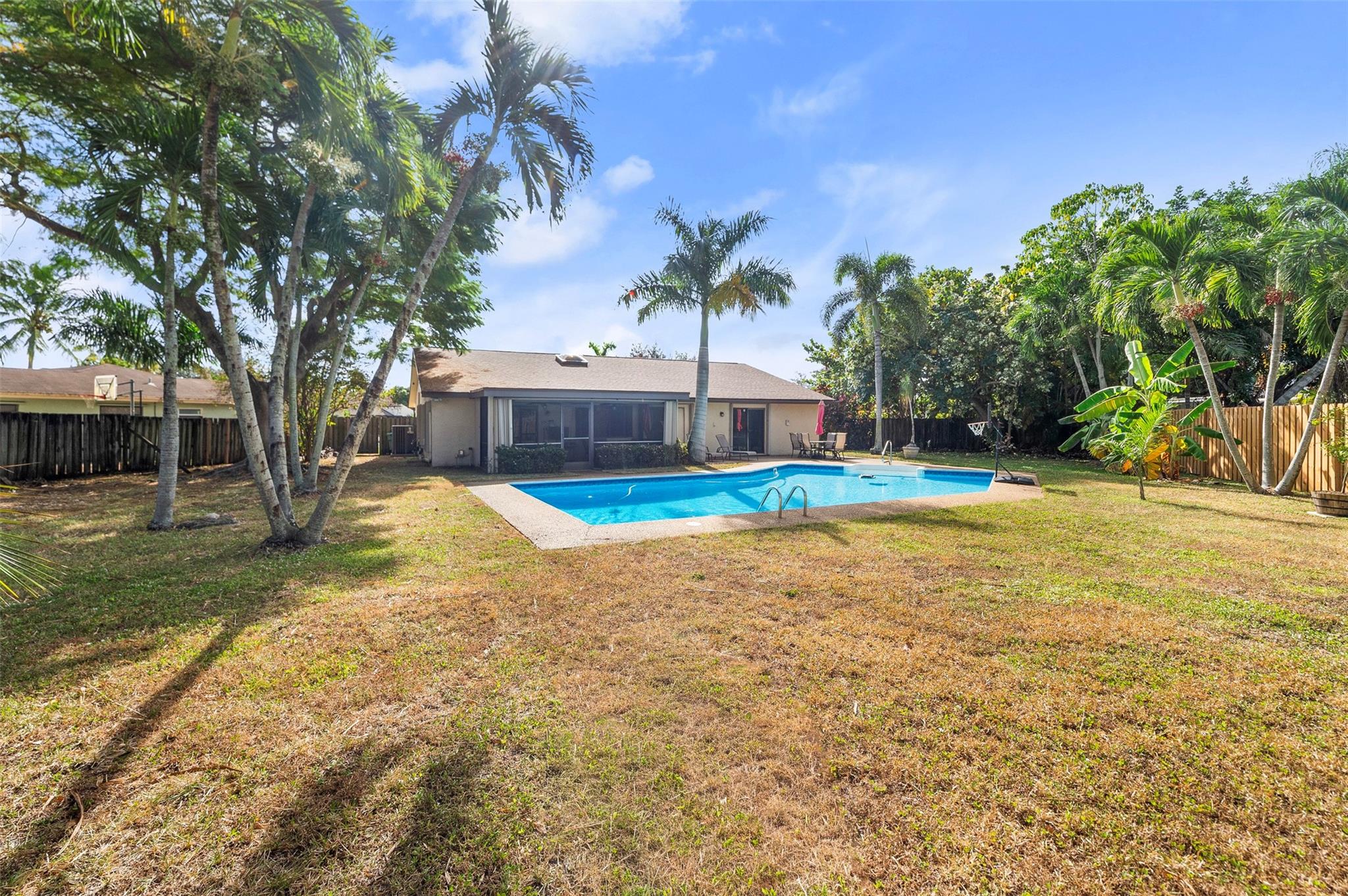 Must see! Incredible 3-br, 2-ba one-story pool home perfectly nestled on an oversized cul-de-sac lot with a fenced backyard and large pool. Beautiful vinyl flooring throughout and vaulted ceilings create a bright, spacious feel. The kitchen features granite countertops, wood cabinets, snack bar, SS appliances, and a cozy breakfast area that opens to the family room. Enjoy year-round outdoor living with a screened patio and large open pool area designed for gatherings. Additional upgrades include accordion storm shutters on all windows, doors, AND the screened patio, a NEW ROOF (Nov 2024), and a hurricane-rated garage door on the 2-car garage. Located in a quiet, desirable community minutes from shopping, dining, the Sawgrass Expressway, I-595, and FLL Airport. This home truly has it all.