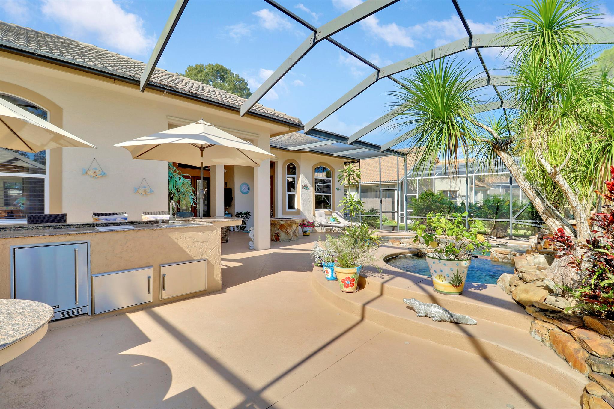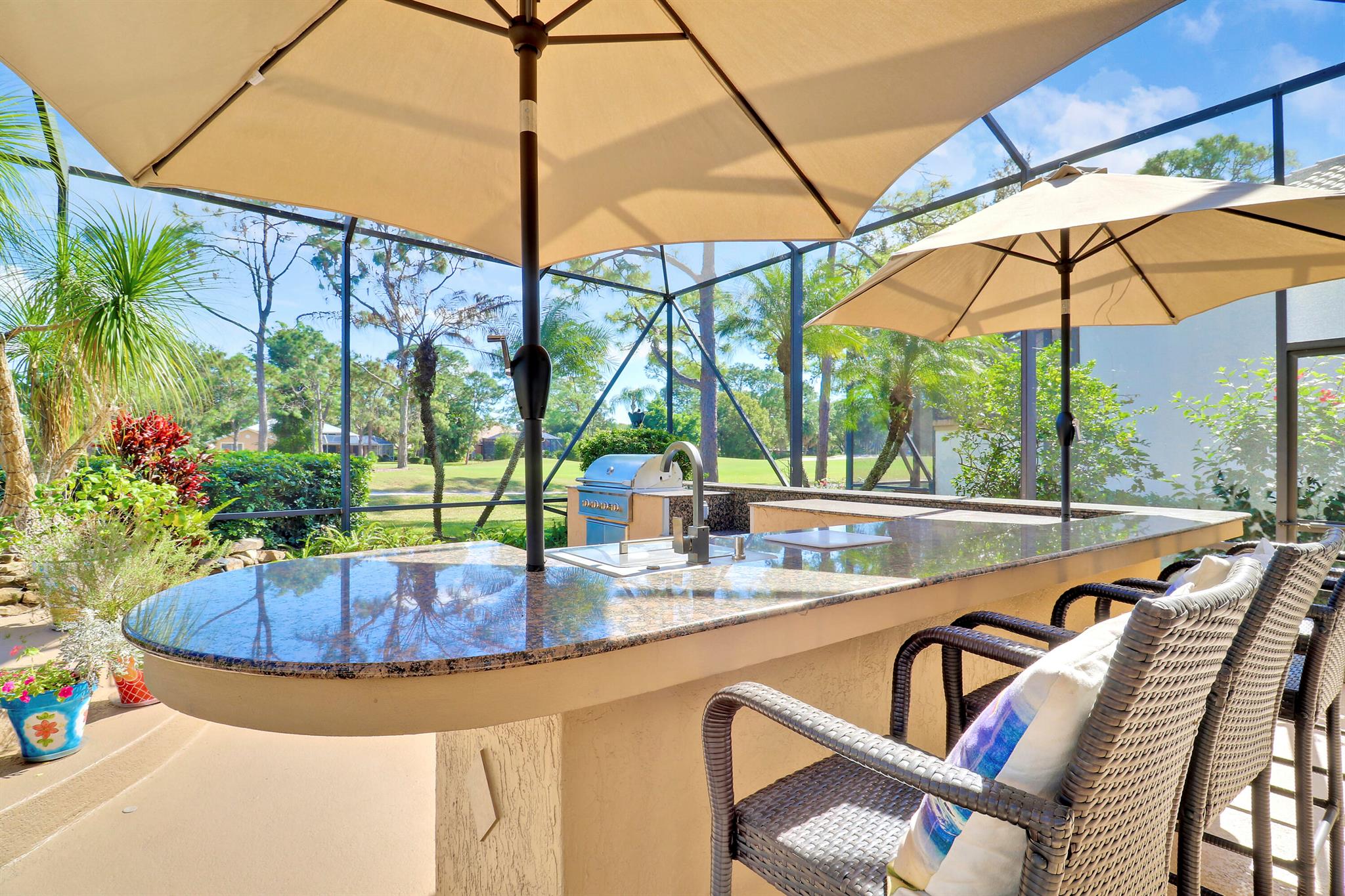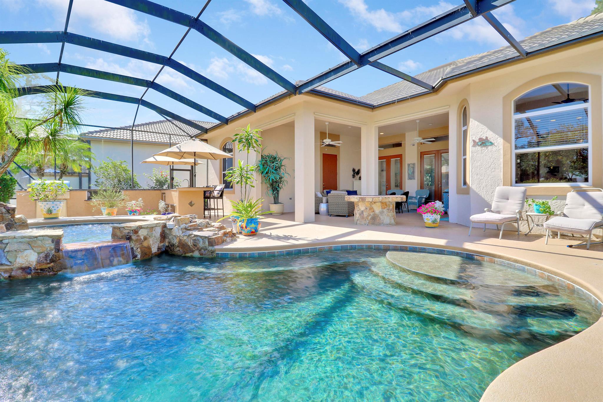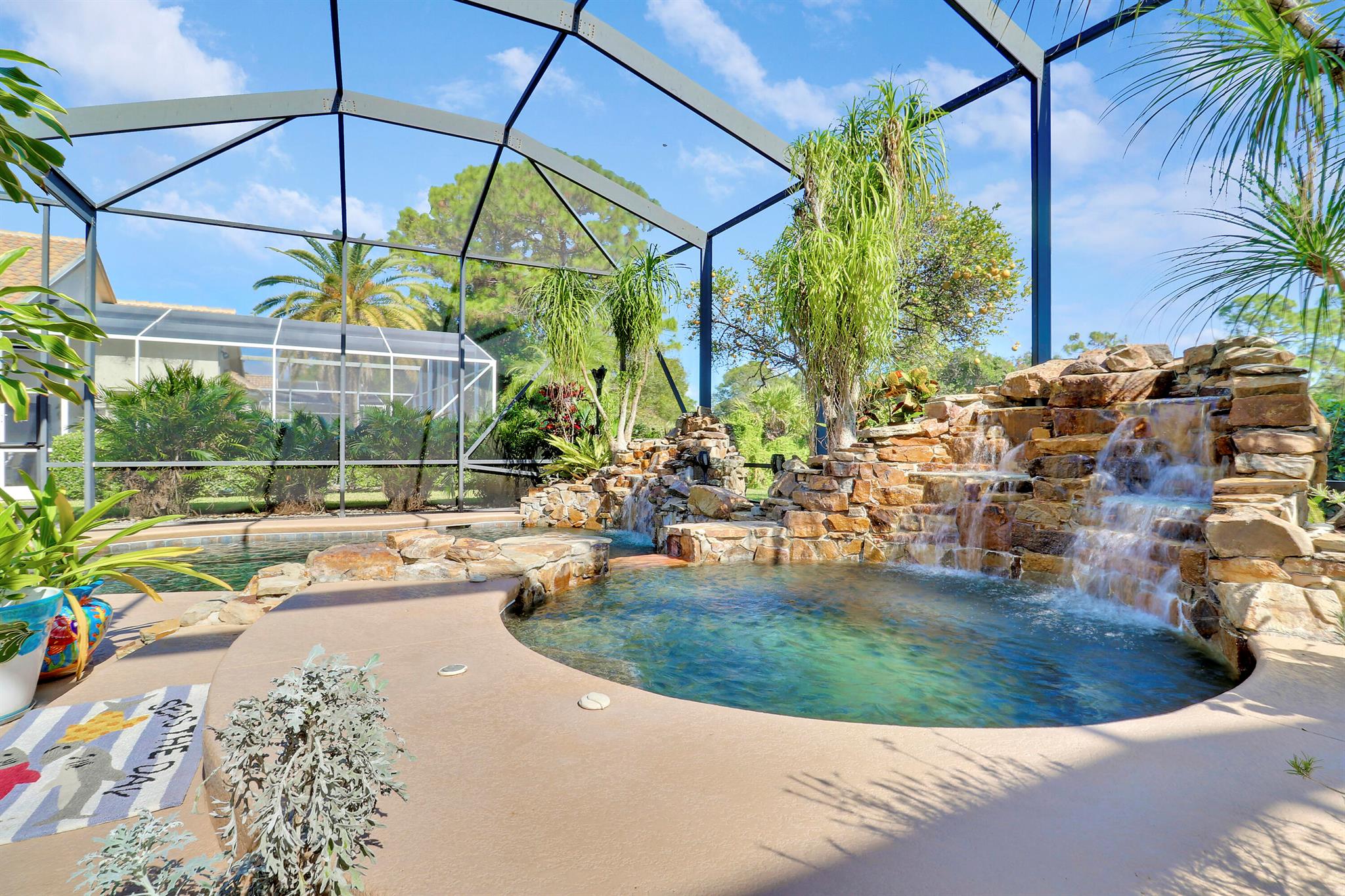 BEAUTIFUL GOLF VIEWS FROM THIS 4BR/2.5BA/2CG POOL HOME LOCATED IN THE DESIRABLE COMMUNITY OF PGA VILLAGE! This home features IMPACT GLASS WINDOWS & DOORS, tall ceilings, neutral paint, living area with wall unit and solid surface flooring t/o. Kitchen with cherry medallion cabinetry, granite counters and SS appliances including WALL OVEN & GAS COOKTOP. The primary suite has a spacious sitting area and luxurious ensuite with dual vanities, walk-in shower and soaker tub. Two guest bedrooms share a jack and jill bathroom. The 4th bedroom, currently used as a den, has a custom built in unit. Newer AC was installed in 2020. The outdoor space of this home is a dream - your very own TROPICAL OASIS with PRIVATE HEATED POOL & SPA WITH ROCK WATERFALL FEATURES, outdoor bar and covered patio space.
