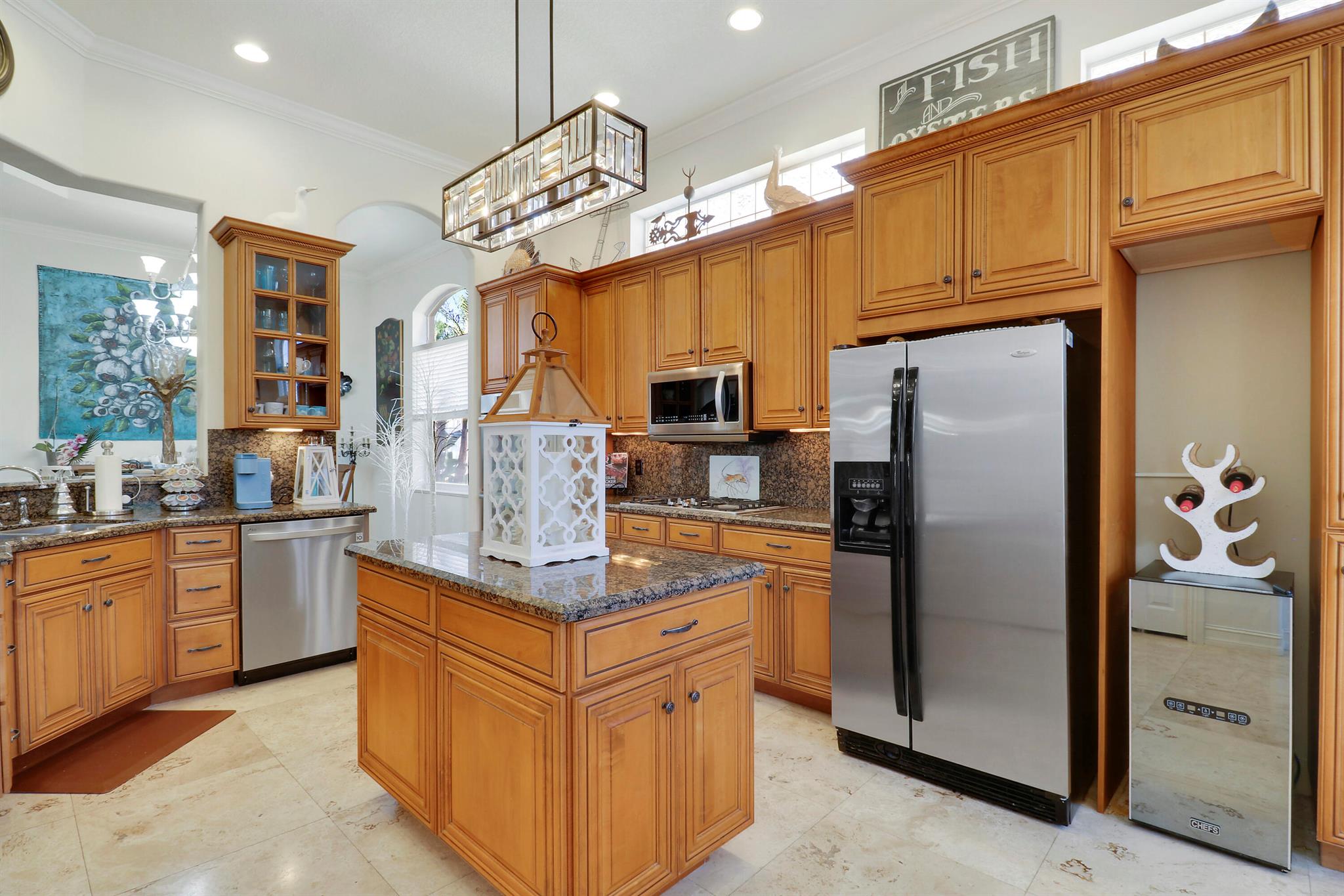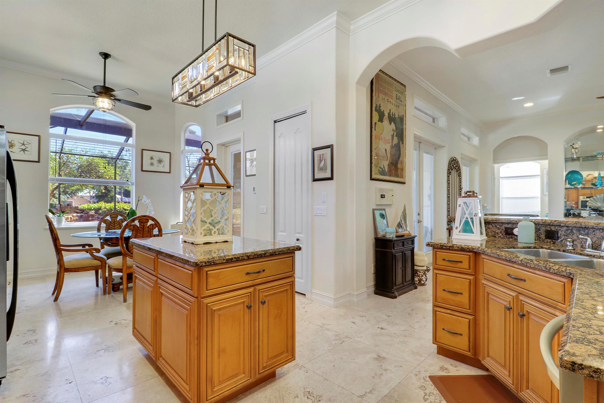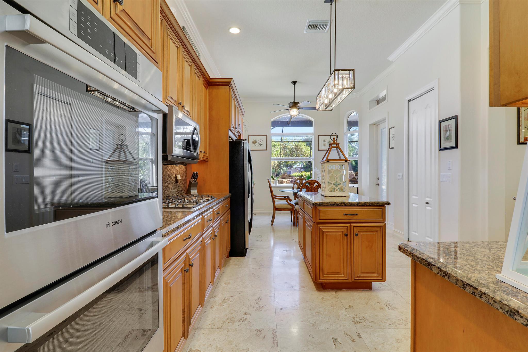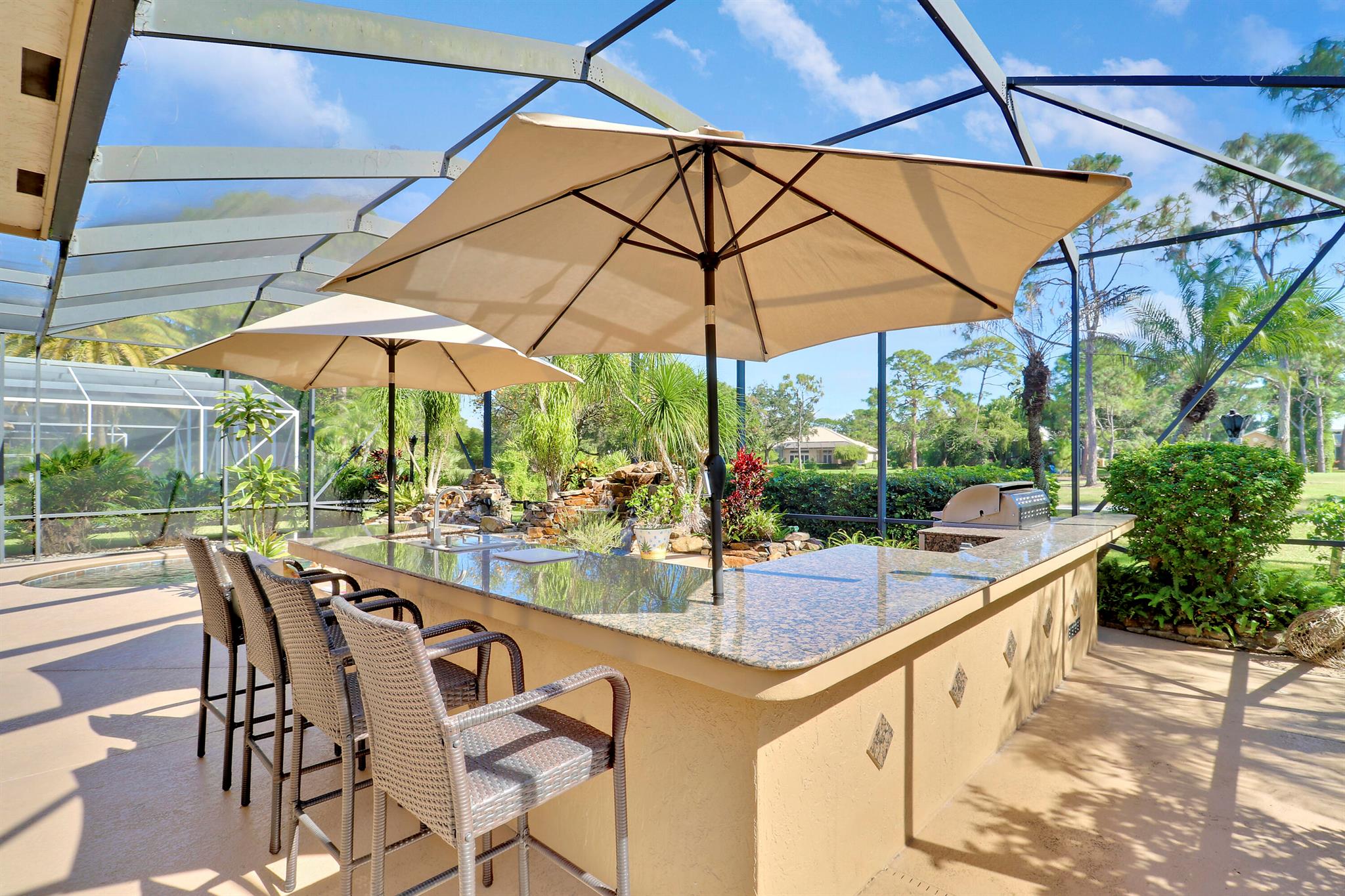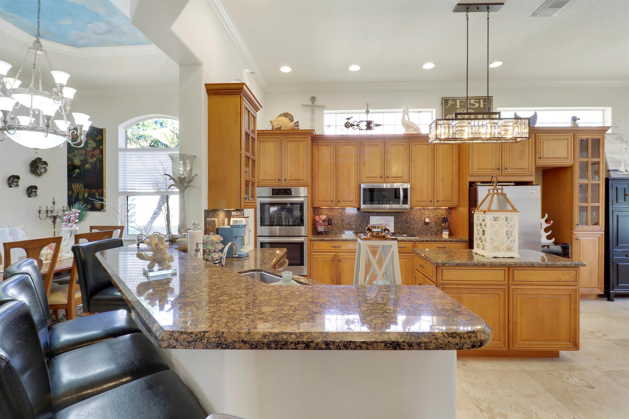 BEAUTIFUL GOLF VIEWS FROM THIS 4BR/2.5BA/2CG POOL HOME LOCATED IN THE DESIRABLE COMMUNITY OF PGA VILLAGE! This home features IMPACT GLASS WINDOWS & DOORS, tall ceilings, neutral paint, living area with wall unit and solid surface flooring t/o. Kitchen with cherry medallion cabinetry, granite counters and SS appliances including WALL OVEN & GAS COOKTOP. The primary suite has a spacious sitting area and luxurious ensuite with dual vanities, walk-in shower and soaker tub. Two guest bedrooms share a jack and jill bathroom. The 4th bedroom, currently used as a den, has a custom built in unit. Newer AC was installed in 2020. The outdoor space of this home is a dream - your very own TROPICAL OASIS with PRIVATE HEATED POOL & SPA WITH ROCK WATERFALL FEATURES, outdoor bar and covered patio space.
