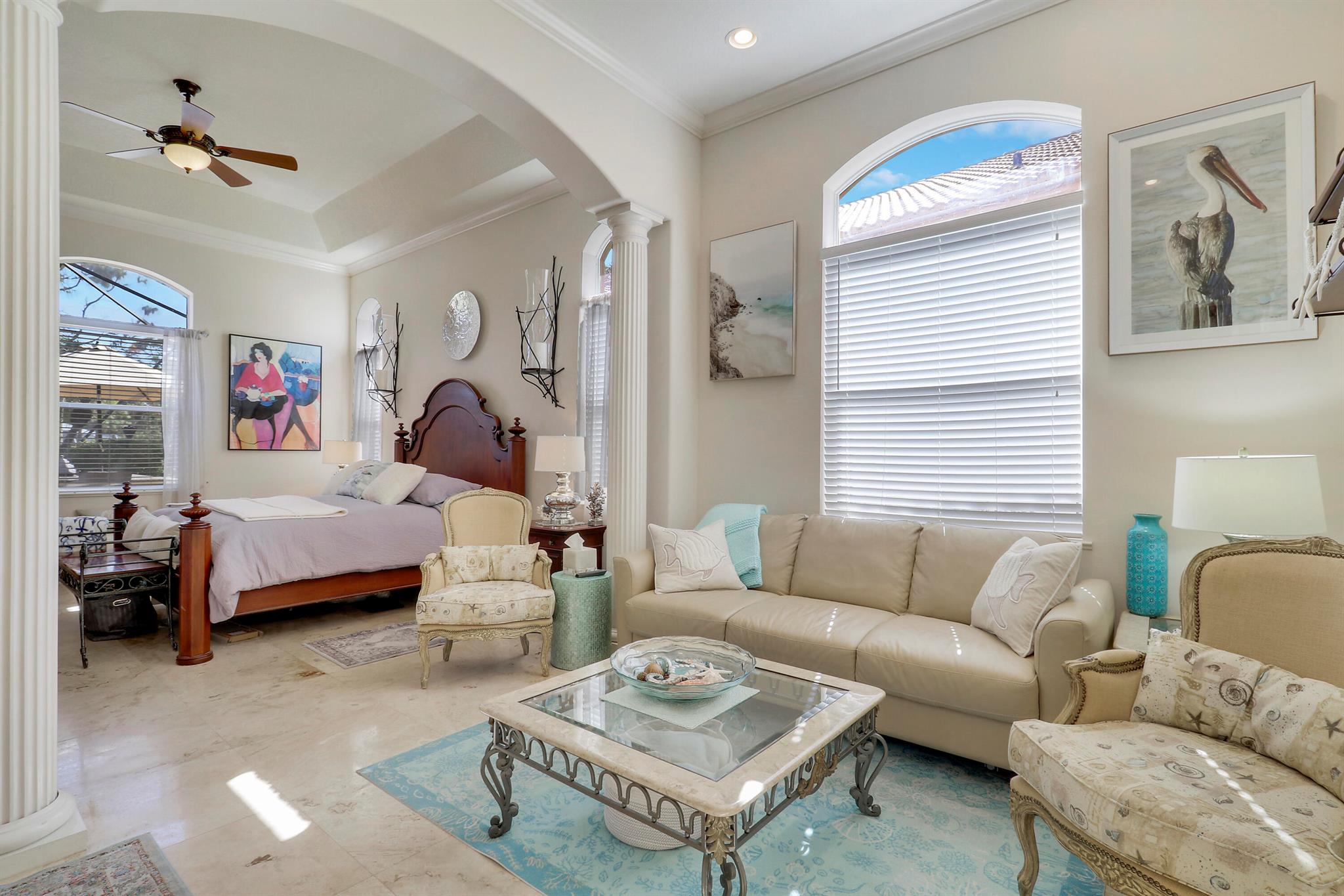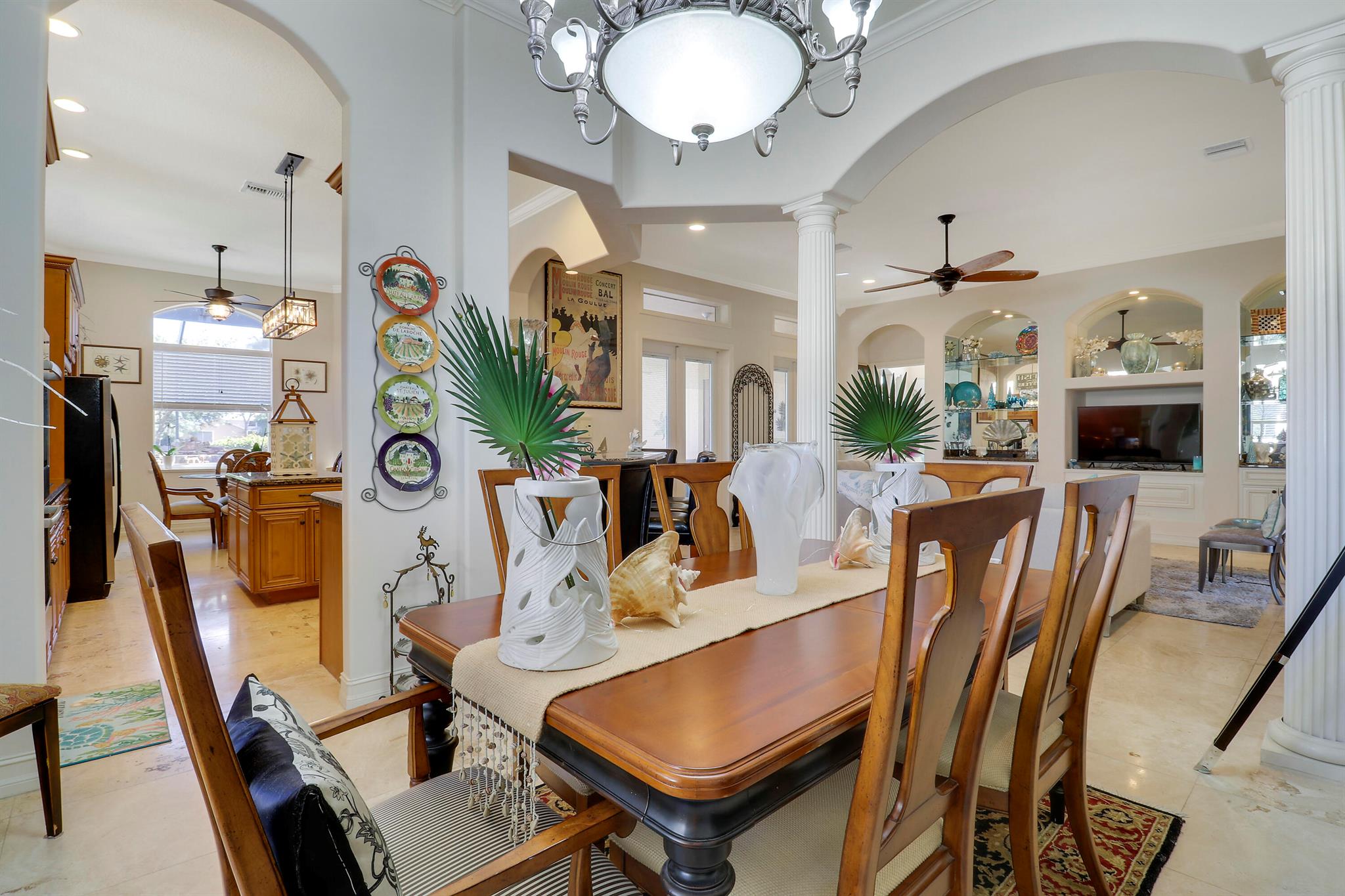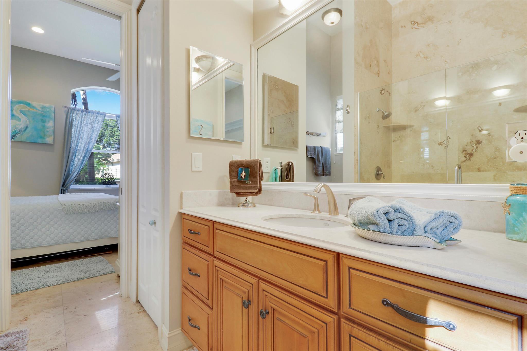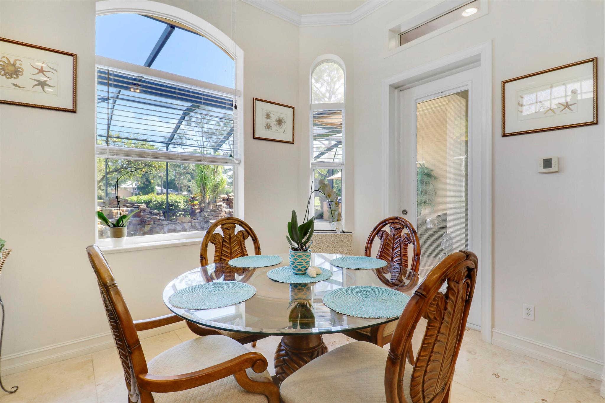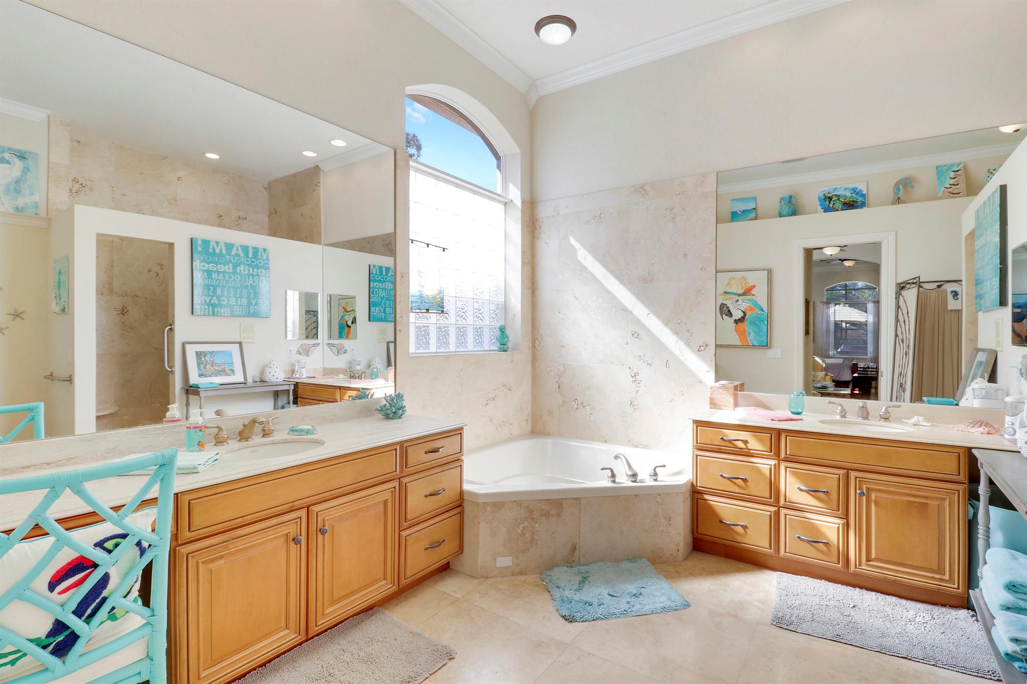 BEAUTIFUL GOLF VIEWS FROM THIS 4BR/2.5BA/2CG POOL HOME LOCATED IN THE DESIRABLE COMMUNITY OF PGA VILLAGE! This home features IMPACT GLASS WINDOWS & DOORS, tall ceilings, neutral paint, living area with wall unit and solid surface flooring t/o. Kitchen with cherry medallion cabinetry, granite counters and SS appliances including WALL OVEN & GAS COOKTOP. The primary suite has a spacious sitting area and luxurious ensuite with dual vanities, walk-in shower and soaker tub. Two guest bedrooms share a jack and jill bathroom. The 4th bedroom, currently used as a den, has a custom built in unit. Newer AC was installed in 2020. The outdoor space of this home is a dream - your very own TROPICAL OASIS with PRIVATE HEATED POOL & SPA WITH ROCK WATERFALL FEATURES, outdoor bar and covered patio space.