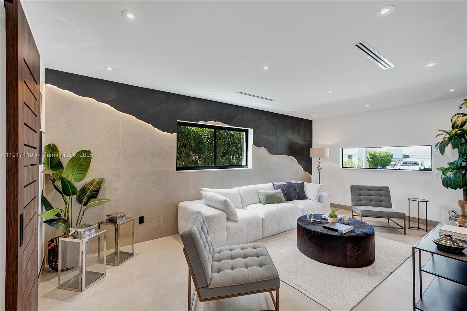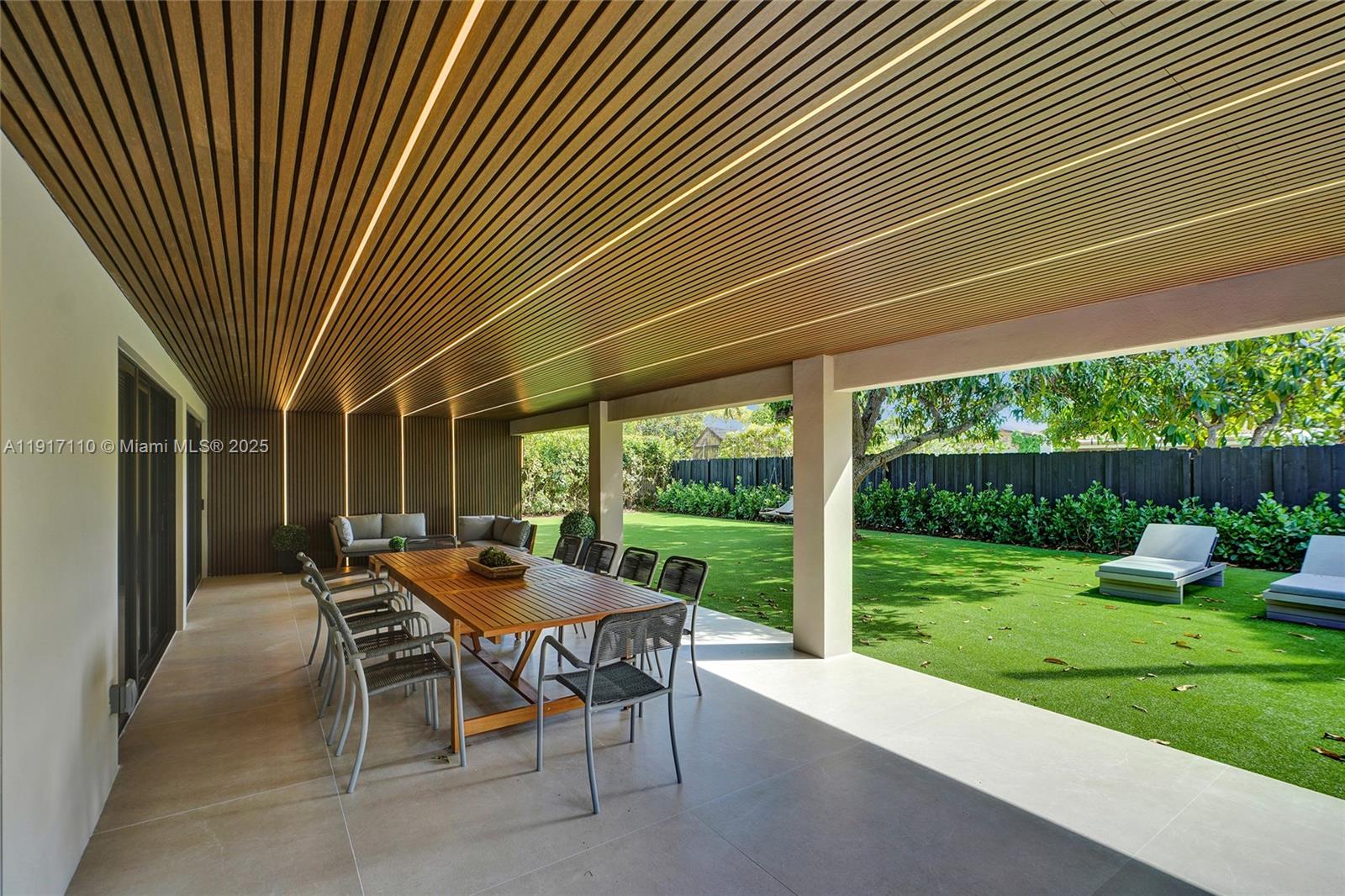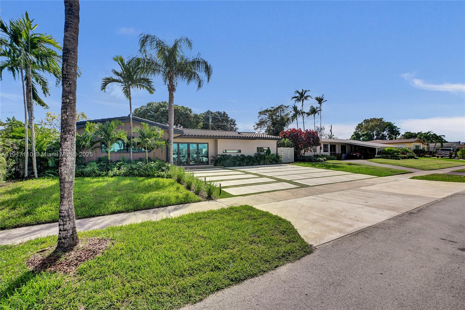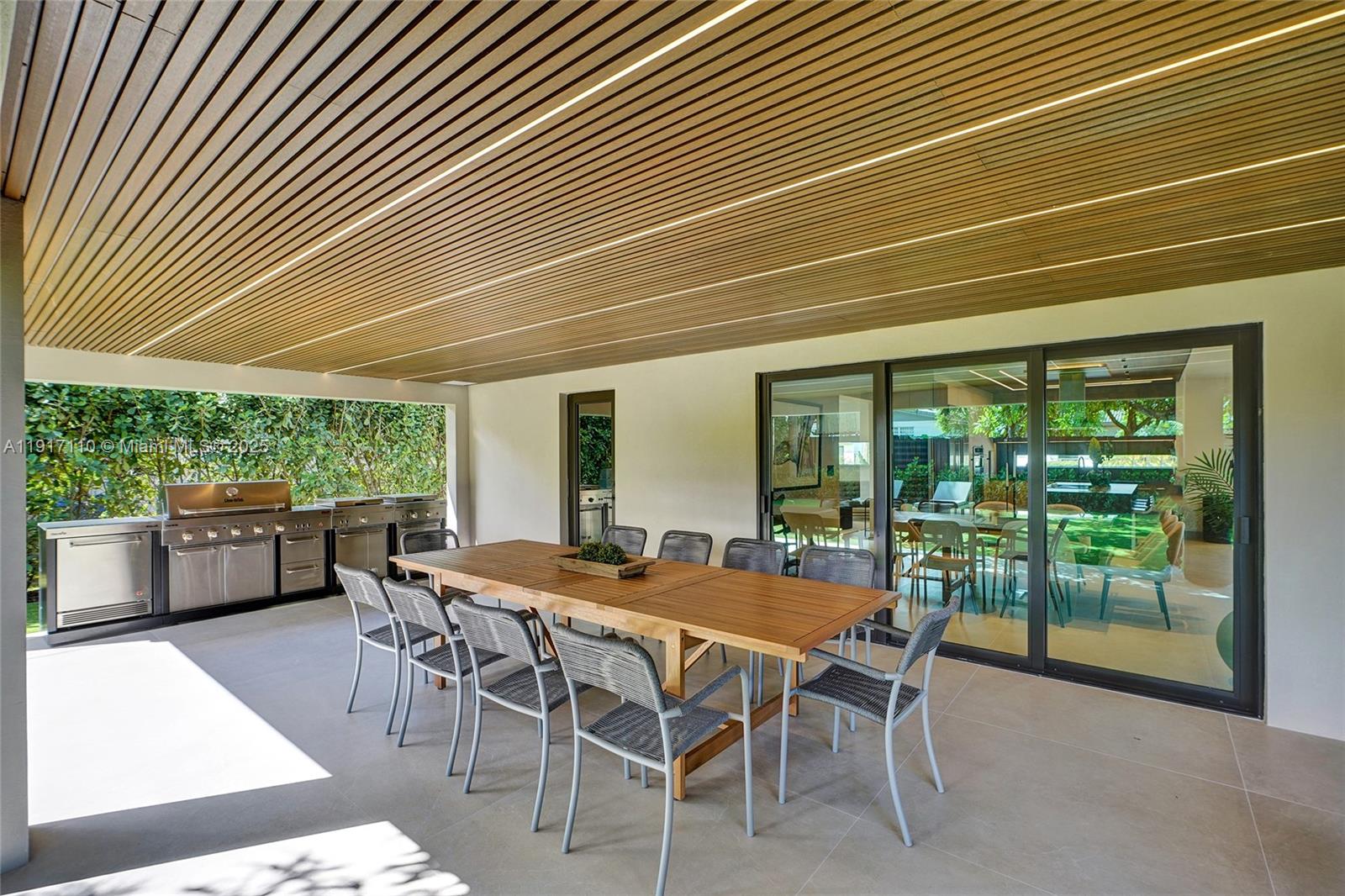 Stunning, fully remodeled modern home featuring clean architectural lines, warm natural tones, and top-quality finishes throughout. The open-concept layout highlights a sleek Italian-style kitchen with custom wood cabinetry, quartz countertops, and top-of-the-line appliances, including stainless steel appliances. This elegant residence features impact-resistant windows and doors, Italian-built-in closets, large porcelain floors, high ceilings, and designer LED lighting. The spacious living and dining areas are surrounded by glass sliders that fill the home with natural light and create a perfect indoor-outdoor flow. The outdoor space is designed for entertaining, featuring a built-in BBQ, artificial grass, and beautifully landscaped gardens. Every detail combines luxury and functionality
