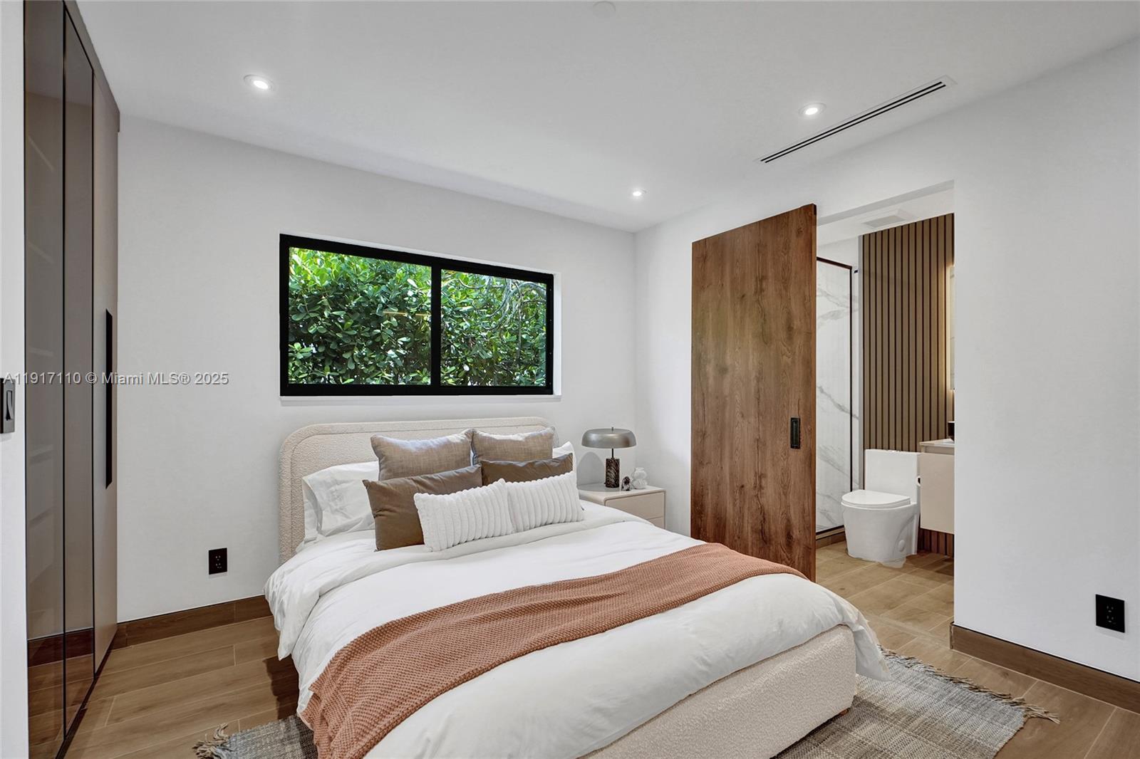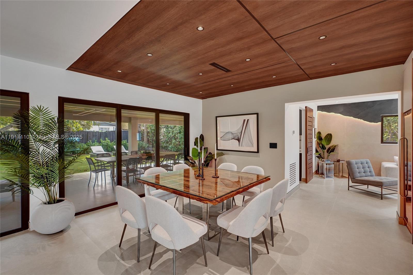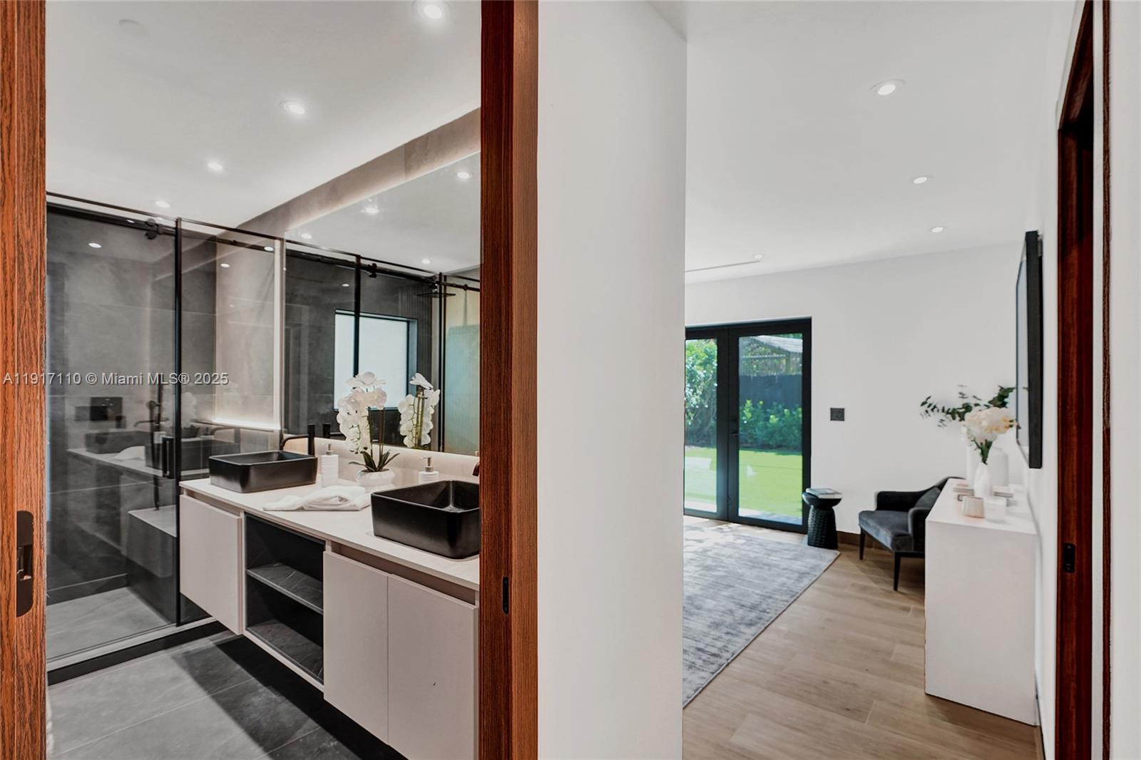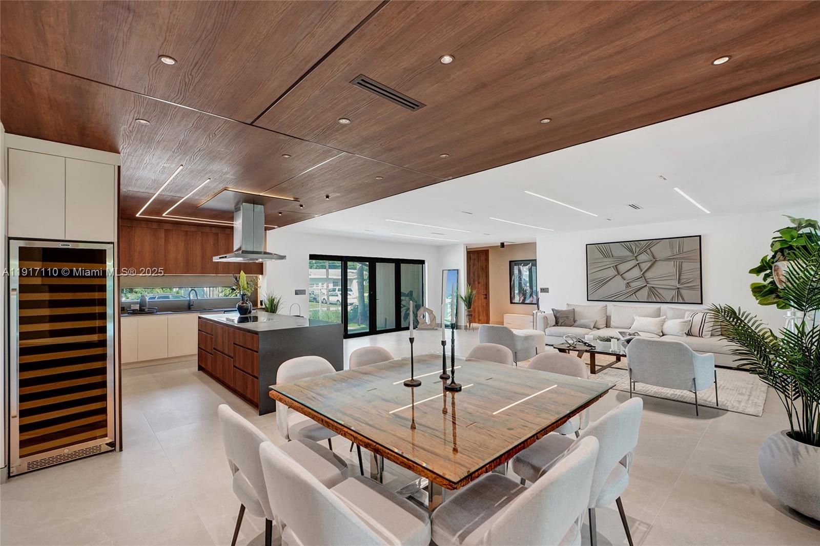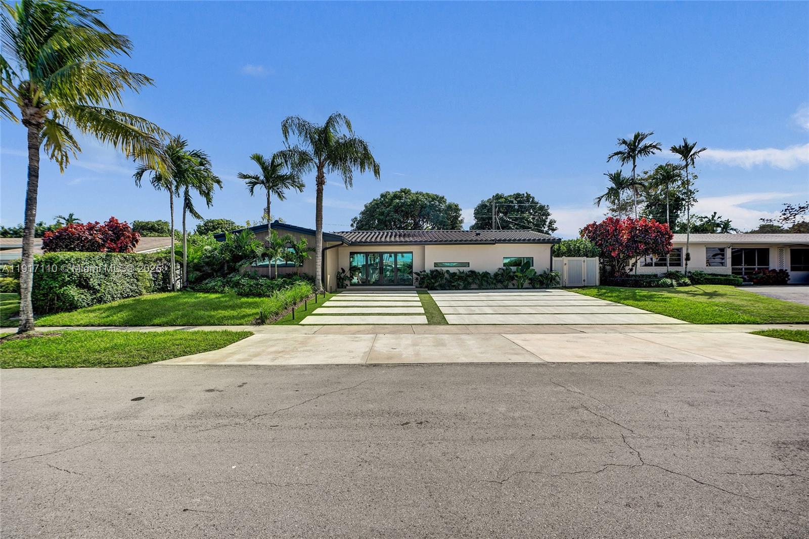 Stunning, fully remodeled modern home featuring clean architectural lines, warm natural tones, and top-quality finishes throughout. The open-concept layout highlights a sleek Italian-style kitchen with custom wood cabinetry, quartz countertops, and top-of-the-line appliances, including stainless steel appliances. This elegant residence features impact-resistant windows and doors, Italian-built-in closets, large porcelain floors, high ceilings, and designer LED lighting. The spacious living and dining areas are surrounded by glass sliders that fill the home with natural light and create a perfect indoor-outdoor flow. The outdoor space is designed for entertaining, featuring a built-in BBQ, artificial grass, and beautifully landscaped gardens. Every detail combines luxury and functionality