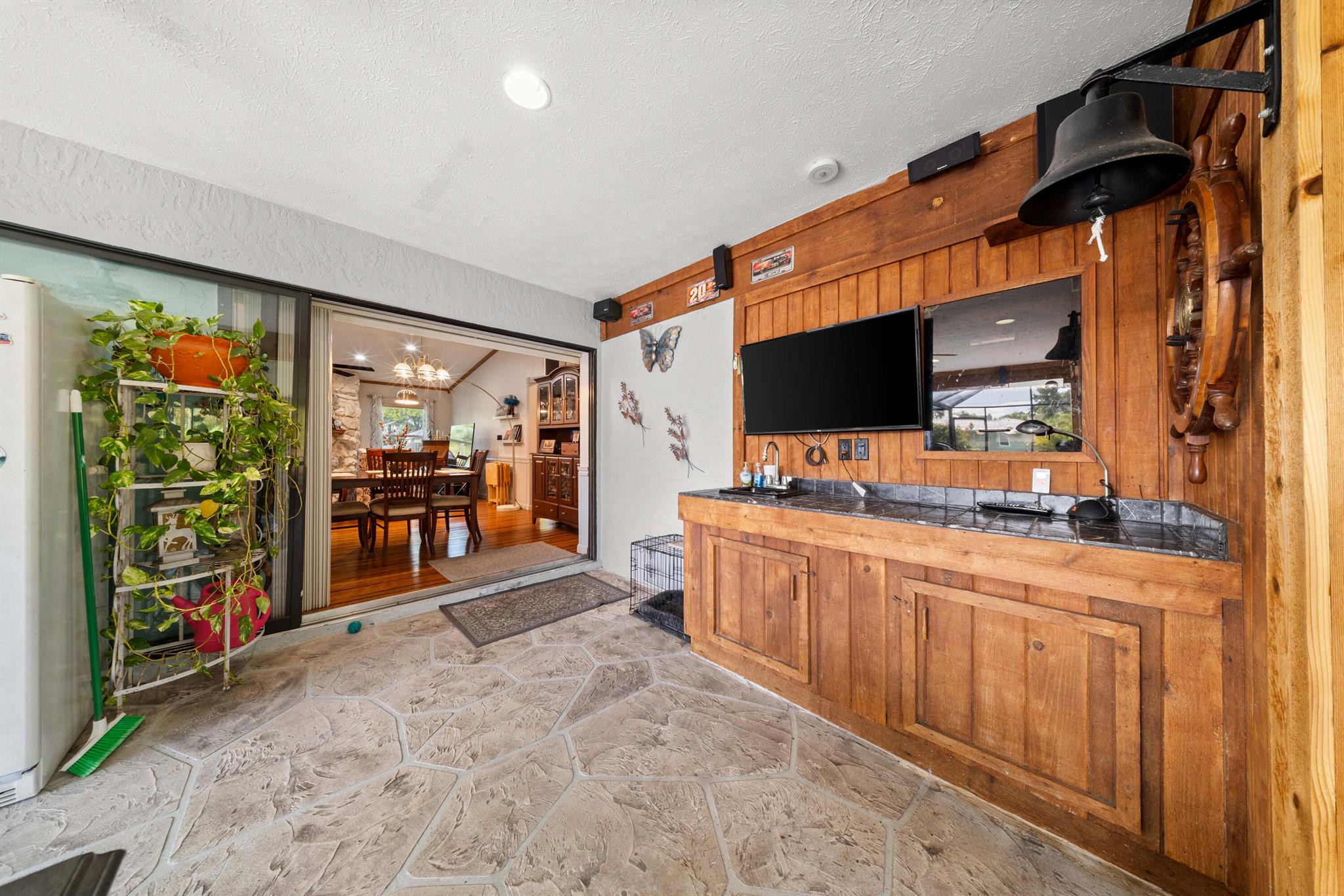 Rare double-lot estate offering luxury finishes, exceptional privacy, & true indoor-outdoor living. This home features a METAL ROOF, stunning strand bamboo/slate tile floors, wood cabinets/crown molding, & a beautiful stone wood-burning fireplace that adds charm throughout. The outdoor space is an Entertainer's dream with a large covered patio, Bose surround sound, hot tub & pool, young fruit trees (Barbados Cherry, Avocado, Mulberry, & Mango), and a spacious yard with a dedicated fenced area ideal for pets or play. A powered workshop shed offers the perfect space for hobbies or a home business. Homes with this level of land, craftsmanship, and entertainment potential are incredibly rare. Don't miss your chance to experience this one-of-a-kind property