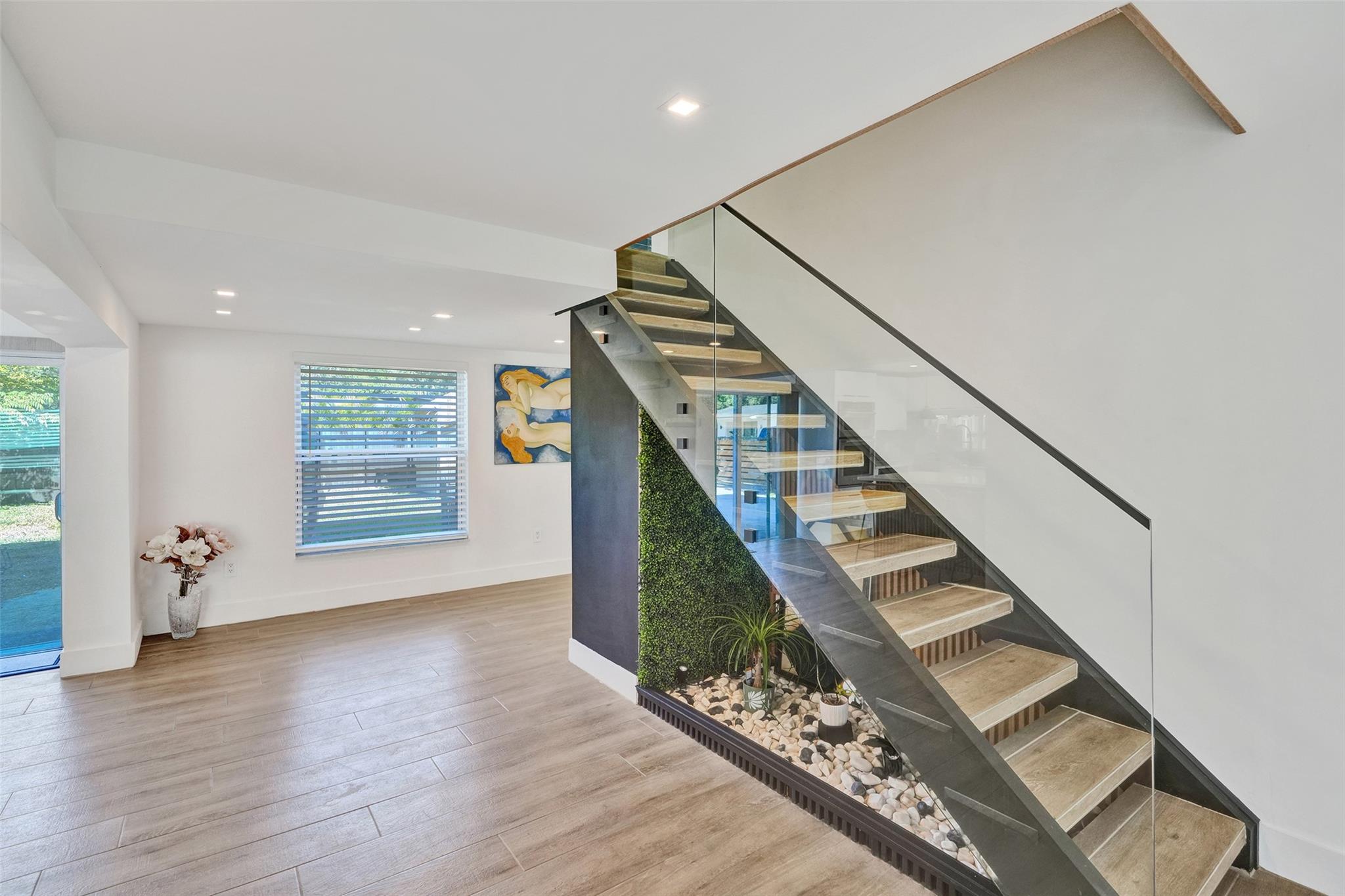 Luxuriously remodeled 3 bed/3 bath two-story residence in North Miami Beach. Located in unincorporated Miami-Dade with no HOA , ideal as an upscale primary home or high-end short-term rental. This corner property offers dual access and a prime location near major highways and walking distance to praying centers. Interior highlights include an elegant open kitchen with quartz counters and island, sleek tile flooring, impact windows and doors, newer AC and roof, and a striking glass staircase. The waterfall feature at the entrance enhances the home's modern appeal. The primary suite features a resort-style bath and spacious covered balcony with glass railing. Move-in ready luxury!