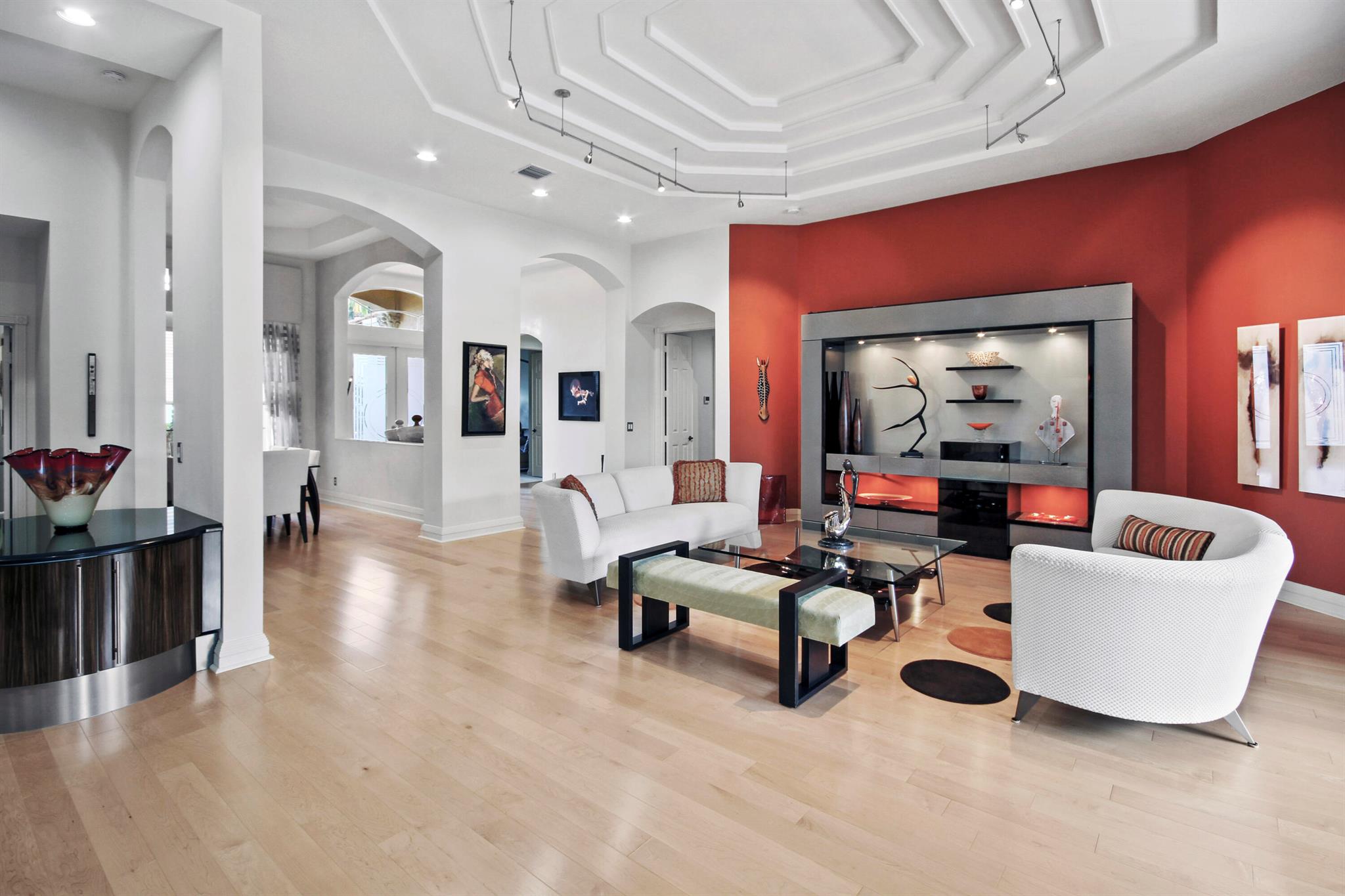 This Riviera model is a 3 bedroom, 2 1/2 bath home, which has been designed and decorated with the most elegant contemporary upgrades. It showcases like any current new community model home at a fraction of the cost. Upon visiting this home, you will see the expansive great room and kitchen open floor plan design, creating elegance and functionality. The new and rich looking hardwood flooring is located throughout most of the home. The primary suite and third bedroom features new plush carpeting. Beautiful wall decor, lighting and window treatments add to the elegance and feel of the home. The exterior patio area has been upgraded with wood ceilings, spacious stone flooring, phantom screening, contemporary fountains and upgraded landscaping with two beautiful canary palm