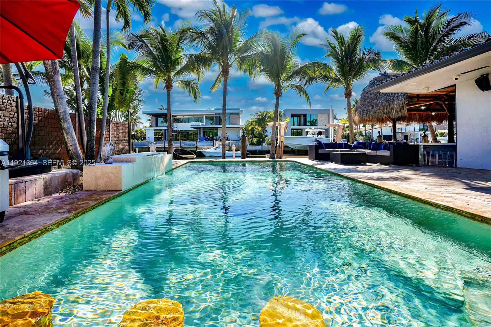 Just reduced. Best priced waterfront home in the area! A Boater’s Dream in Prestigious Sans Souci Estates! This spectacular contemporary deep-waterfront residence has been fully renovated and is truly move-in ready. Located just minutes from Haulover Inlet, the Miami sandbar, Biscayne Bay, and the ocean, this home offers 75 feet of prime waterfront with an upgraded dock, seawall, and multiple boatlifts. Step inside to discover a bright, open floor plan adorned with marble/travertine stone floors, striking accent walls, European-style kitchen cabinetry, and stainless-steel appliances. The home features sophisticated bathroom designs, impact windows and doors, and recessed lighting. Upgrades include a brand-new roof, new AC system, fiber-optic connectivity, and a 12-camera security system with Ring components. A 2-car garage with built-in storage adds convenience and functionality. Electric and piping fully updated. The outdoor experience is truly exceptional. Enjoy an expansive pool and patio area with a tranquil waterfall installation, a brand-new covered Jacuzzi, and a chef-designed outdoor kitchen with premium stainless-steel appliances beneath a tropical tiki. Resort-style backyard ambiance—perfect for entertaining or unwinding in total comfort. Ideally situated just minutes from Bal Harbour Shops, world-class beaches, Aventura, the Miami Design District, Wynwood, top schools, and both Miami and Fort Lauderdale airports— a central location to everything Miami has to offer.