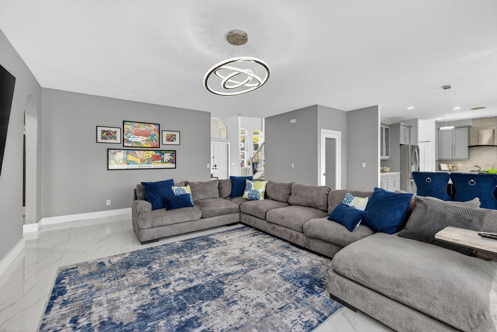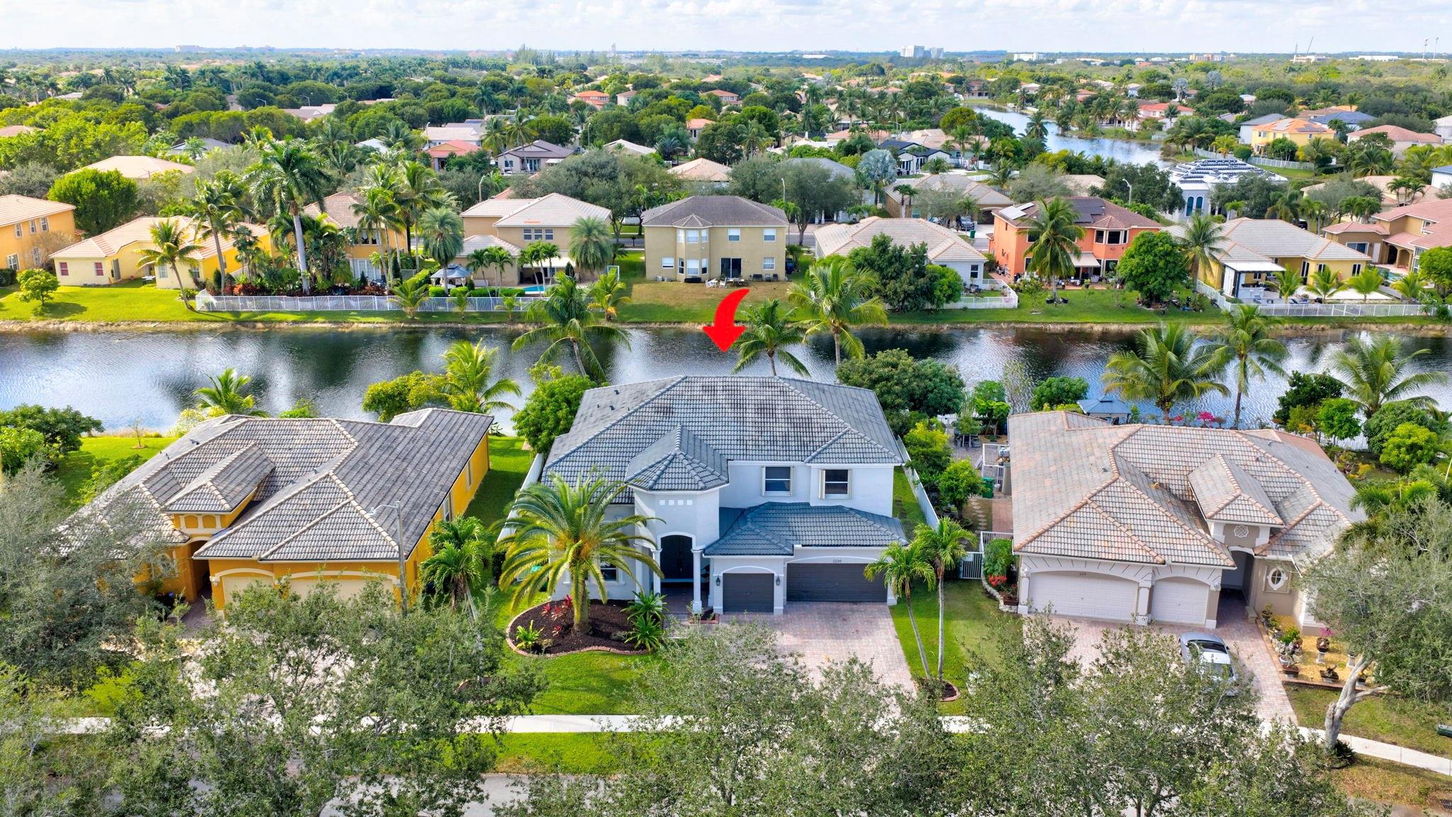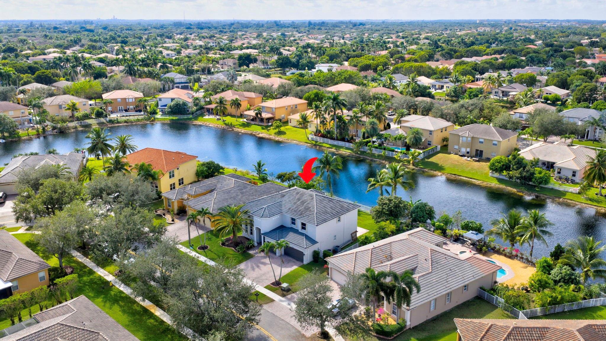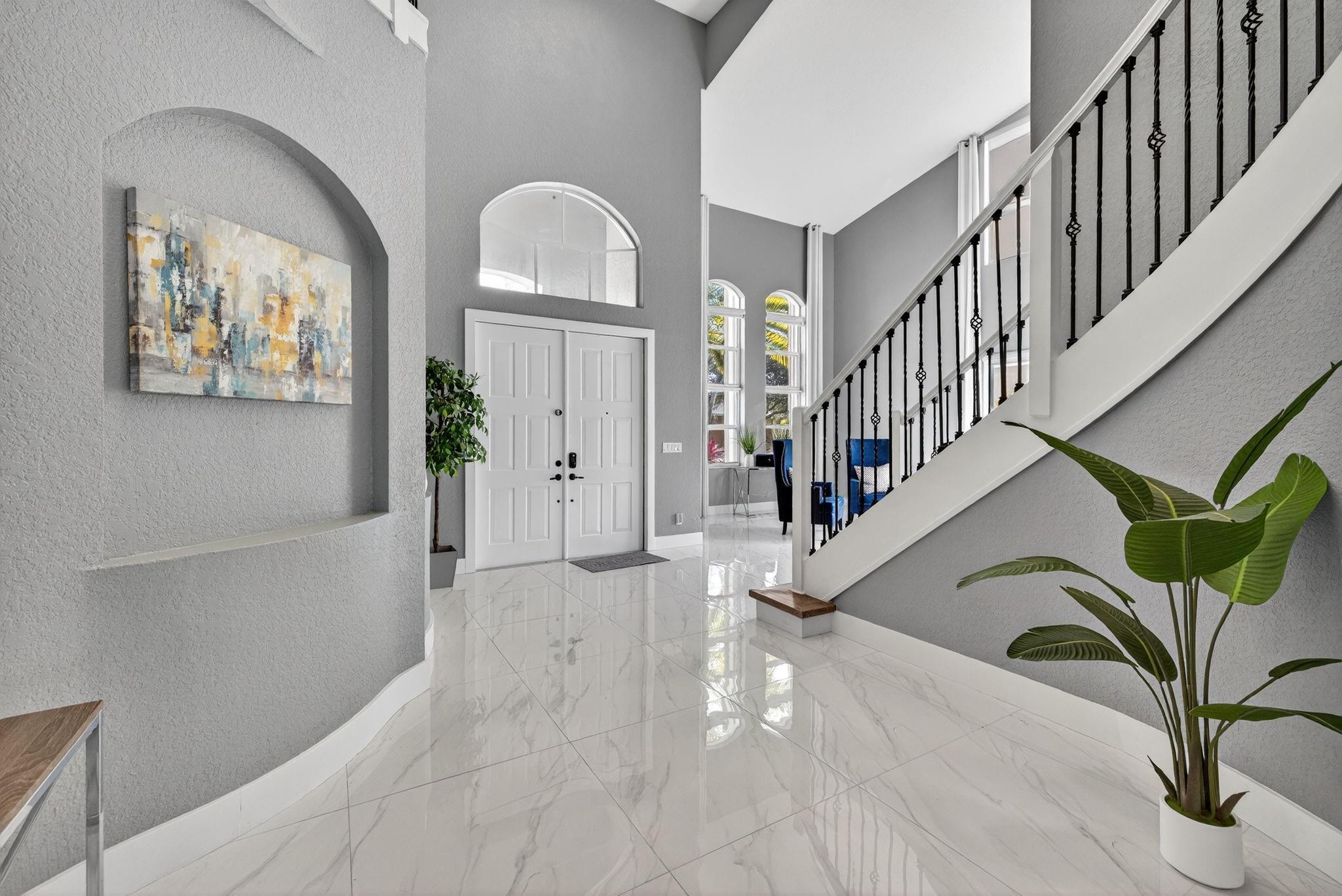 Beautifully updated 5 BD, 3 BA lakefront home with a spacious layout and a convenient bedroom & bathroom on the 1st floor. Gorgeous remodeled kitchen has quartz counters, SS appliances, shaker cabinets & a big island that flows into a huge family room perfect for entertaining. Spacious primary suite offers a sitting area, closet cabinetry, a spa-inspired bathroom with a freestanding tub, frameless shower, dual vanities & modern finishes. Upstairs, you'll find a versatile loft that works beautifully as a den, office, playroom, or study area. Upgrades include renovated bathrooms, new tile & LVP flooring, modern lighting, 2 newer AC's & accordion shutters. Low HOA fees $166 incl: community pool, gym, tennis, basketball, playground & park. Monarch Lakes provides access to top tier schools.