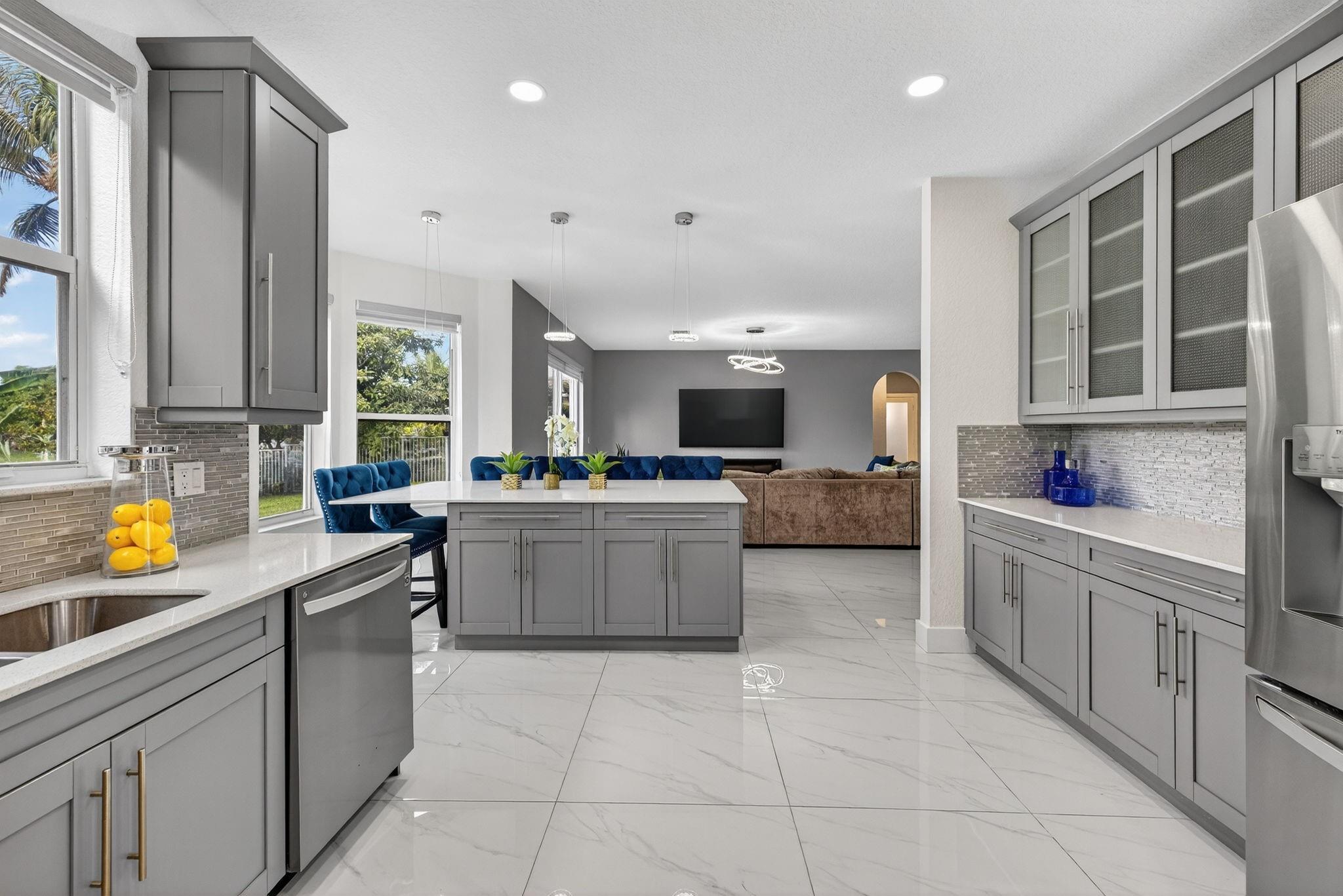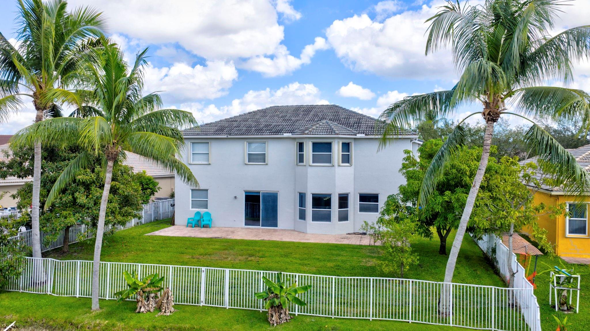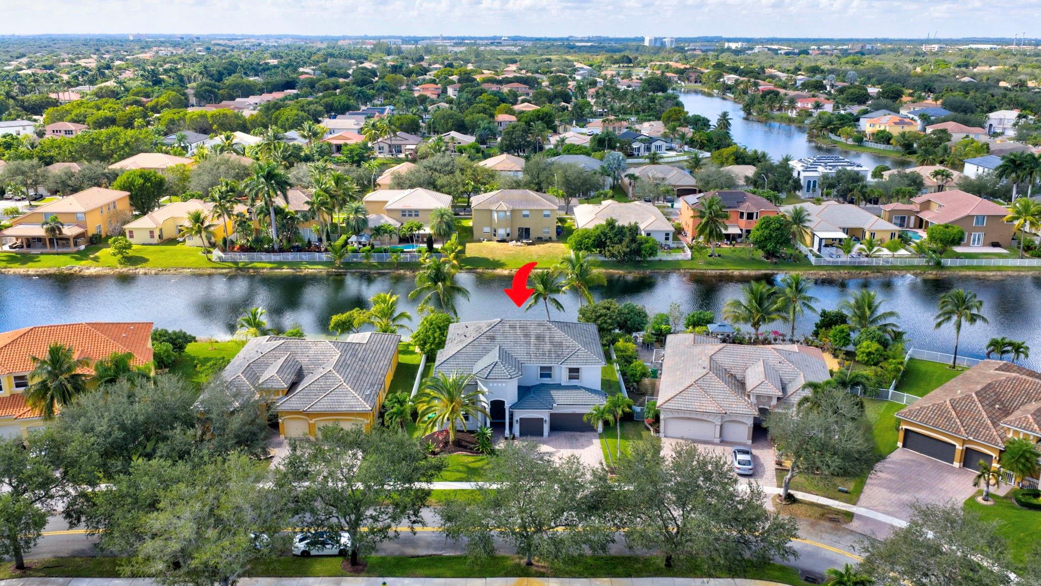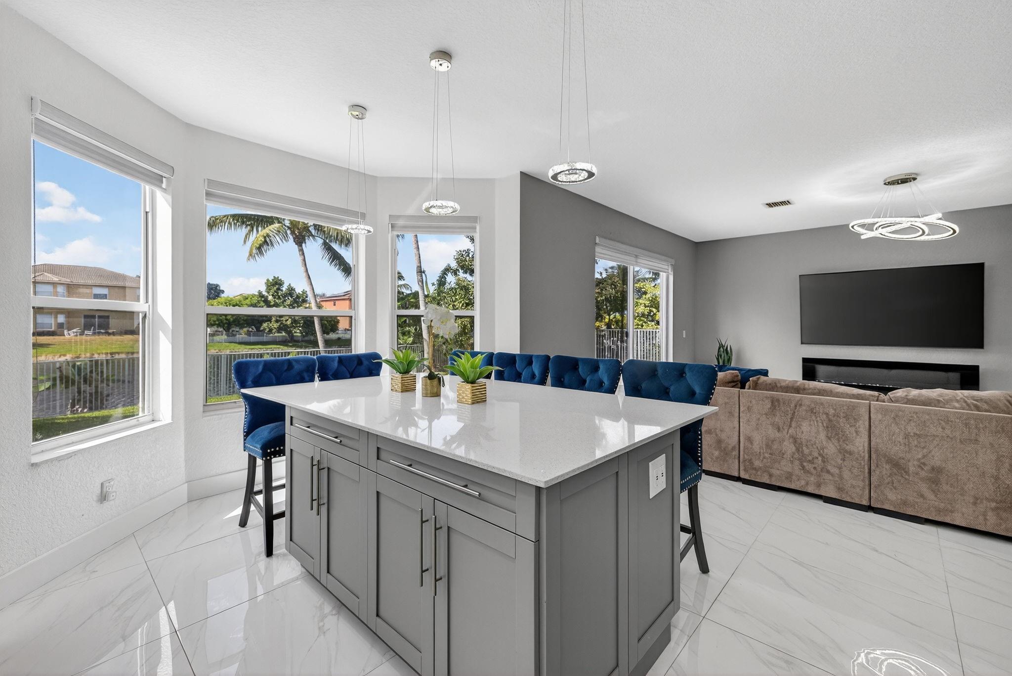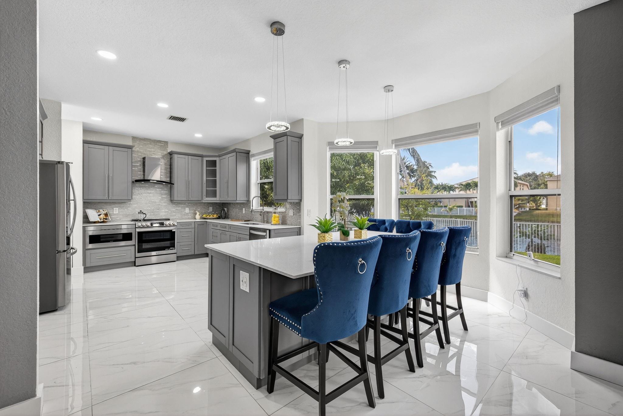 Beautifully updated 5 BD, 3 BA lakefront home with a spacious layout and a convenient bedroom & bathroom on the 1st floor. Gorgeous remodeled kitchen has quartz counters, SS appliances, shaker cabinets & a big island that flows into a huge family room perfect for entertaining. Spacious primary suite offers a sitting area, closet cabinetry, a spa-inspired bathroom with a freestanding tub, frameless shower, dual vanities & modern finishes. Upstairs, you'll find a versatile loft that works beautifully as a den, office, playroom, or study area. Upgrades include renovated bathrooms, new tile & LVP flooring, modern lighting, 2 newer AC's & accordion shutters. Low HOA fees $166 incl: community pool, gym, tennis, basketball, playground & park. Monarch Lakes provides access to top tier schools.