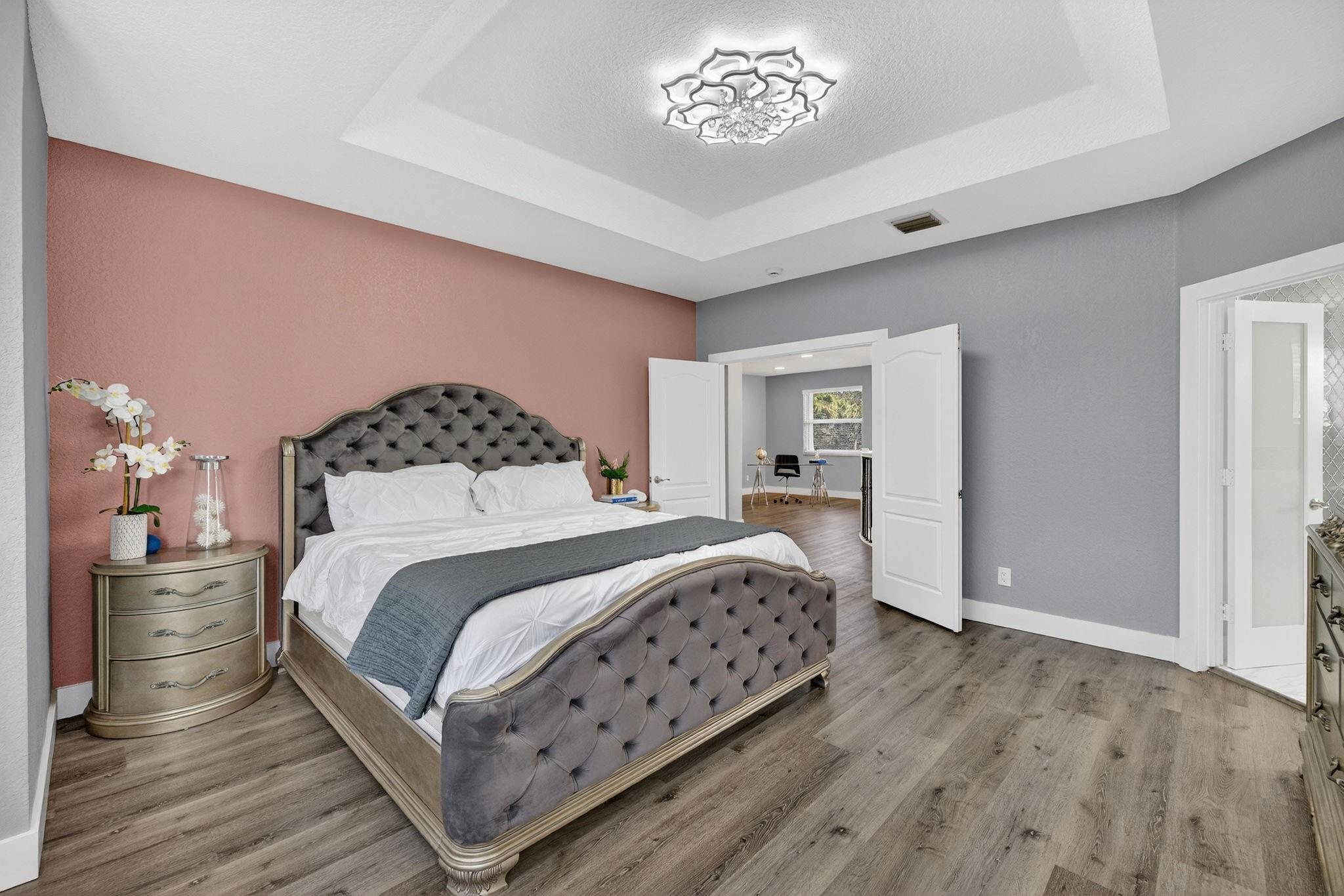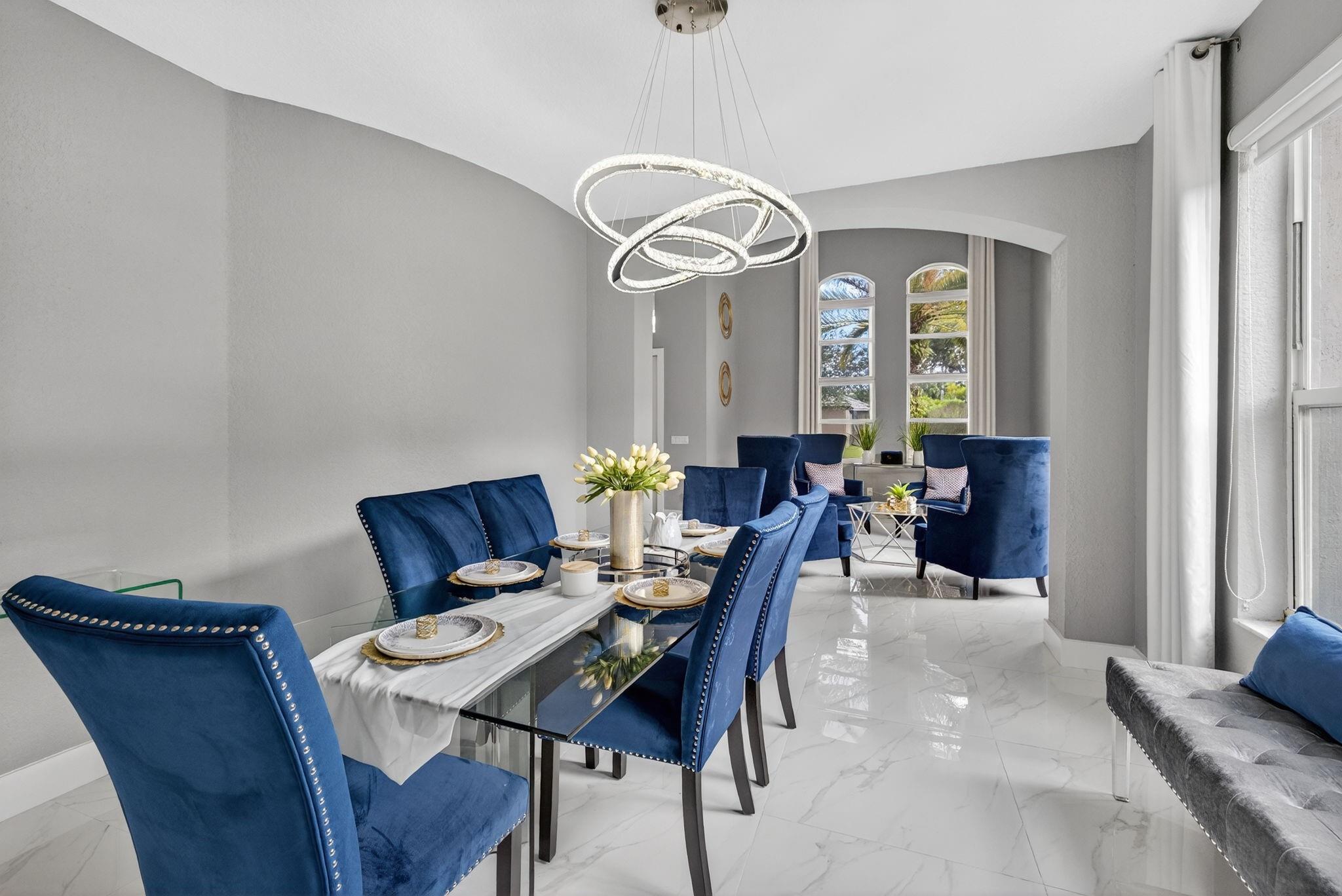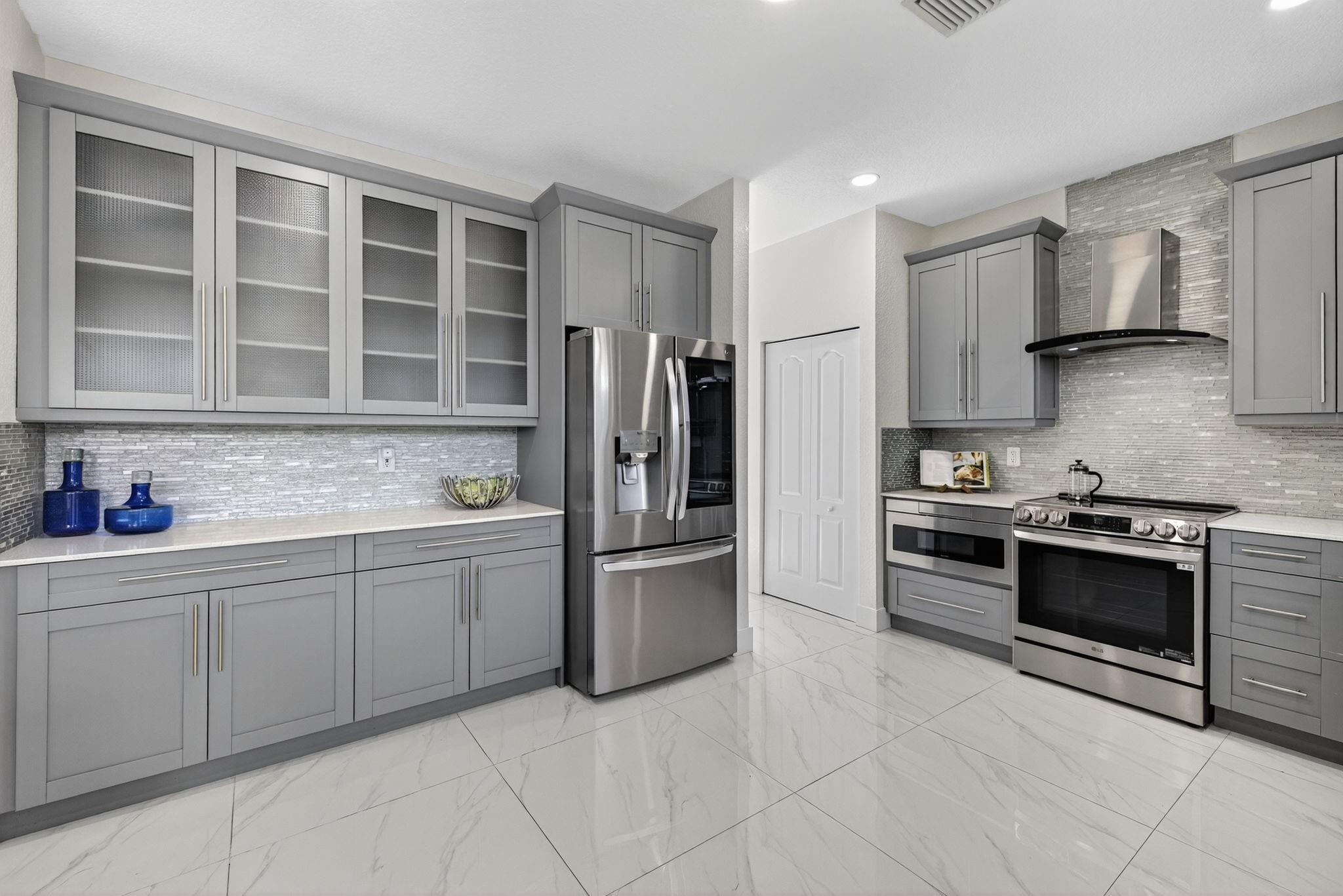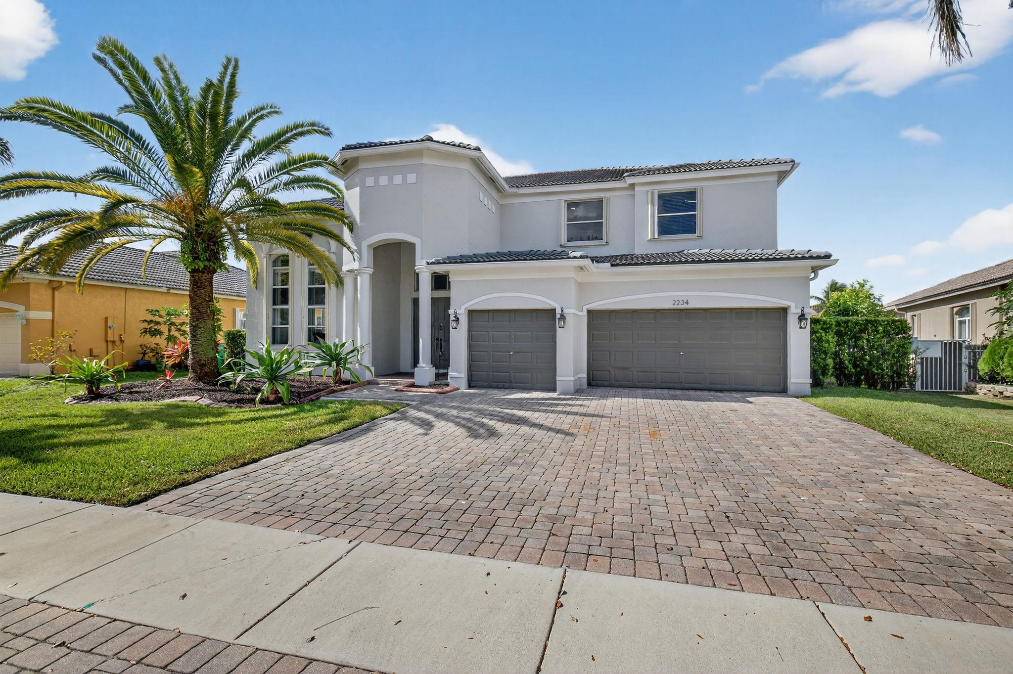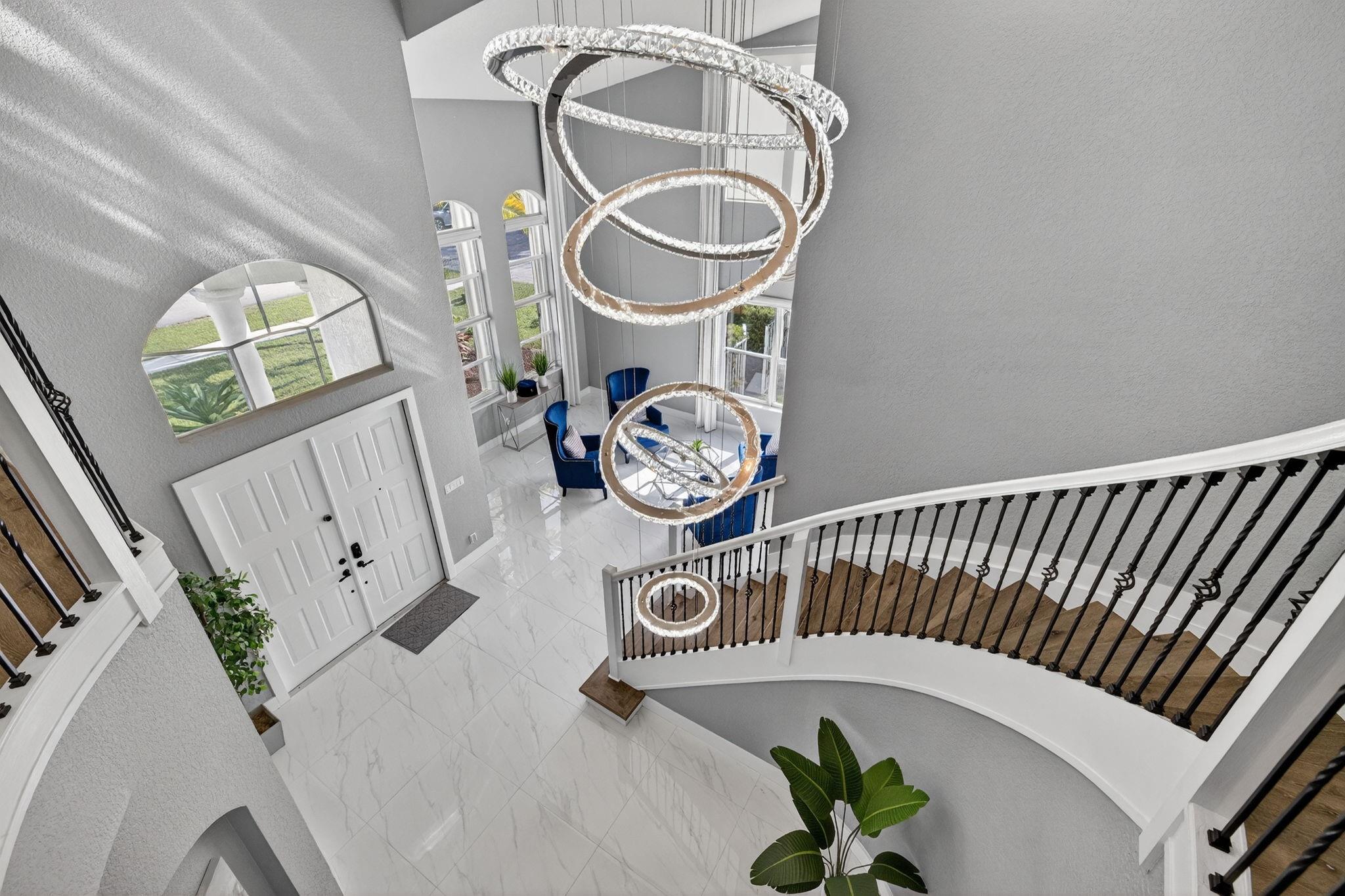Beautifully updated 5 BD, 3 BA lakefront home with a spacious layout and a convenient bedroom & bathroom on the 1st floor. Gorgeous remodeled kitchen has quartz counters, SS appliances, shaker cabinets & a big island that flows into a huge family room perfect for entertaining. Spacious primary suite offers a sitting area, closet cabinetry, a spa-inspired bathroom with a freestanding tub, frameless shower, dual vanities & modern finishes. Upstairs, you'll find a versatile loft that works beautifully as a den, office, playroom, or study area. Upgrades include renovated bathrooms, new tile & LVP flooring, modern lighting, 2 newer AC's & accordion shutters. Low HOA fees $166 incl: community pool, gym, tennis, basketball, playground & park. Monarch Lakes provides access to top tier schools.
