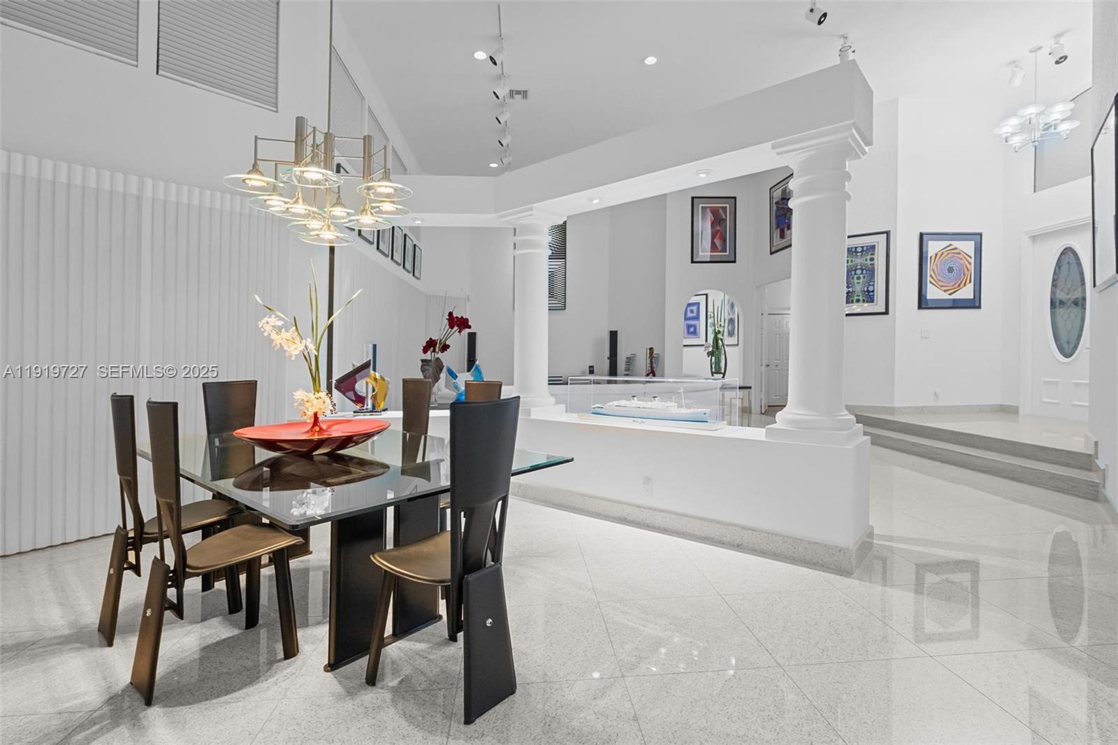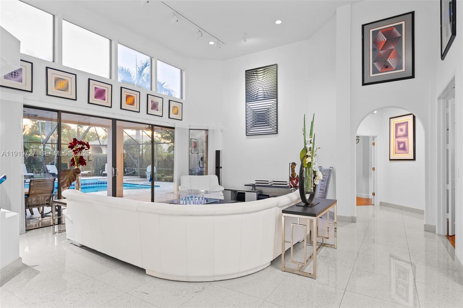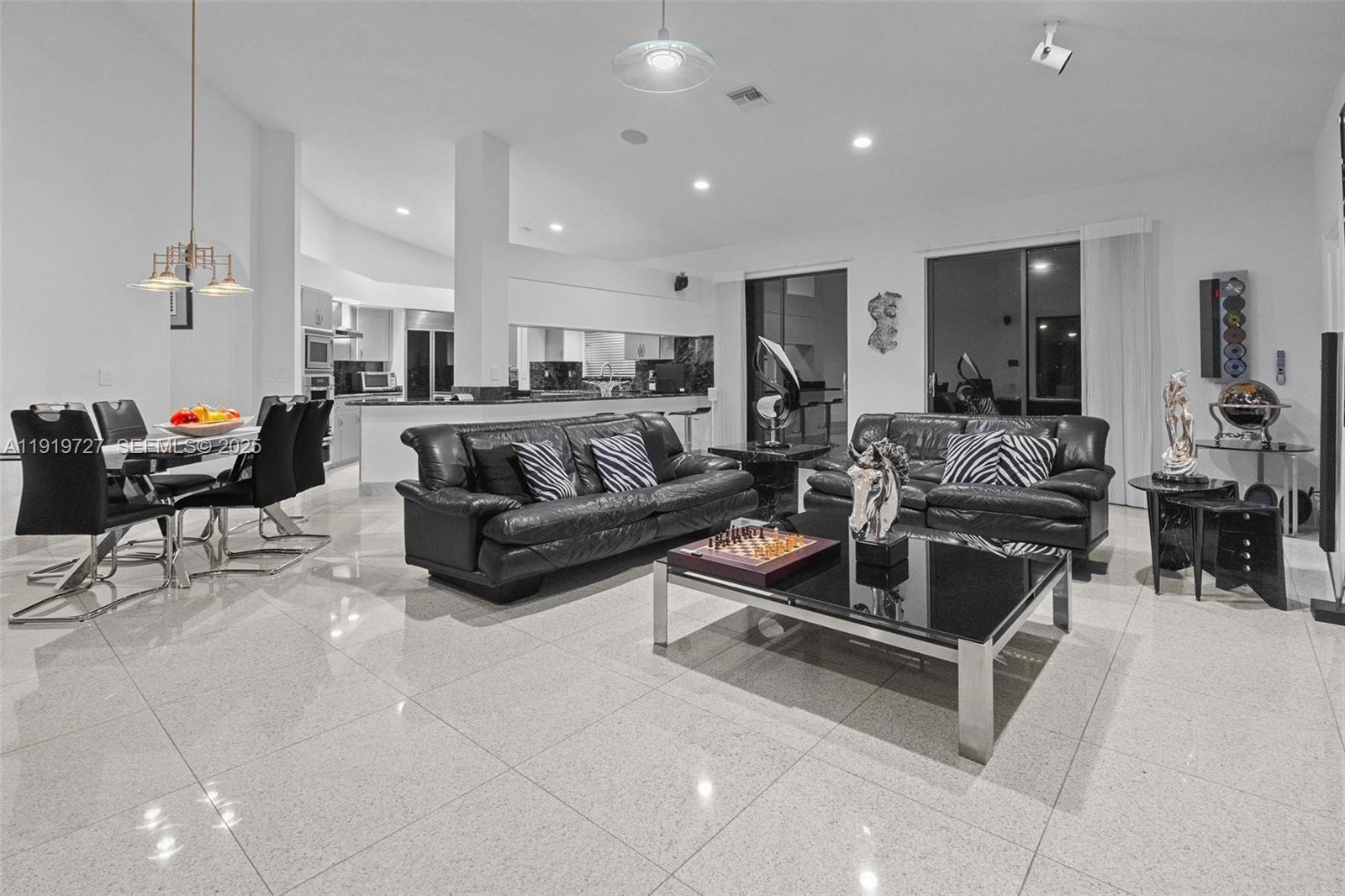 This remarkable 4,828-square-foot, five-bedroom, four-bath residence blends elegance and comfort, beautifully set on a private corner lot. Imperial White/Grey granite floors flow through the main living areas, creating a refined welcome the moment you enter.The private primary wing offers calming pool views, a spa-inspired bath, and dual California Closets, while a nearby office/den provides the perfect space for work or quiet retreat. A thoughtful three-wing layout ensures privacy for everyone. Family bedrooms feature custom closets and beautifully finished baths, and the dedicated Wellness Wing includes a custom Finlandia sauna, home gym, and full bath. An impressive guest suite serves as a true secondary primary. At the center, soaring ceilings connect the formal living, dining, and oversized family room. The gourmet kitchen showcases premium appliances, Amadeus granite, and custom cabinetry for everyday living and entertaining.Outdoors, the corner lot becomes a private tropical oasis with a heated saltwater pool, spa, screened patio, and lush landscaping. Additional highlights include a custom finished garage, Tesla charging station, and integrated smart-home technology — combining convenience and modern living.