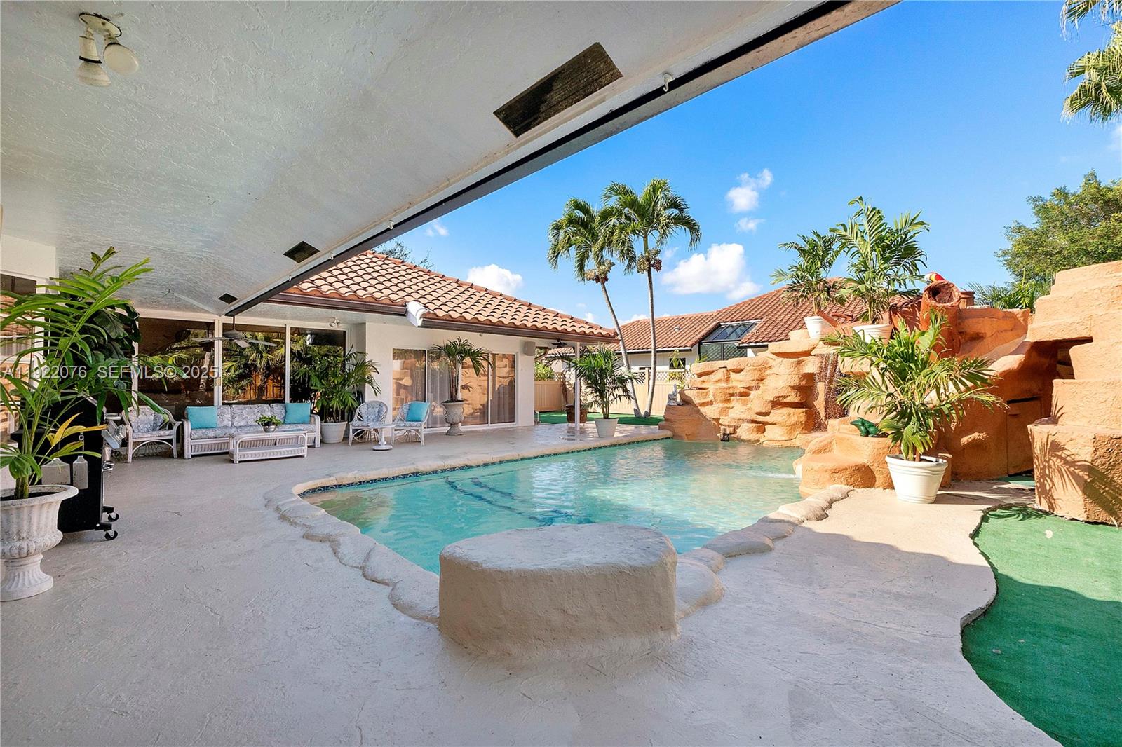 CORNER LOT!!! Exciting Resort style “Water Park” back yard with an amazing water slide, and huge incredible water falls, that cascade down a two beautiful rock walls.But wait!There is also a Pickle-ball/Tennis/Badminton Court with a basketball hoop court.Huge windows with views of this professionally landscaped tropical paradise with beautiful palm trees surround the whole house. Open concept designs with walkouts from every room. Beautifully renovated all new white shaker style kitchen cabinets with quartz countertops, new bathrooms and the master bathroom has a Jacuzzi Jet spa tub. Front yard has been newly and professionally landscaped. New stainless appliances including new LG extreme hi heat stainless stove and refrigerator stainless dishwasher and new LG washer and dryer. Two A/C units one is brand new and one is 5 years old with clean air system and maintenance free landscape.