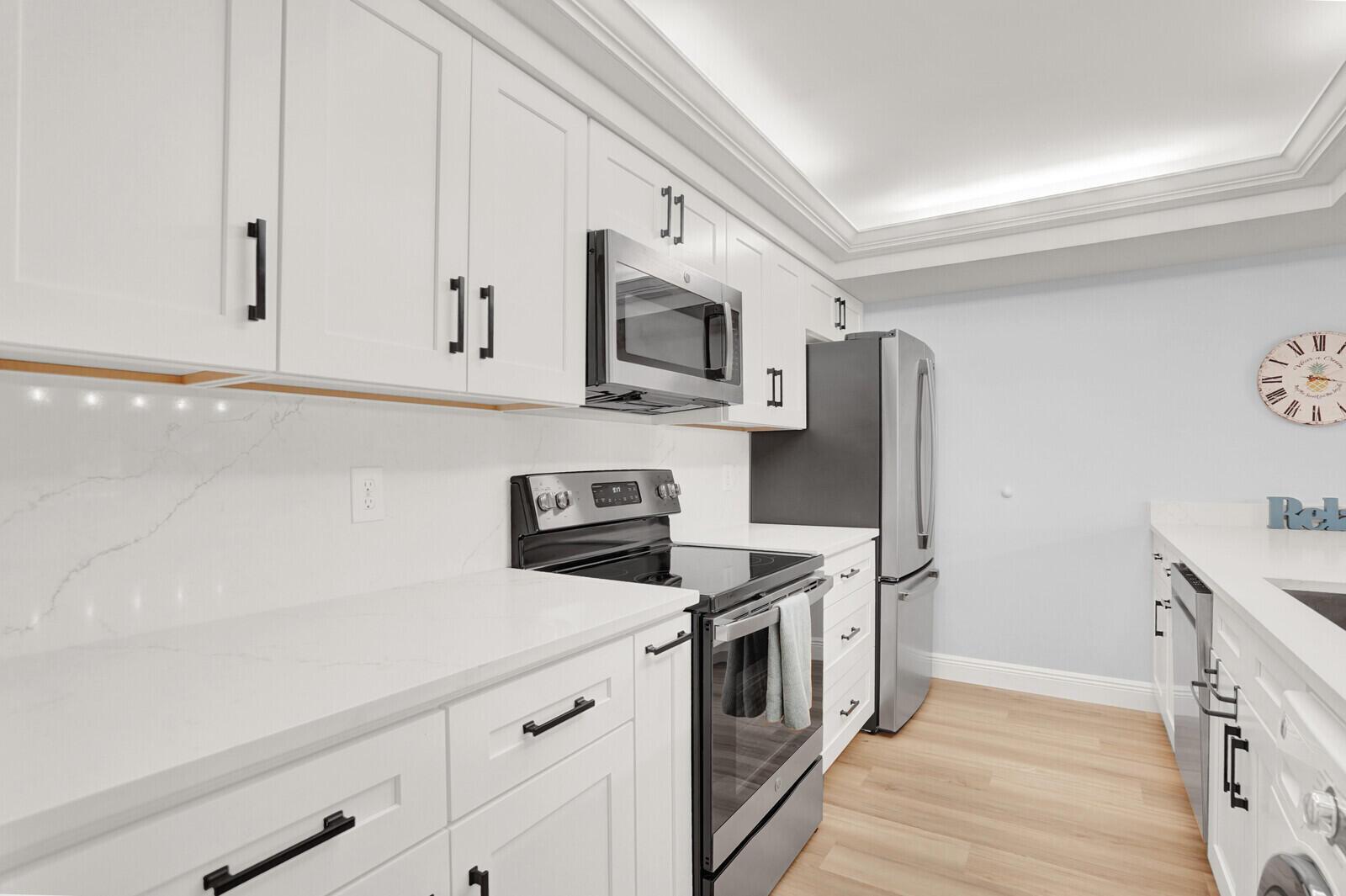 Welcome to your dream home in the heart of the prestigious PGA National community! This fully updated 2-bedroom, 2-bathroom townhouse offers breathtaking views of the 10th hole of the renowned Fazio Golf Course. Meticulously renovated in 2021, this residence features elegant white shaker cabinets in both the kitchen and bathrooms, complemented by sleek quartz countertops and top-of-the-line GE stainless steel appliances. The luxury vinyl plank flooring and plantation shutters add a touch of sophistication, while the new lighting fixtures enhance the home's modern appeal. In addition to these stylish upgrades, the property boasts new patio pavers, impact windows, and a new A/C unit installed in 2022, ensuring comfort and peace of mind.