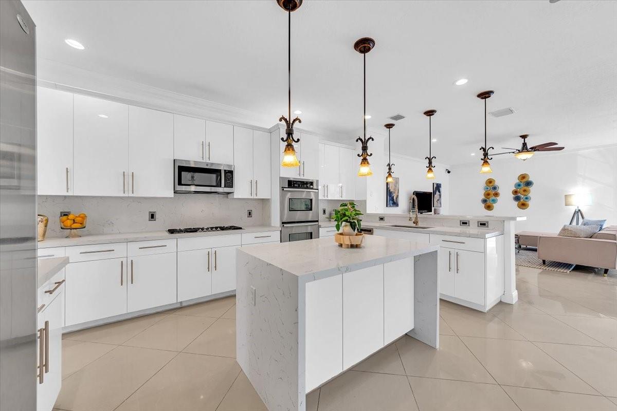 Stunning Grand Cayman model in Pembroke Falls, with a beautiful screened pool, built-in grill, and fenced backyard on an oversized lot—one of the biggest in the community! This grand estate features five bedrooms, four bathrooms, a three-car garage, custom closets, beautiful porcelain floors downstairs, complemented by wood floors upstairs. The upgraded kitchen is equipped w/ a double oven, modern white cabinets, a pantry room, and quartz countertops/backsplash, plus an island and snack counter adding to functionality. 1 bed and 1 full bath downstairs. Master suite with a sitting area and custom closets complete this majestic home. Located in a prestigious gated community with state-of-the-art recreation center, pool, tennis courts, clubhouse, pickleball, basketball, and much more.