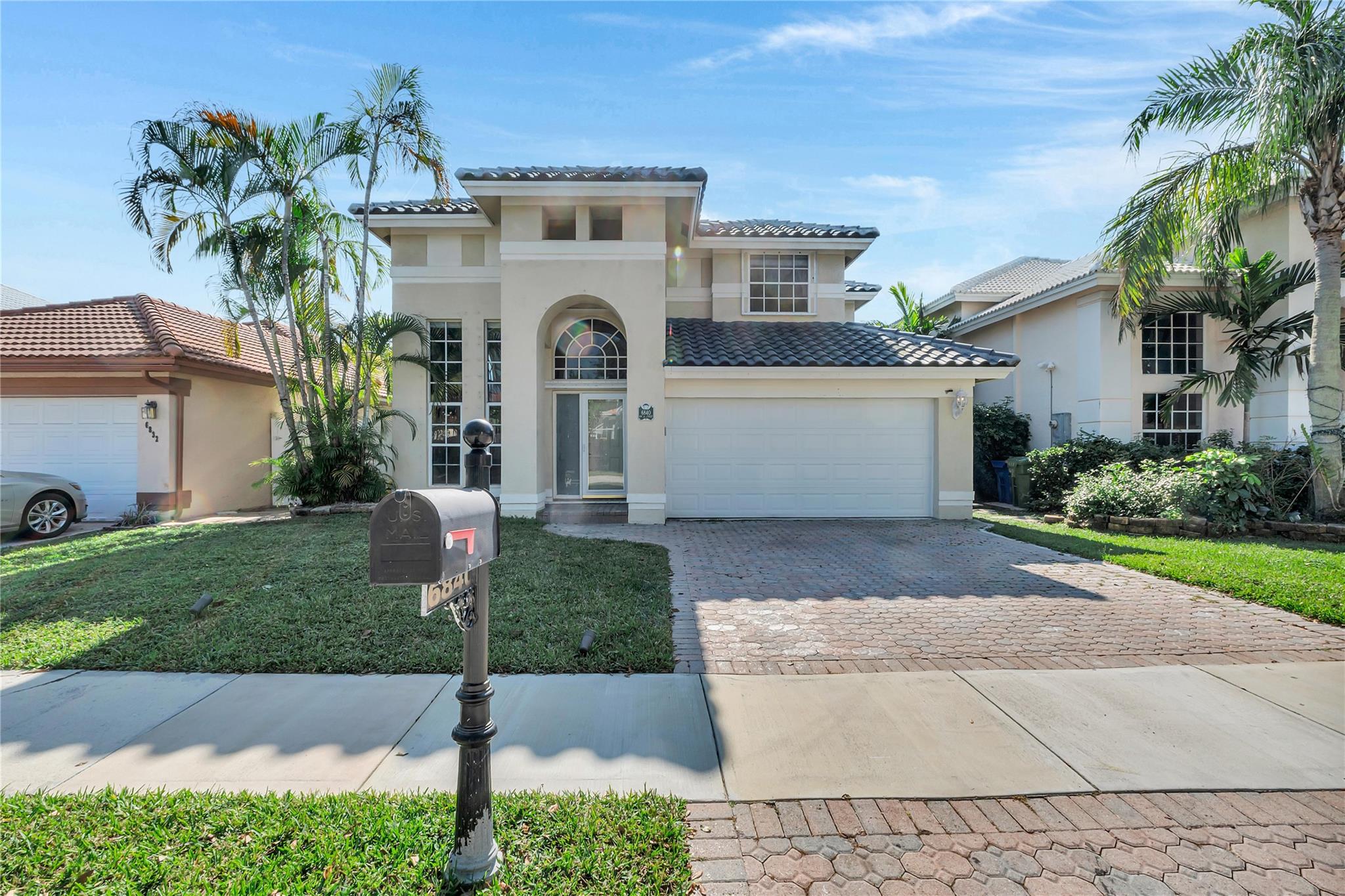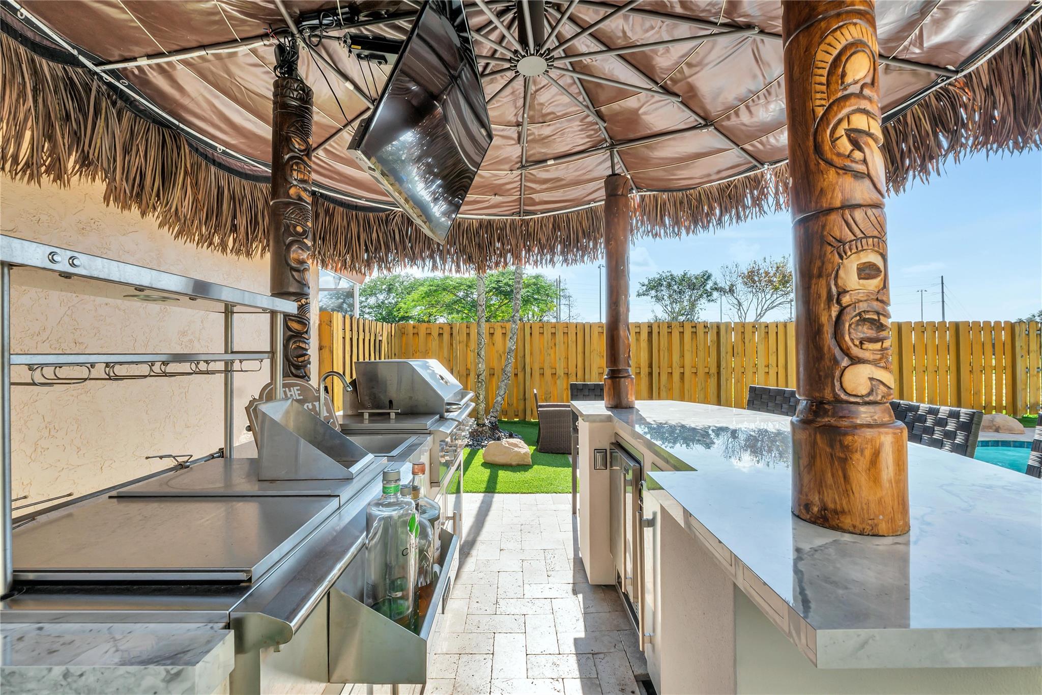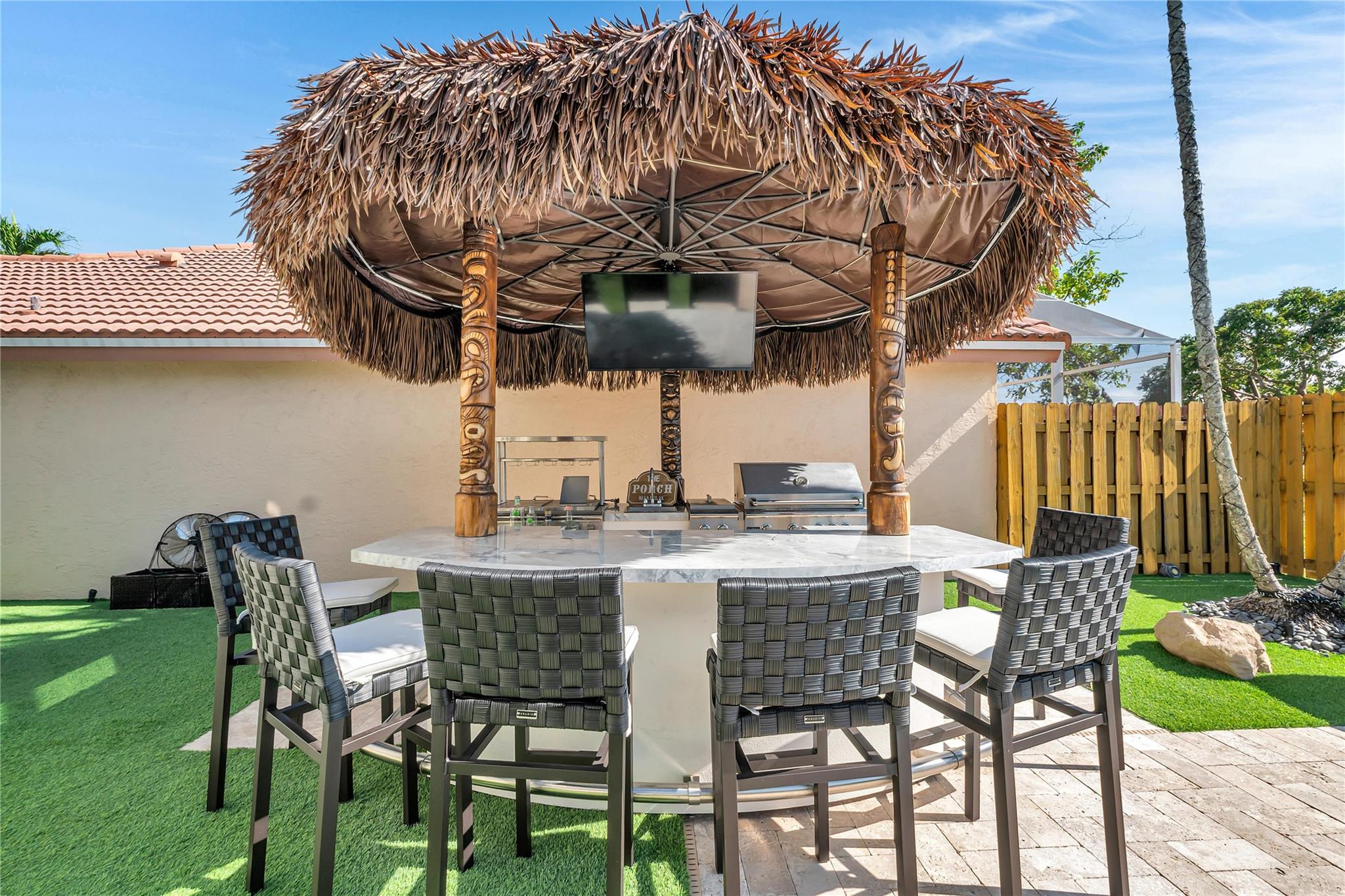 Beautiful 4-bedroom 3-bathroom pool home in a great neighborhood. Roof 2025 and full hurricane protection. As soon as you enter you are greeted by soaring ceilings. The updated eat-in kitchen boasts granite counters, a large island and lots of storage. One bedroom downstairs, currently being used an office. The large primary bedroom has a walk-in closet. The primary bathroom features a dual vanity and large walk-in shower. Enjoy the gorgeous pool area w/pergola, perfect for entertaining. The tiki bar and outdoor kitchen are negotiable. The fully fenced backyard has turf for low maintenance. The home backs up to a large park with playground, basketball courts and walking paths, perfect for families.