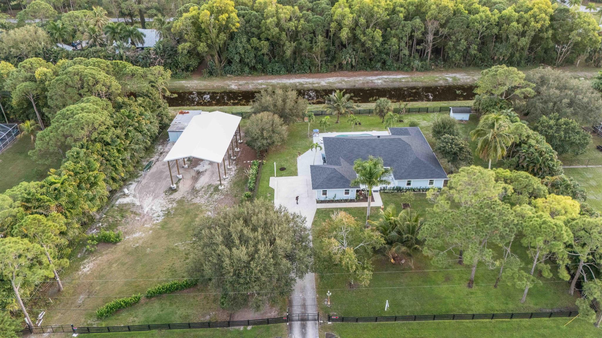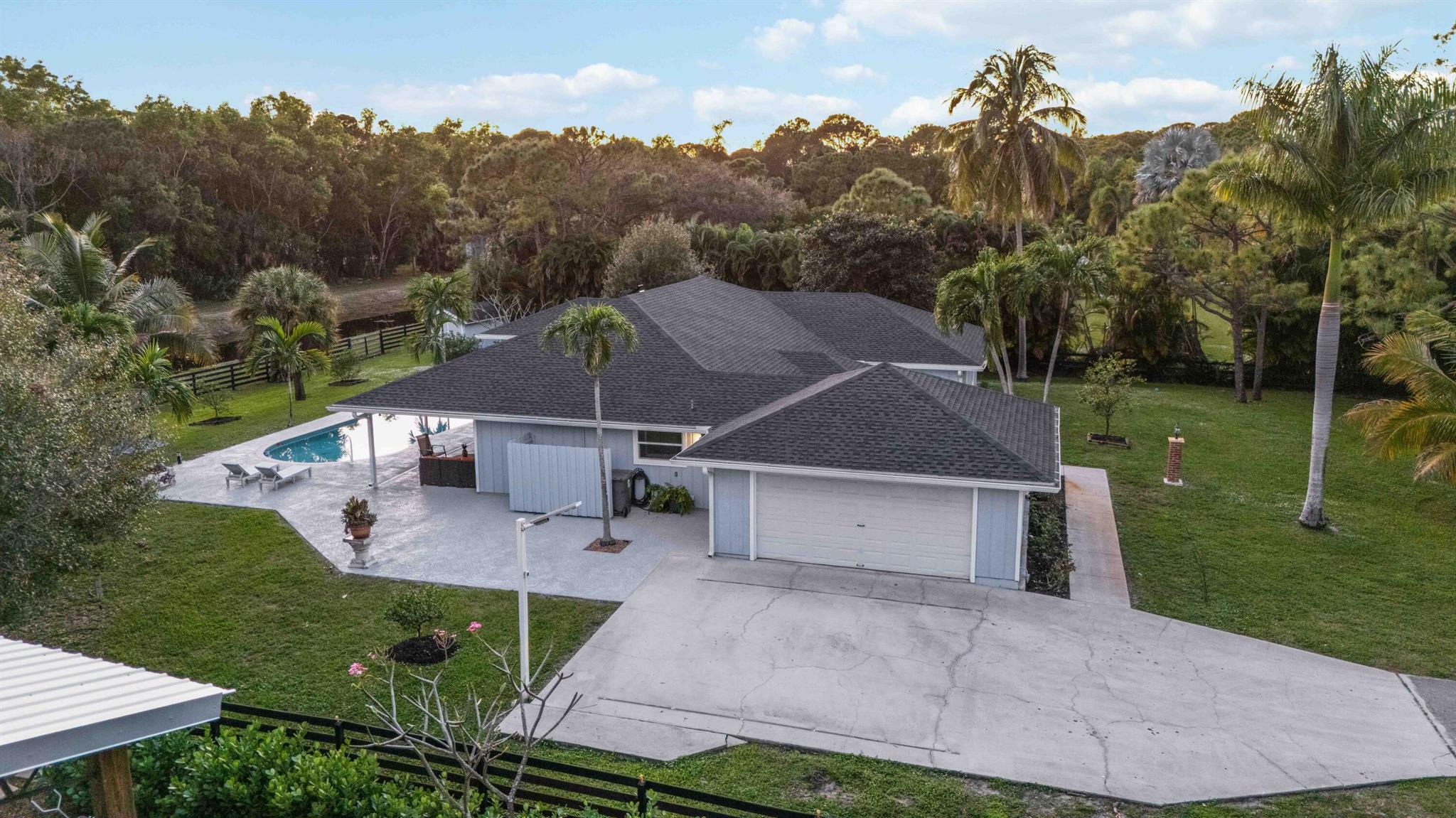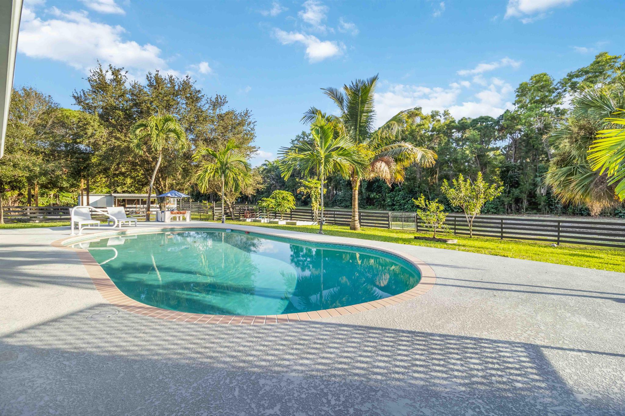 Renovated 4/2.5/2 pool home on 1.16 acres in Palm Beach Country Estates. NO HOA, paved roads, located near the front of the community and includes a 30x60 pole barn. Features include solid wood 42'' kitchen cabinets, quartz countertops, SS Frigidaire Gallery appliances, cabinet under-lighting, and 4 ft x4 ft. Imported Spanish porcelain tile throughout. Open concept living. Updated porcelain baths, 15x30 6-ft deep pool with cool deck coating, 2024 roof, impact windows, and epoxy-finished garage floor. Also includes a 12x24 chicken coop w/10x10 storage. 50 amp service at the pole barn to run fifth wheels or any RV/Charger for electric cars. Fully fenced & gated. Bring your family, toys, horses, and chickens--room for all!