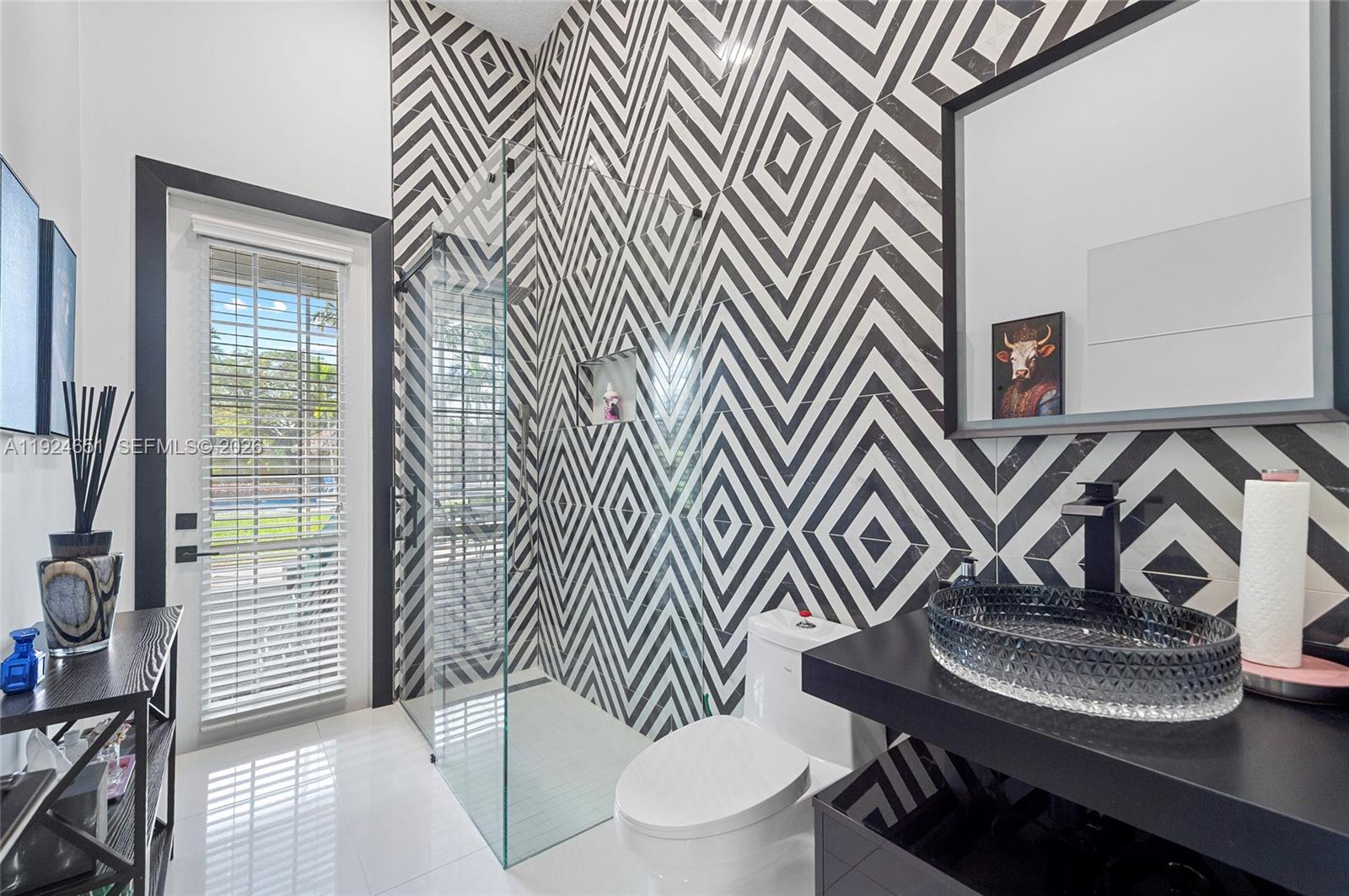 Brand New Roof 2026. Set within the gated enclave of Emerald Springs Estates, this modern elegance is on the community’s largest lot with 1.5 acres of beautifully designed grounds, complete with a private sports court and resort-style outdoor living. Fully remodeled in 2021, the home offers 4 bedrooms and 4 bathrooms, each updated with new showers, designer fixtures, custom closets, and sleek white porcelain flooring that carries throughout the residence. The primary suite is a true retreat, with an oversized room highlighted by a Chanel-influenced walk-in closet with luxury designer flooring. The kitchen is equally impressive, reimagined with top-tier finishes and a complete collection of Fulgor Milano Italian appliances, including two refrigerators, a wine fridge, double oven, drawer microwave, built-in espresso machine, an island beverage fridge, and a Bosch dishwasher. Three A/C units, a new water heater, new washer and dryer, and accordion shutters offer comfort and peace of mind. The pool and spa were fully renovated in 2021. Expansive outdoor space and room to personalize with an outdoor kitchen or additional amenities, this rare Davie estate blends luxury, privacy, and scale in a way few homes can match.