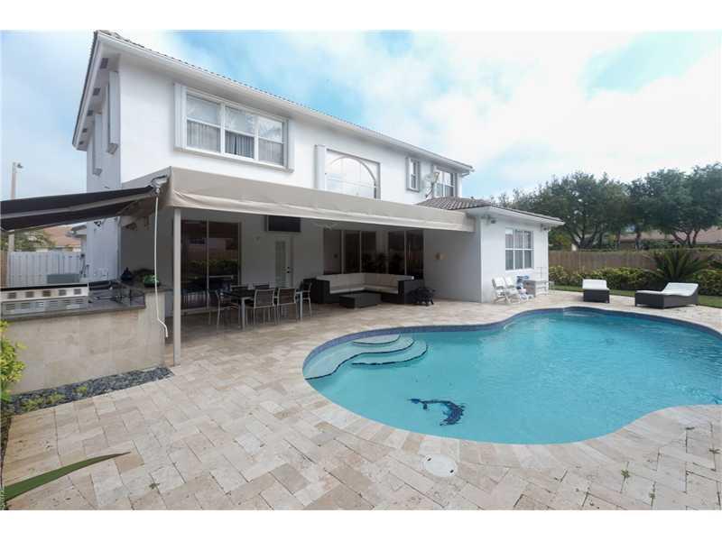 This fabulous home features 5 bedroom 3 full baths. One full bed & bathroom downstairs. New high quality kitchen solid wood cabinets & stainless steal appliances. Drop ceiling in family room. Marble flooring all bathrooms. Hunter Douglas shades throughou t the house. Stairs all wood. Home automation with air conditioning and lighting control via IPad. Driveway and pool deck with travertine marble, Patio with barbecue & bar area. Inside newly painted. Garage tiled floor.24 hours man gated community