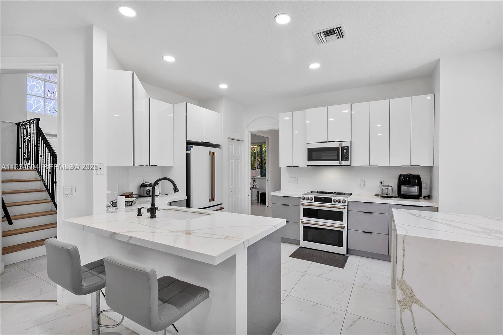 Priced to Sell! BRING OFFERS! Beautifully updated 5-bed, 3-bath WATERFRONT pool home located on a quiet cul-de-sac in the prestigious Kensington Glen community of Coral Springs. This home offers extensive upgrades including a NEW ROOF (2023), 2 x New AC units (2024), and an Updated Kitchen (2024) featuring quartz countertops, white and gray custom cabinetry, and Café white matte high-end appliances with bronze finishes. Additional improvements include a new water heater (2023), washer and dryer (2025), and pool pump (2024). Yes, the pool is heated! Interior enhancements include new porcelain tile (2024) and wood flooring (2025) throughout, along with fully renovated bathrooms (2024). The primary suite features a spacious WALK-IN CLOSET, and in the primary bathroom - dual vanities, a separate SOAKING TUB, and a walk-in shower. Enjoy your morning coffee or the evening sunsets on your oversized BALCONY with stairs leading to the pool and patio, offering tranquil views of the private pool, canal, and sunsets. Conveniently located near the Sawgrass Expressway, shopping, dining, and A-rated schools.
