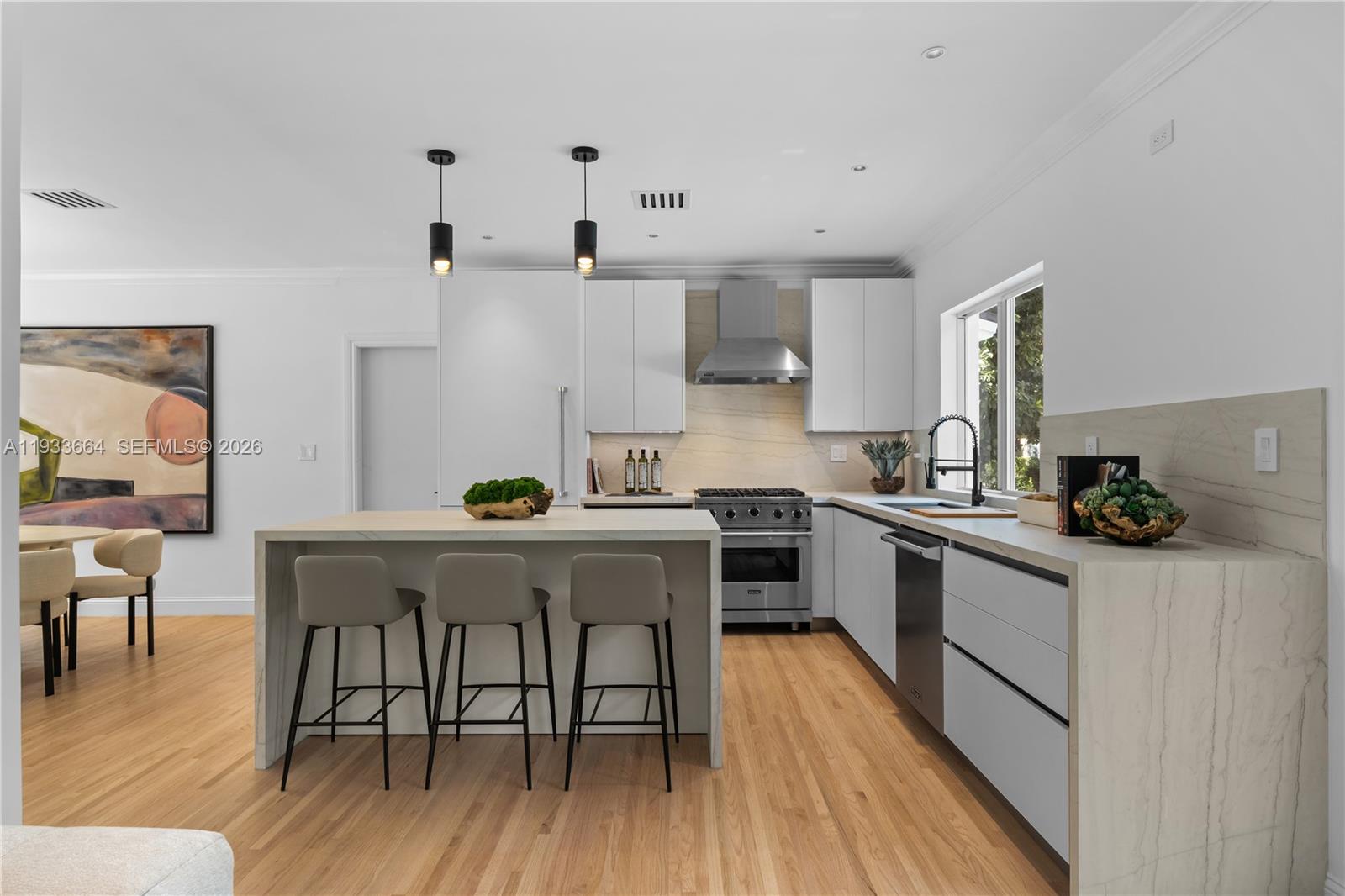 Turnkey, fully remodeled 4BR/3BA modern residence on prestigious Anastasia Ave in Coral Gables, just steps from the Biltmore Hotel. Designed for effortless indoor-outdoor living, the home features a covered terrace overlooking an impressive brand-new pool and private landscaped yard. The property offers approximately 2,619 sq ft of adjusted living area under A/C following the last home expansion, with 2,957 sq ft total area, set on an oversized 10,000 sq ft lot. Interior highlights include an open-concept layout with European kitchen cabinetry, Viking appliances, hardwood floors, and porcelain tile bathrooms. Additional features include city gas connection with gas-powered appliances, new roof, new A/C, new windows, new landscaping, and new sprinkler system. Completing the home is a two-car garage with integrated laundry area. Walkable to the Biltmore Hotel, golf, and dining.