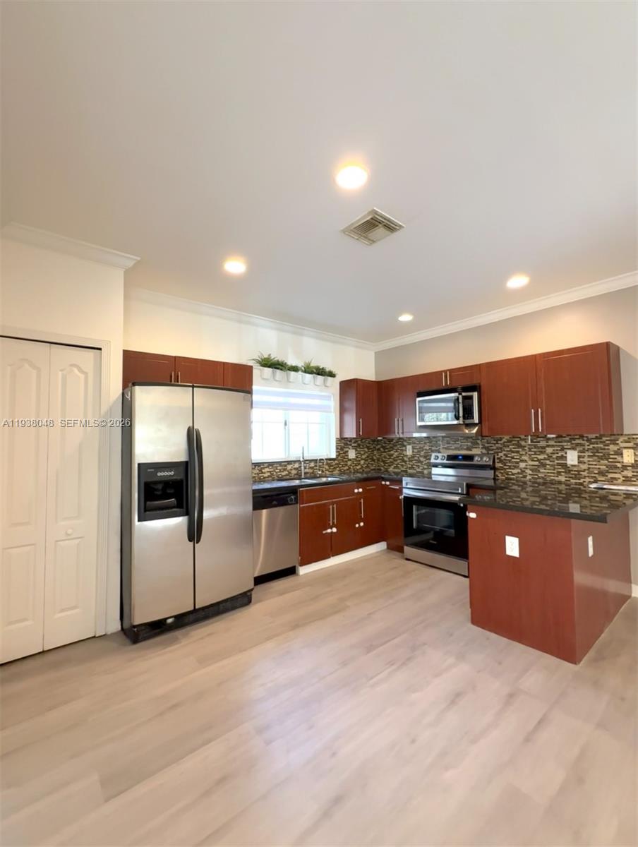 Seller Motivated!! Come see this beautifully updated 3 bed, 2.5 bath very spacious townhouse in a prestigious man-gated community of Somerset Cove at Vizcaya! Former model home with a better layout and a massive private patio—3–4x larger than other units, no backyard neighbors and a canal view. New roof & A/C (2023), freshly painted (2024), full accordion shutters, and hurricane-impact Florida room sliders. Bright, open concept kitchen layout with stainless steel appliances and spacious living areas with lots of natural light. Laminate flooring throughout the entire home. Very large bedrooms with big closet spaces and walk in closets. One-car garage with extra storage. Just steps from the pool! Community offers 24/7 security, pool, and playground. Close to A rated schools, shopping, and highways. Move-in ready!