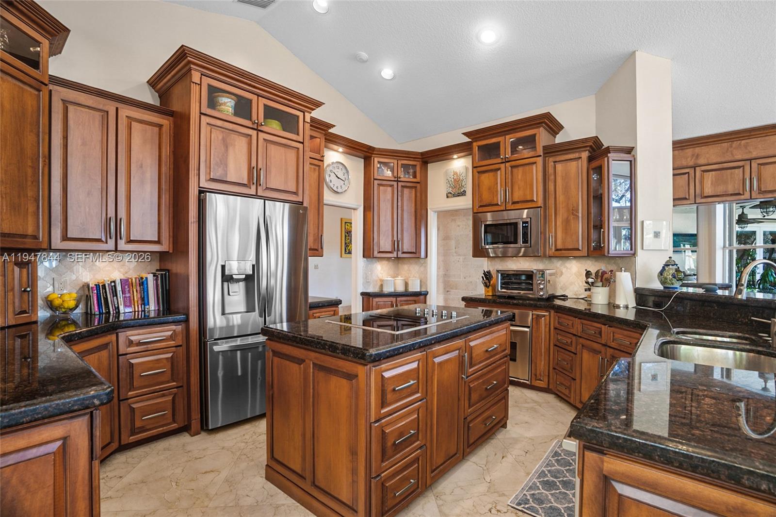 Tucked away on a quiet street in the exclusive gated community of Palm Island in Weston, FL, this magnificent 5-bedroom, 5-bath lakefront estate is a true private retreat. Surrounded by lush tropical foliage and mature fruit trees, the home offers breathtaking water views and a sense of peace rarely found. Step inside to elegant marble floors, sun-filled living spaces, and the warmth of a wood-burning fireplace—perfect for both intimate moments and memorable gatherings. Impact-rated French doors open to a resort-style outdoor oasis featuring a newly resurfaced saltwater pool (2025), ideal for relaxing, entertaining, or enjoying quiet sunsets by the lake. Thoughtfully upgraded with Nest smart thermostats, security video system, and a whisper-quiet two-speed pool pump controllable from your phone, this home blends luxury with modern convenience. Located in A+ school districts and walkable to temples, churches, and parks, this exceptional residence offers the perfect balance of elegance, comfort, and community. All this home needs is you to call it home.