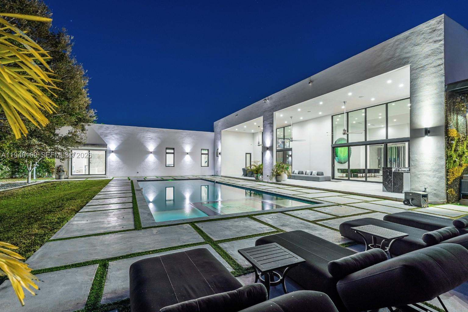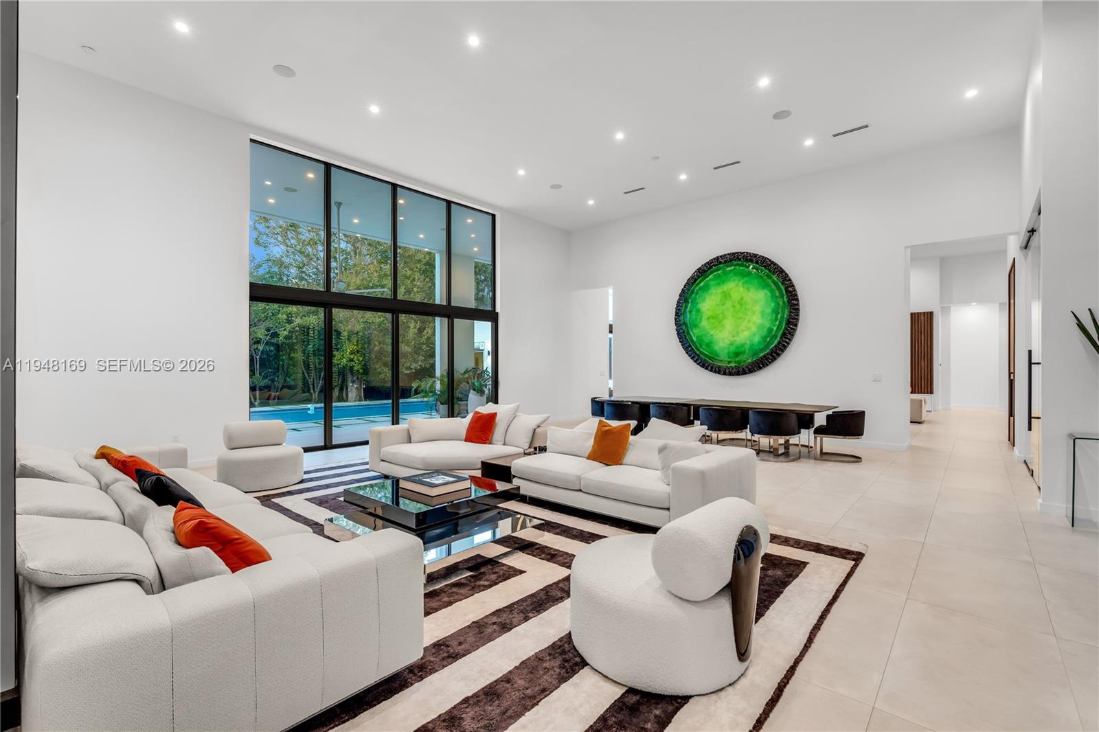 One story modern estate built in 2020 with refined finishes and a clean architectural presence, offering a bright open floorplan framed by oversized windows and doors throughout. The Italian kitchen is designed for both function and entertaining, featuring sleek cabinetry, quartz countertops, and Wolf and SubZero appliances, flowing seamlessly into the family room with views of the outdoor living areas. The home offers six spacious en suite bedrooms with finished closets, a den or office, and a dedicated wine room. The primary suite is a private retreat with a spa inspired bath featuring double vanities, separate water closets, a floating soaking tub, and an expansive shower. Porcelain floors, LED lighting, high ceilings, a large covered terrace, summer kitchen, and two car garage complete the interior. The backyard delivers a true resort experience with expansive green grounds, infinity pool, hot tub, sauna, cold plunge, fire pit seating, and multiple outdoor lounge and dining areas. Ideally located near premier Pinecrest schools.