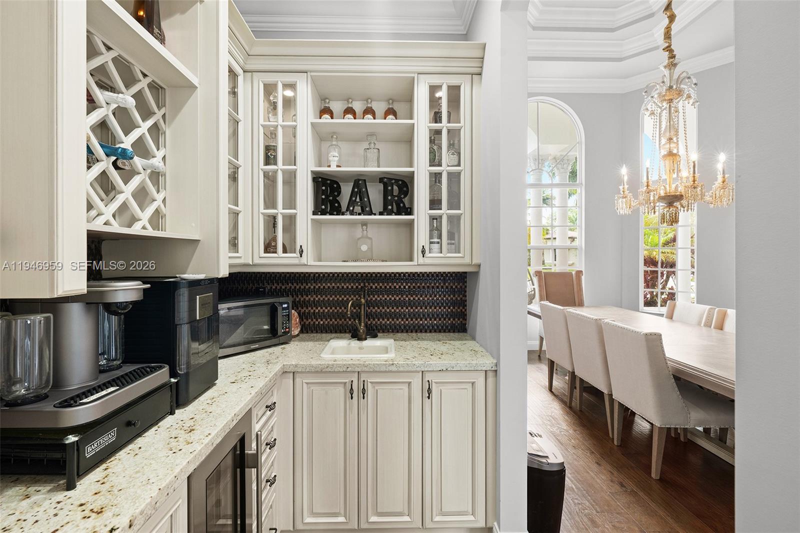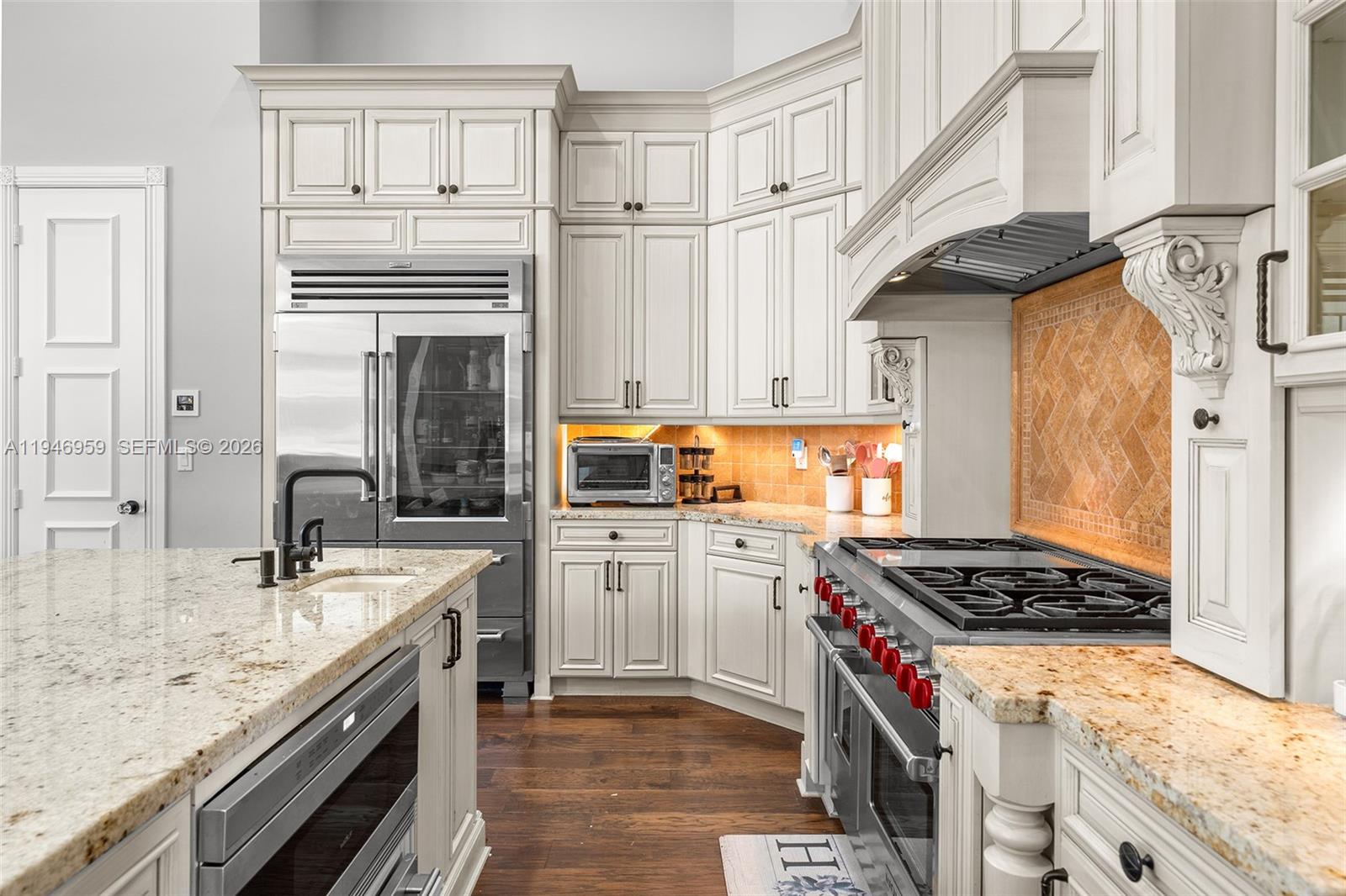 Villa Stonebrook presents a private retreat designed for comfort, functionality, and entertaining. The home is thoughtfully arranged around a central pool area, creating seamless indoor-outdoor flow complemented by a fully equipped summer kitchen. Interior highlights include hardwood flooring, dramatic ceiling details, and expansive living spaces filled with natural light. The open kitchen serves as the centerpiece of the home, connecting effortlessly to the casual dining area and spacious family room. The primary suite features a marble-appointed bathroom with a sauna and walk-in shower and oversized closet space. An outstanding opportunity to own a distinctive residence within Stonebrook Estates.