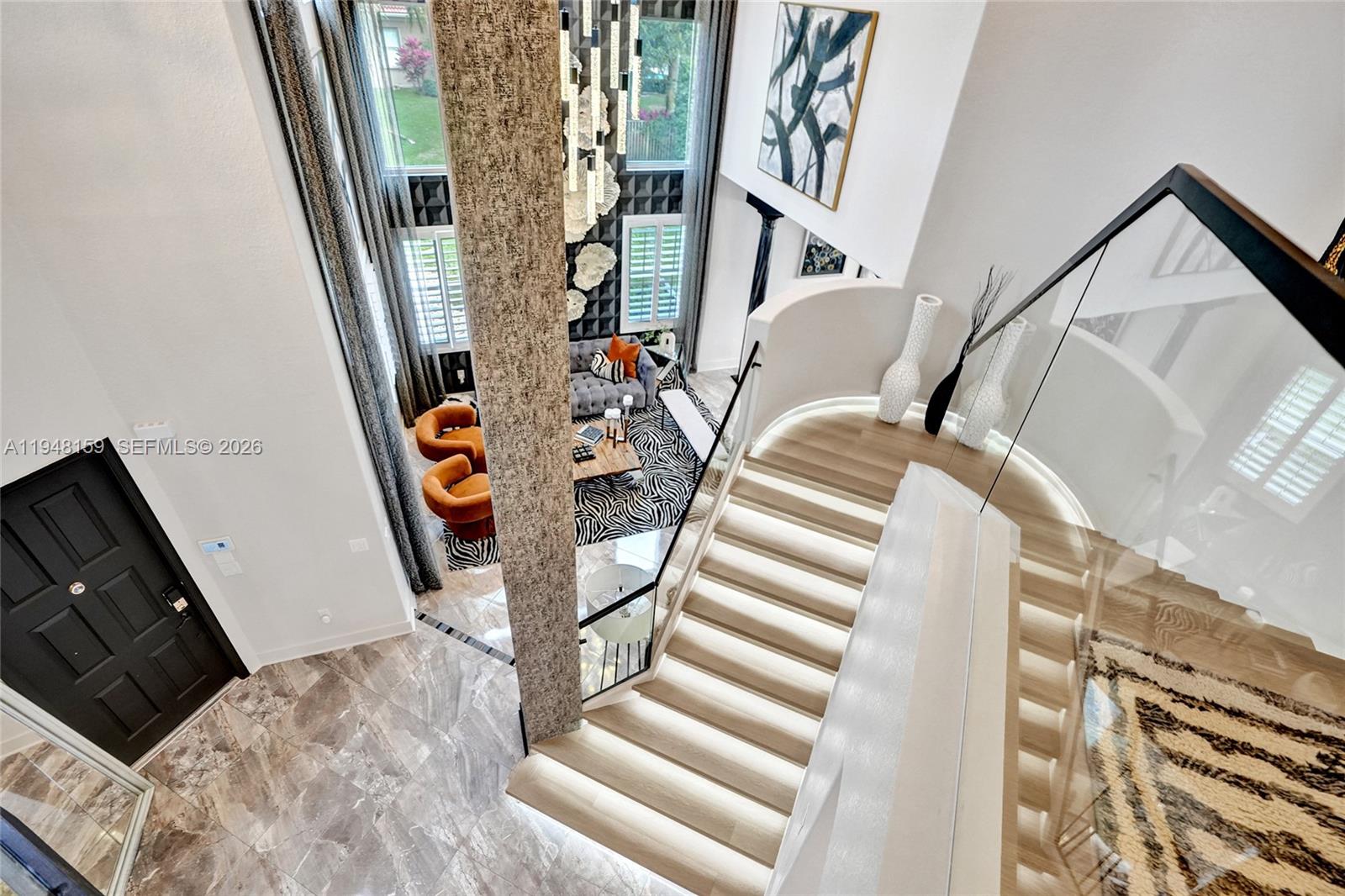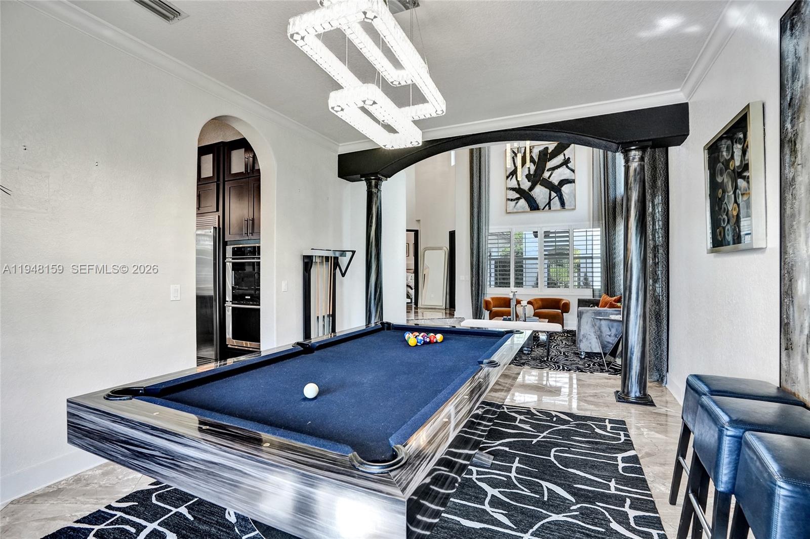 Located within the private, gated enclave of Highland Ranch Estates, this elegant Italian Villa–style residence offers a refined, light-filled floor plan designed for upscale living. A charming courtyard with a tranquil fountain welcomes you into an interior showcasing soaring ceilings adorned with designer chandeliers, expansive open living spaces, two formal dining areas, and a striking staircase with modern glass-style railings and LED smart motion-activated lighting. This impressive home offers 5 bedrooms and 4 bathrooms, encompassing 4,732 square feet under air and situated on an expansive lot exceeding 35,000 square feet. The oversized second-floor primary suite features a private sitting area with minibar, dual walk-in closets, and a spa-inspired bath. Chandeliers add elegance to the primary suite, kitchen, dining room, and billiards area. The gourmet eat-in kitchen is appointed with top-of-the-line appliances and a butler’s pantry, while the spacious laundry room includes two washers, two dryers, and a utility sink. Four wall-mounted screens create a true theater-style experience, and the family/media room overlooks the resort-style pool and jacuzzi, enhanced by upgraded exterior and pool lighting—perfect for entertaining included surround sound. Additional highlights include impact windows and doors, a tankless water heater, roof (2021), HVAC (2023), and access to a community basketball court.
