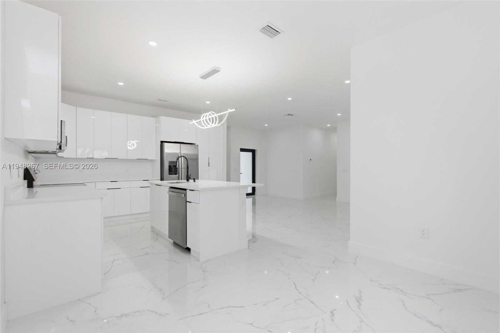 Welcome to this beautifully crafted new construction home located in the desirable residential neighborhood of Mirror Lakes. This thoughtfully designed property offers 3 spacious bedrooms and 2 full bathrooms, blending modern style with everyday comfort. The home features a contemporary kitchen with sleek modern cabinetry, stainless steel appliances, and a striking modern light fixture above the kitchen island, perfect for both daily living and entertaining. Impact hurricane-rated doors and windows provide peace of mind while enhancing energy efficiency. Enjoy outdoor living with ample patio space, highlighted by a mature shade tree, ideal for relaxing, hosting gatherings, or enjoying Florida evenings. Additional features include a 2-car garage, a spacious laundry room, and the rare advantage of no association, offering flexibility and freedom. This open floor plan home combines modern finishes, quality construction, and a quite neighborhood setting; an excellent opportunity for homeowners seeking style, comfort, and convenience.