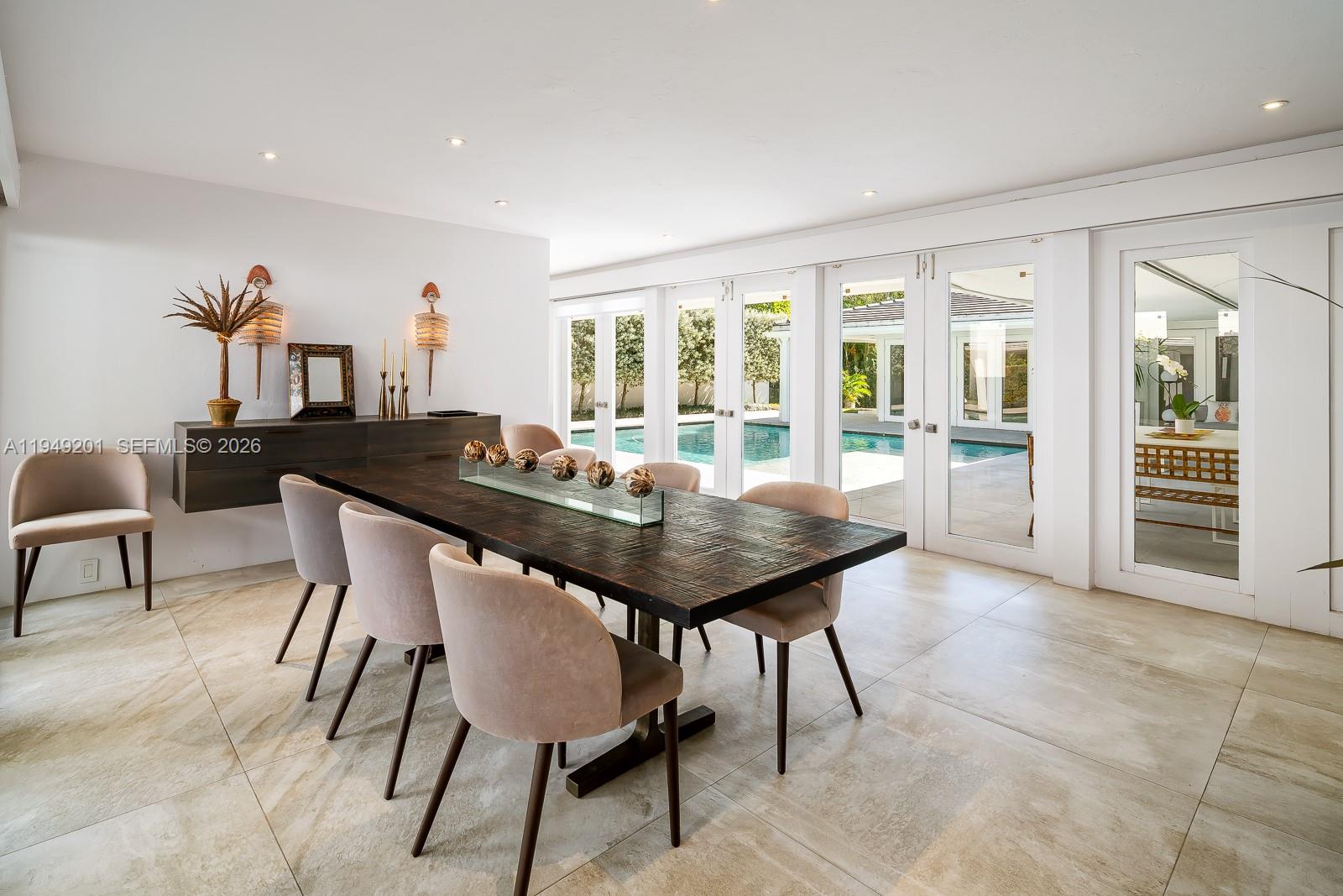 Elegant, architecturally refined one-story residence situated on an expansive 12,000-square-foot lot along prestigious Riviera Drive in Coral Gables. Renowned architect Charles Harrison Pawley created a remarkable redesign & expansion, introducing a masterful U-shaped layout that perfectly frames the home’s resort-style outdoor living spaces. Walls of wraparound French doors open to a generous covered terrace overlooking a stunning pool featuring a sun-shelf for lounging. The contemporary MiaCucina eat-in kitchen, sleek MiaCucina primary bath and closets, with Dayoris doors throughout are exceptional examples of refined modern design and craftsmanship. Large 38” x 38” European porcelain tile flooring flows seamlessly from indoors to outdoors, delivering the quintessential South Florida lifestyle. The tranquil primary suite, highlighted by exposed beam ceilings, offers a private retreat designed for rest and relaxation. Additional features include a gated entry, two-car garage, and the notable benefit of not being located in a flood zone. A contemporary architectural showpiece. A Very Special Home.