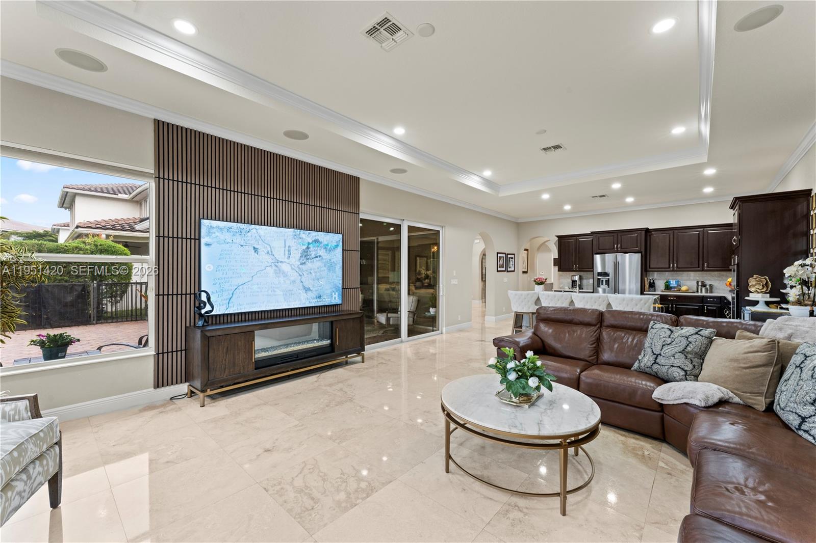 Gorgeous waterfront home with scenic views from every room! This modern waterfront 4BR/3BA residence in Heron Bay offers lake views from all main living areas. Built in 2014 with full impact glass and energy-efficient construction. Open split floor plan with 3-car garage and 3,024 SF interior. Polished 24" travertine floors, high coffered and volume ceilings with wide crown molding, and custom closet cabinetry, and copious recessed lighting elevates the interior with a rich atmosphere. Renovated kitchen features a large bar-style island, high-level counters, gas cooking, wall oven, microwave, pantry, and natural gas appliances; kitchen opens seamlessly to the family room. Primary suit includes neutral Berber carpet, an oversized walk-in closet, dual sinks with expansive vanities, separate tub and shower. Outdoor living includes a heated 15x30 saltwater pool, screened patio, exterior lighting, fenced yard, and north-facing rear exposure for consistent natural light. For even more premium finishes, this residence includes plantation shutters, honeycomb blinds, a laundry sink, impact doors, an auto-sprinkler system, a leased security system, and an automatic garage door opener. CBS construction with flat tile roof. Heron Bay amenities includes a clubhouse, fitness center, pools, tennis, and guard-gated entry. Zoned for highly rated schools Heron Heights, Westglades, Marjory Stoneman Douglas.