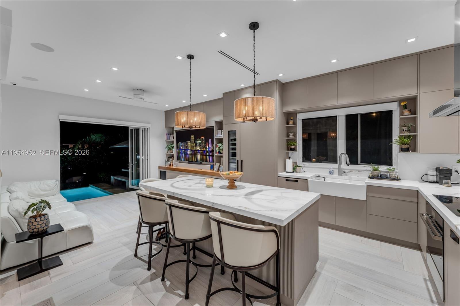 Welcome to 4819 University Drive, a bright & refined waterfront residence in the heart of Coral Gables, offering private dock access with direct ocean access for boaters. Designed for everyday living & entertaining, this home blends modern updates done in 2025 with over $400k in upgrades, & serene water views. The interior features porcelain flooring with wood finish, solid wood interior doors, & expansive living & dining areas filled with natural light. New Euro-Wall impact windows & folding glass doors create seamless indoor-outdoor flow to the waterfront terrace & pool. Linear slot diffuser A/C vents, LED recessed lighting, & surround sound enhance the contemporary aesthetic. The chef’s kitchen offers custom wood cabinetry, quartz countertops, all-new JennAir S/S appliances, & a Liebherr wine refrigerator with 75 bottle capacity. A private movie theater with seating for 7, built-in projector, & two wine coolers elevates the home’s entertainment experience. The primary suite features a fully remodeled 2025 bathroom with marble finishes & large walk-in closet. Outdoor living includes resurfaced pool completed in 2024, waterfront terrace, & Charbroil summer kitchen. Additional highlights include three A/C units, full indoor & outdoor camera system, Pelican whole-house water filtration, epoxy-finished garage with A/C, automatic custom blinds, updated septic system, & new gate motor. Ideally located near top-rated schools, parks, shopping, & dining. 5th Bedroom Used As Theatre.