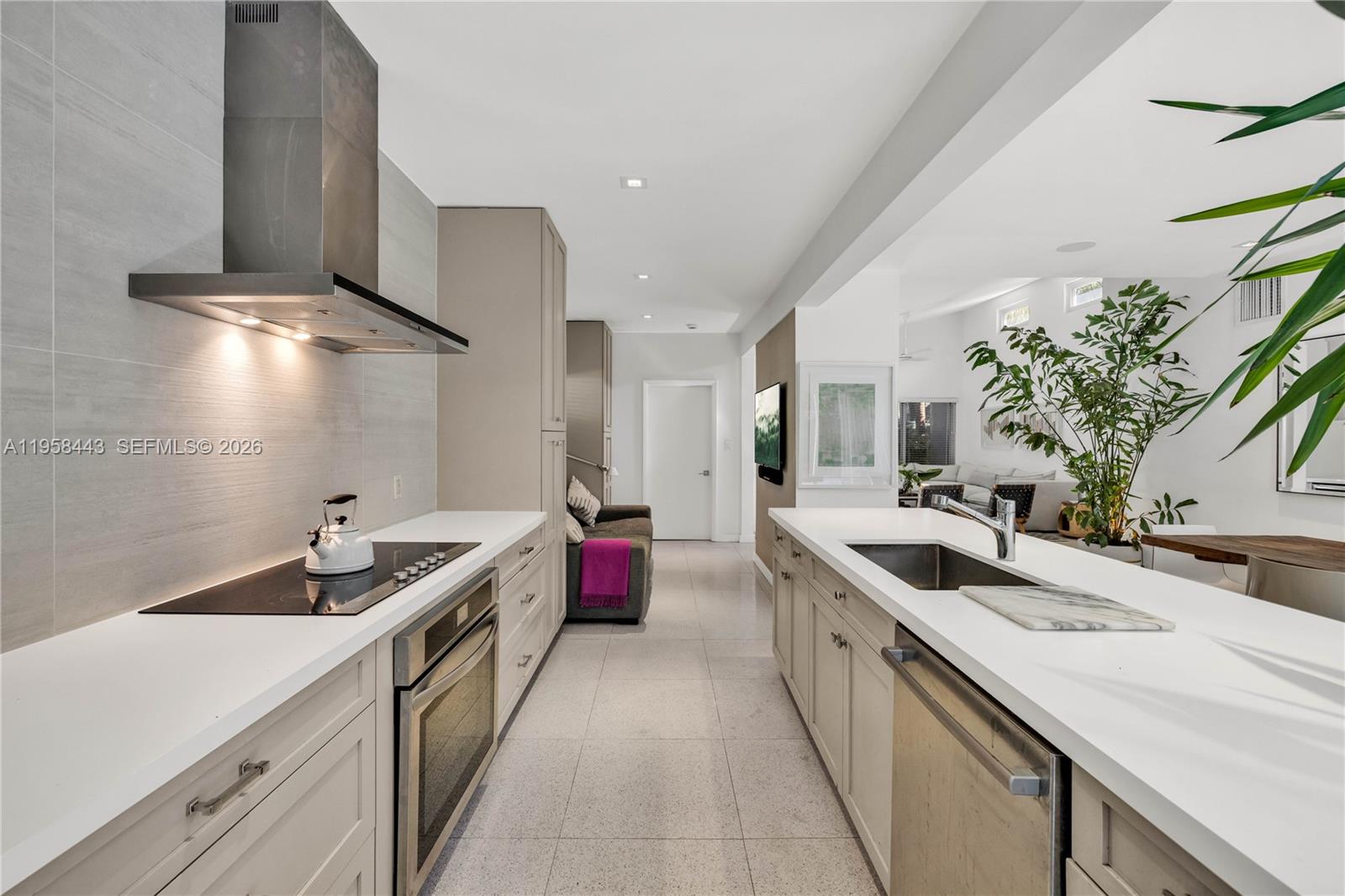 POOL home RETREAT! Experience living in TRUE MIAMI Mid-Century MODERN "Palm-Springs-style" Bungalow...nestled in Sherwood Forest...a slice of romance & history with peacocks and natural lush landscaping! Architectural classic features terrazzo floors, abounding in natural light w/oversized impact windows & vaulted high ceilings with tall clerestory windows...Amazing "GREAT VIBE" the minute you walk in! The entire house has been remodeled from top to bottom! Gorgeous large new kitchen overlooks the swimming pool and spacious entertaining + dining room. Both bedrooms are roomy, and the Primary bedroom offers a new bathroom ensuite w/walk-in closet. * Extra lounge space currently used as TV nook w/option for home office! A full 1-car garage w/finished ceiling and a laundry+closet area.