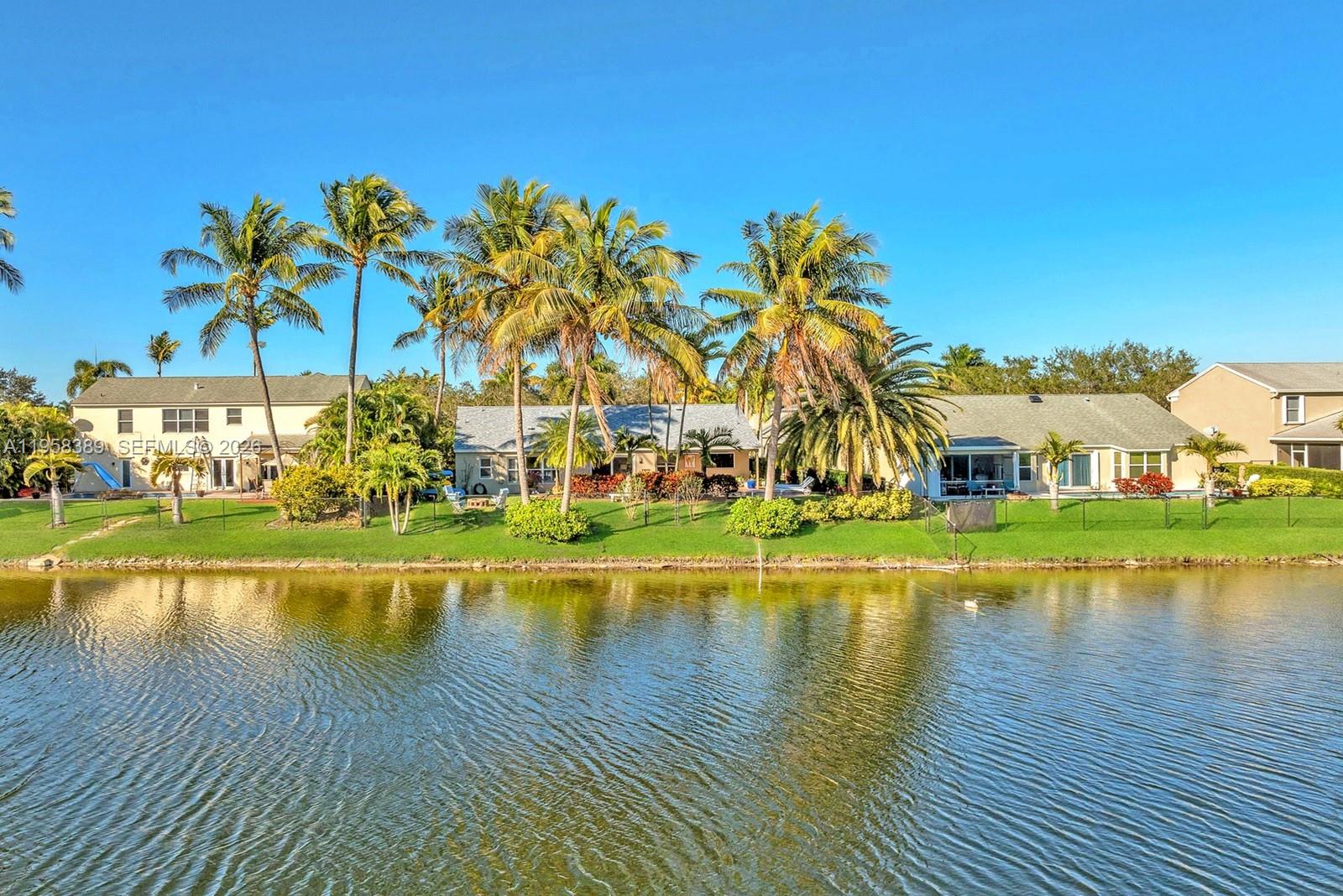 Spectacular pool and lakefront home in Cooper's Grove situated on a 9,502 sq ft waterfront premium lot. Home features a brand new 2026 roof, and full impact windows and doors. The residence offers 3 bedrooms + a den/office easily used a 4th bedroom and 2 full bathrooms. The eat in kitchen includes a picture window, wood cabinetry with pull out shelves, stainless steel appliances and an island and opens to the dining area and family room, creating a functional and open living space. Vaulted ceilings and numerous windows provide abundant natural light, with living areas and the kitchen overlooking the pool and lake. Elegant Plantation shutters throughout, travertine flooring in the main areas and water resistant wood-style laminate flooring in the bedrooms. The primary suite includes gorgeous high ceilings a large window with incredible views of the backyard and lake, a walk-in closet, and an en-suite bathroom with dual sinks and a fabulous shower. Outdoor features include a free form saltwater pool with a variable speed pump, southern exposure and tranquil lake views, offering a private and relaxing setting on a fenced backyard with tropical landscaping with lighting. Additional features include a variable speed newer A/C, new water heater being installed and copper plumbing (no poly). Home is located within the Cooper City school district and offers convenient access to shopping, dining, parks, and local amenities.