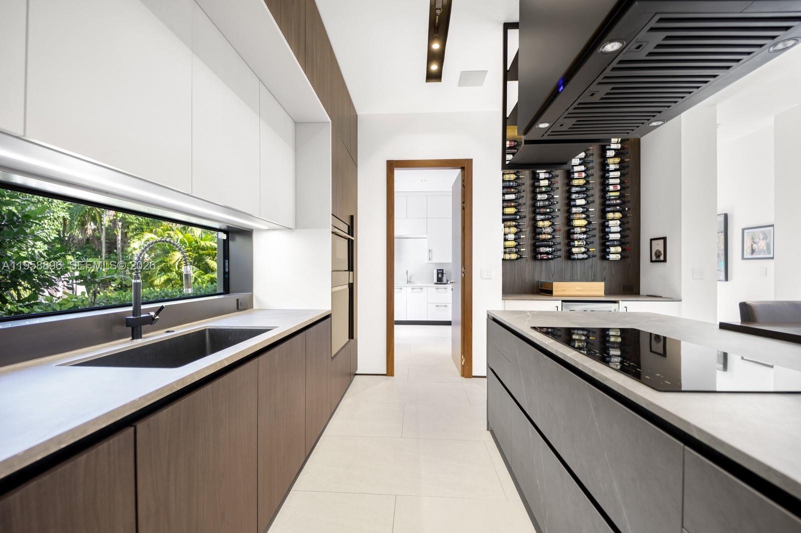 Experience modern luxury in the heart of Coral Gables. Designed for effortless living and entertaining, the open floor plan features volume ceilings and seamless indoor-outdoor flow. The Italian MiaCucina eat-in kitchen is a showpiece with Sub-Zero, Perlick, and Wolf appliances, custom bar and wine display, and a walk-in pantry with integrated laundry, including a custom 2 drawer Perlick refrigerator for convenience. The primary suite is a private retreat overlooking the pool, offering a large walk-in closet, an additional walk-in storage closet, and a spa-inspired bath with an oversized rainfall shower, floating vanity, and dual sinks. Outdoors, enjoy a saltwater pool with state-of-the-art heater and chiller, a private outdoor shower, and a custom-designed outdoor kitchen with a Fire Magic built-in grill and Perlick cooler. Additional features include Lutron smart home technology and a double-height garage ceiling built to accommodate a car lift. The home is equipped with integrated high-definition security cameras and a state-of-the-art security system for peace of mind. Enjoy Sonos audio throughout the main room, kitchen, master bath, and lanai, as well as Sony Master Series TVs in the main room, master suite, office, both guest bedrooms, and workout room. Magnificent landscaping too!