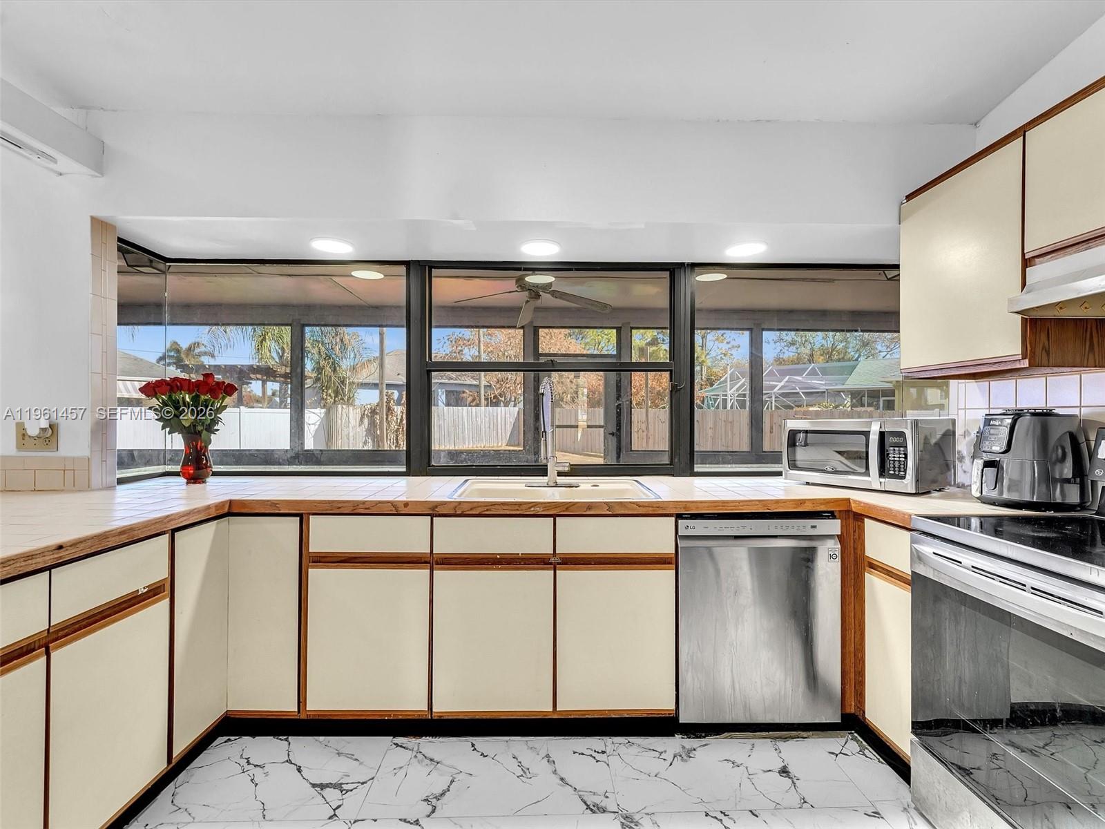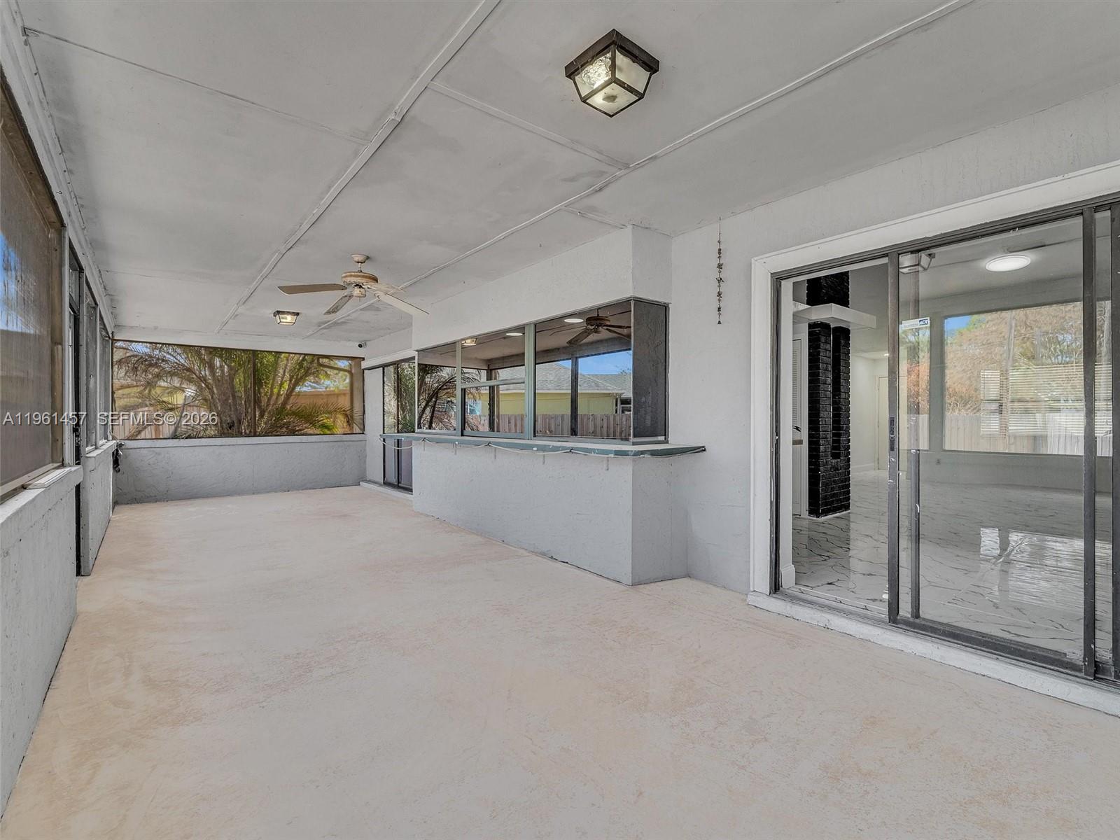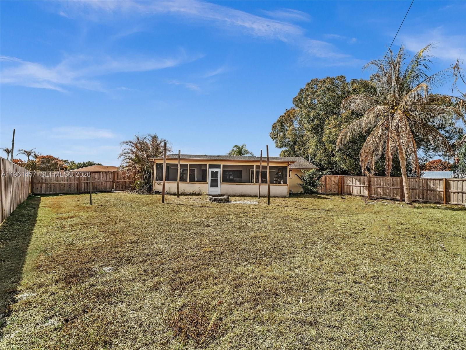 Incredible opportunity to own this charming 2 bedroom, 2 bathroom home on a spacious corner lot located in the heart of Port St. Lucie. This pristine property was recently renovated with porcelain tiles throughout and updated master bathroom. An open kitchen, adjacent to a large dining room, with a new Samsung refrigerator and garbage disposal, recently installed. A split bedroom layout with spacious walk-in closets and plenty of storage room. The fencing was just replaced along with a new flat roof. It features an oversized covered patio with a pass through bar top, giving you that great feeling for relaxation and entertaining your family and friends.