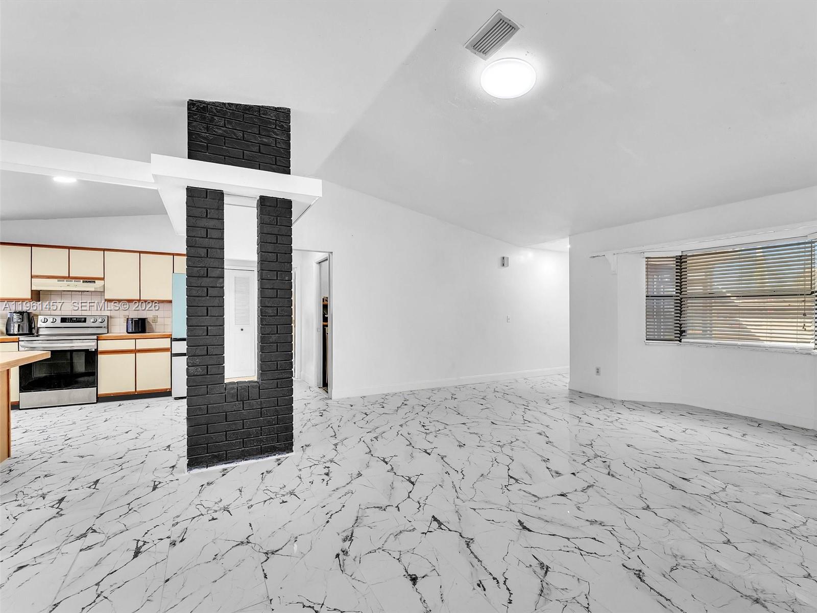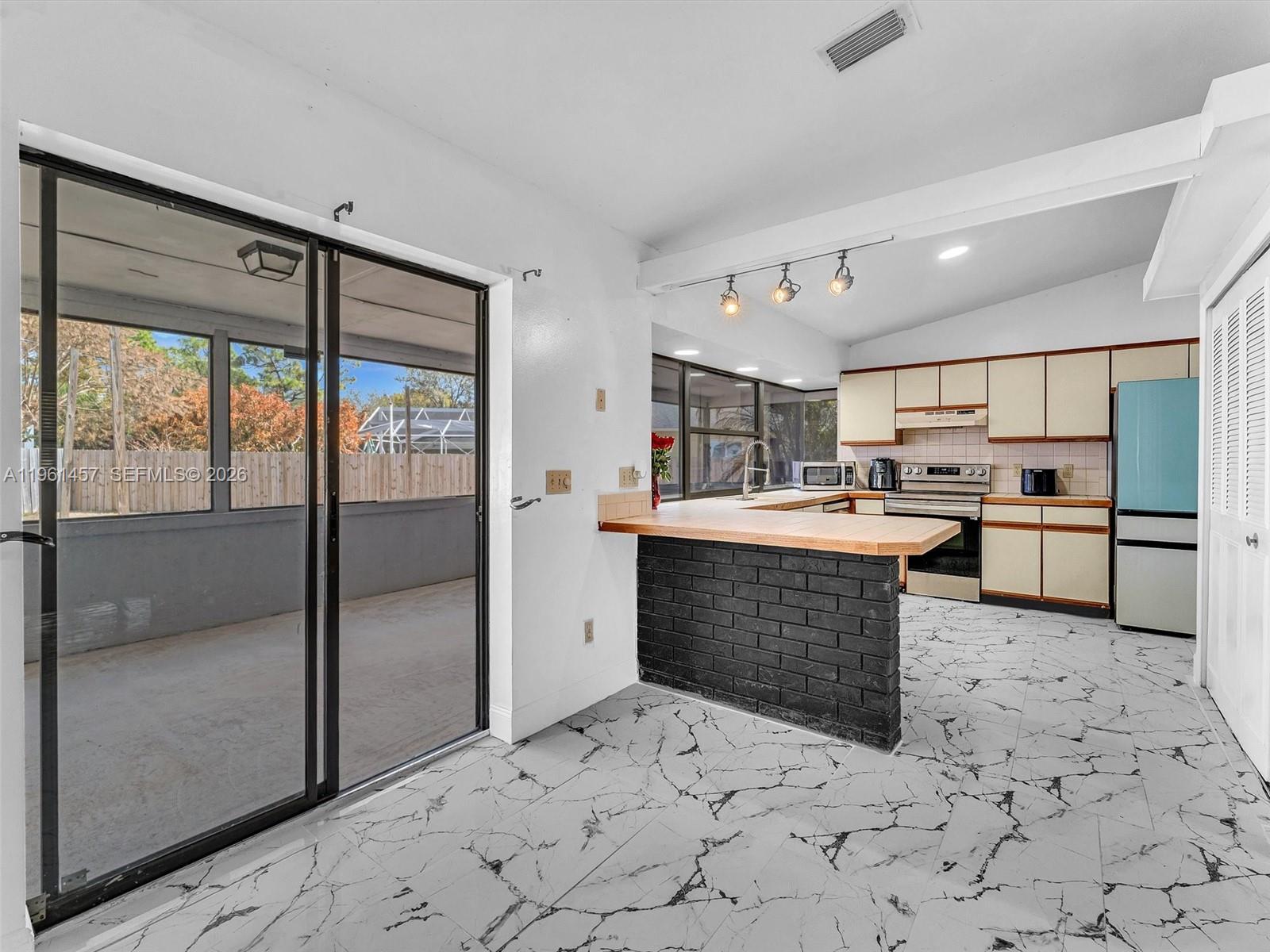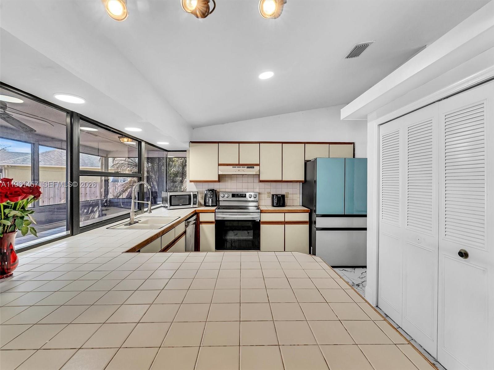 Incredible opportunity to own this charming 2 bedroom, 2 bathroom home on a spacious corner lot located in the heart of Port St. Lucie. This pristine property was recently renovated with porcelain tiles throughout and updated master bathroom. An open kitchen, adjacent to a large dining room, with a new Samsung refrigerator and garbage disposal, recently installed. A split bedroom layout with spacious walk-in closets and plenty of storage room. The fencing was just replaced along with a new flat roof. It features an oversized covered patio with a pass through bar top, giving you that great feeling for relaxation and entertaining your family and friends.