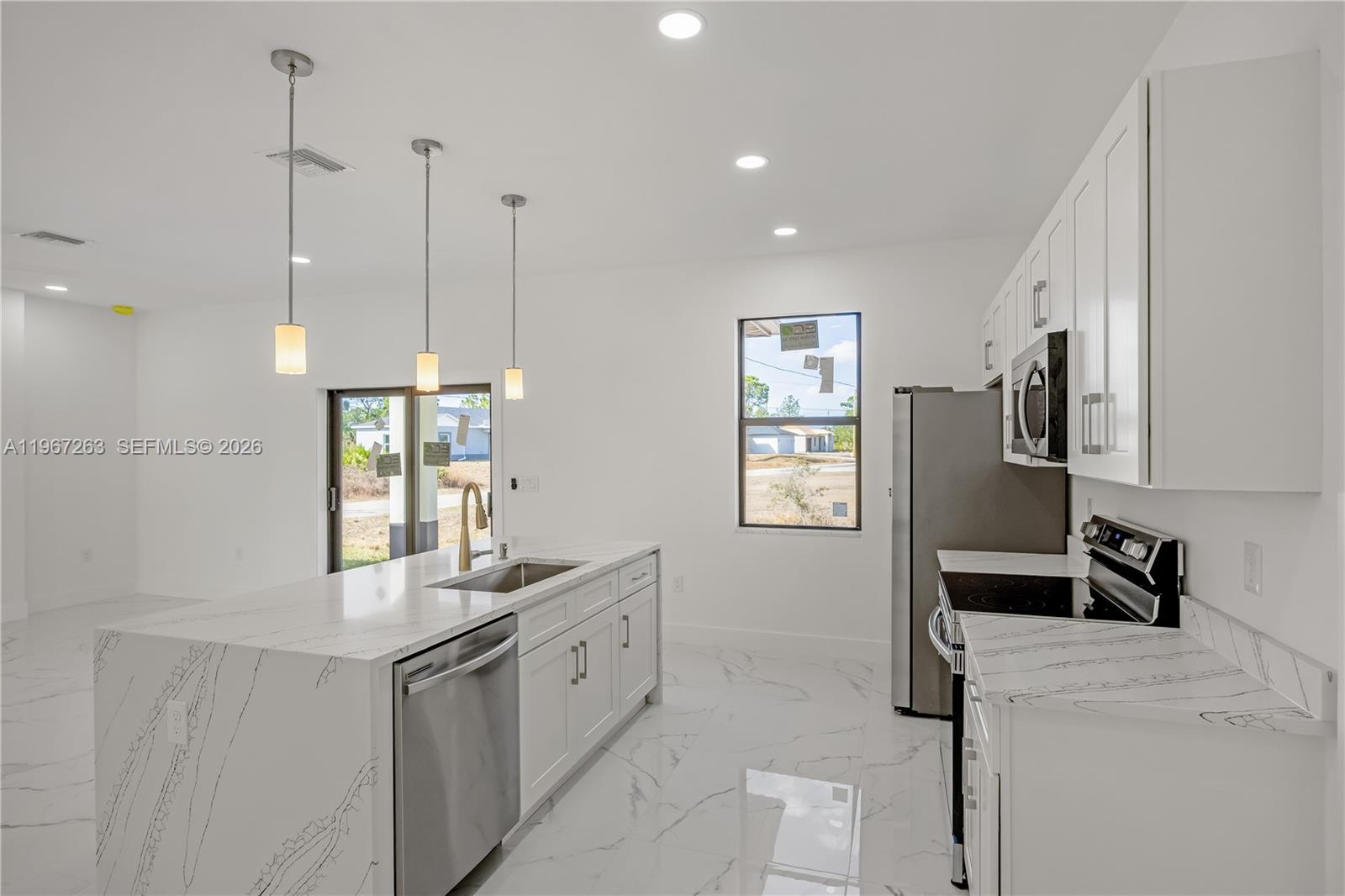 his brand-new construction 2026 home is move-in ready with Certificate of Occupancy in hand and offers 4 bedrooms and 2 bathrooms with modern finishes, high ceilings, and a thoughtfully designed open layout ideal for everyday living. The spacious kitchen is the heart of the home, featuring sleek all-white quartz countertops throughout the kitchen and bathrooms, along with a striking waterfall quartz island—perfect for casual dining and entertaining. Stainless steel appliances and clean, contemporary details complete the space. Enjoy added comfort and peace of mind with impact windows and the convenience of no HOA restrictions. Competitively priced and ready to sell, this home is ideally located near shopping, dining, and major roadways, with a new Walmart coming soon nearby. A fantastic opportunity to own a brand-new, move-in-ready home in a growing Lehigh Acres neighborhood.