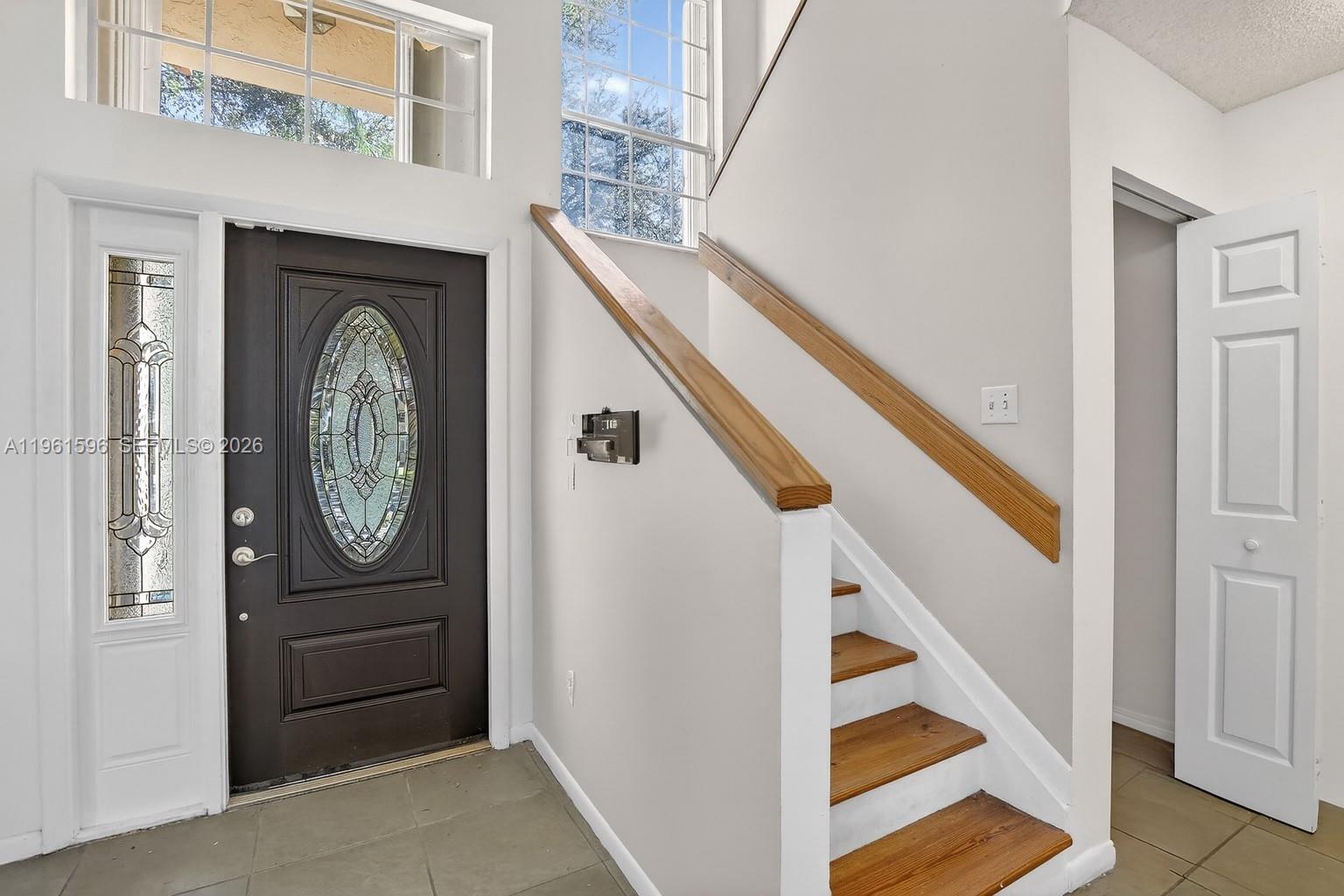 Nestled in the guard-gated community of Embassy Lakes in Cooper City, this move-in ready 4-bedroom, 2-bath two-story home offers 2,227 sq ft of thoughtfully designed living space, including a convenient ground-floor primary suite. Volume ceilings and neutral tones enhance the light-filled interior, creating an open and airy atmosphere. The kitchen showcases stainless steel appliances and a center island, seamlessly connecting to the family room for effortless everyday living and entertaining. An expansive covered patio extends the living space outdoors, overlooking a private backyard with ample room to add a pool. Generously sized bedrooms, abundant storage, tile and wood flooring, accordion shutters, and a 2-car garage complete the home’s comfort and functionality. Residents benefit from a low HOA and access to a clubhouse, community pool, tennis courts, playground, scenic walking paths, and 24-hour guard-gated entry, all just minutes from top-rated schools, shopping, dining, and entertainment.