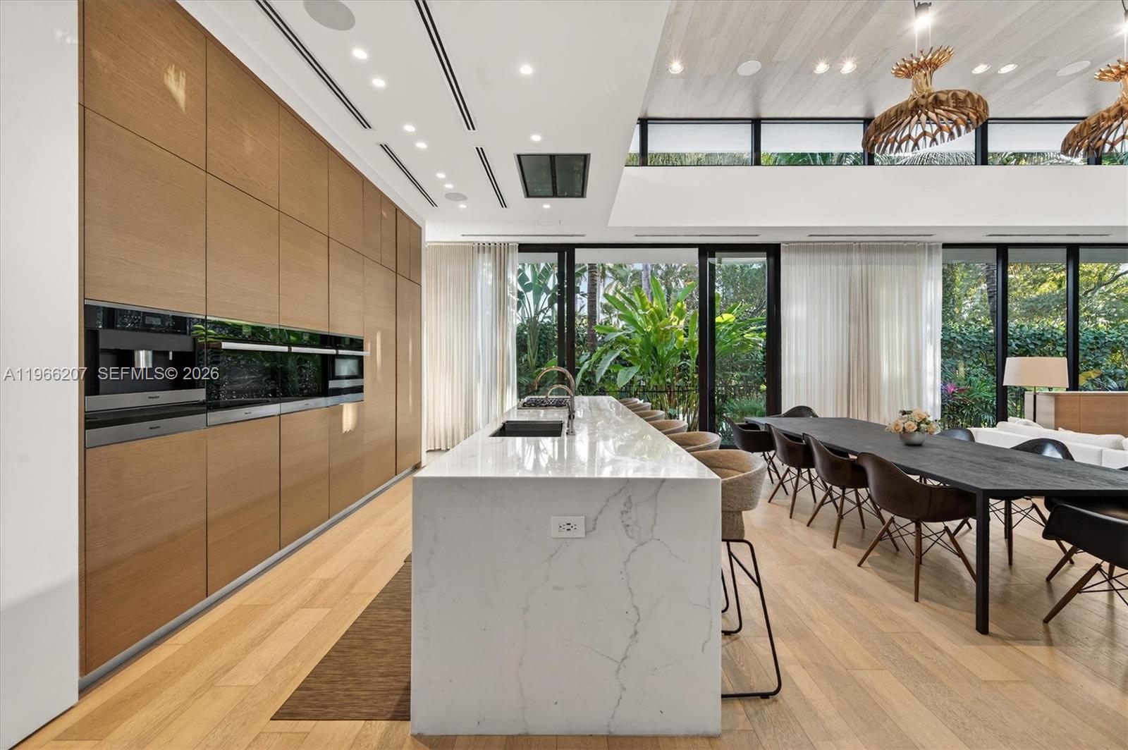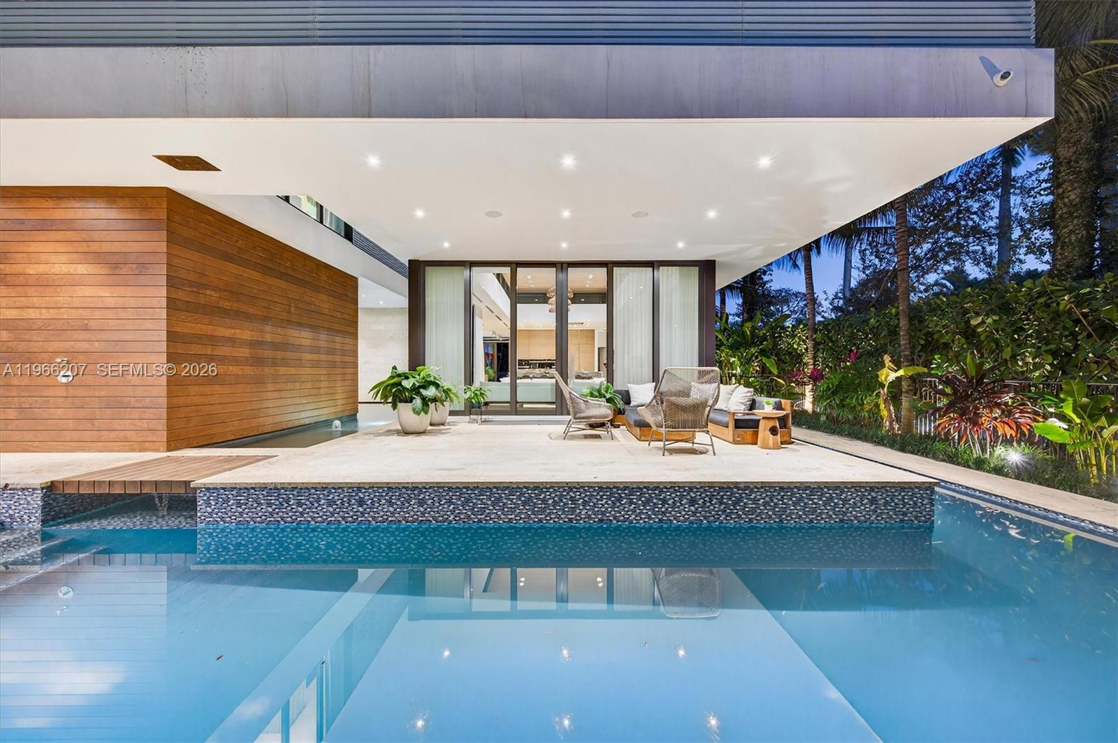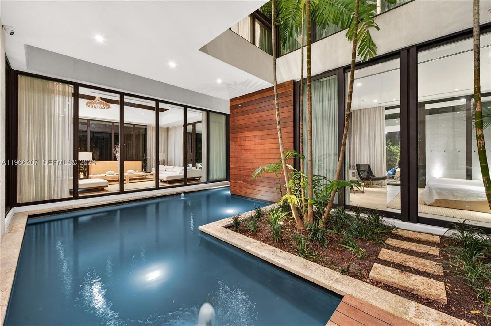 2300 Sunset Drive is a tropical modern six-bedroom, eight-bathroom home on Sunset Island 3 in Miami Beach — one of only two guard-gated island communities you can actually walk from to great restaurants and boutiques. Set on a 13,500-square-foot lot, this move-in ready residence blends clean architecture with warm, organic finishes and effortless indoor-outdoor living. All six bedrooms are en suite, and every bathroom is wrapped in floor-to-ceiling marble for a true spa feel. White oak floors run throughout, and the chef’s kitchen is equipped with premium Miele appliances. Walls of glass overlook lush tropical landscaping and tranquil water features, giving the entire home a five-star resort vibe reminiscent of Aman or Four Seasons. The pool wraps around the house, creating a dramatic, resort-style setting that connects every space. Two expansive private sun decks, a built-in barbecue, and a natural keystone patio and driveway complete the outdoor experience. With so many indoor and outdoor spaces surrounded by water and glass, the home feels like a true architectural showpiece. And the real luxury? Security and privacy. Living on a guard-gated island means peace of mind — while still being right in the center of Miami Beach. It feels like your own private tropical island, just minutes from everything.