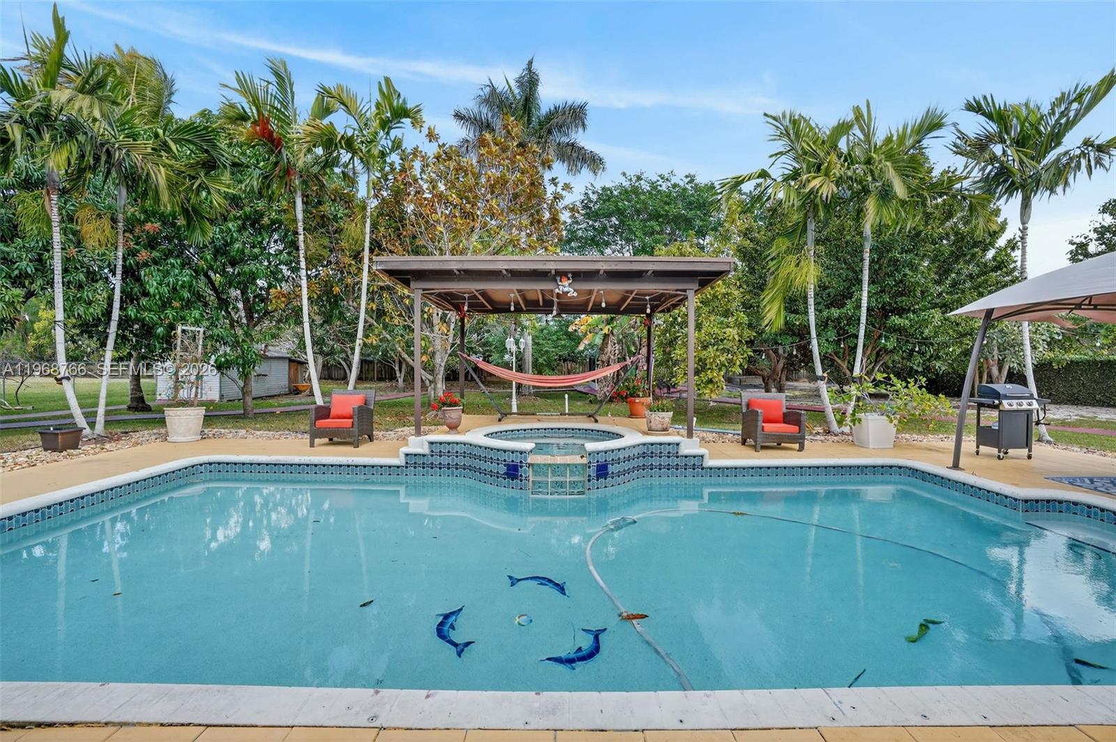 Discover this stunning 4-bedroom, 3-bath estate in Redland offering 3,373 sq ft of living space on a builder’s acre. High ceilings and spacious interiors create an open, airy feel perfect for comfortable living and entertaining. Step outside to your private oasis featuring a pool, jacuzzi, gazebo, and full court—plus over 15 mature fruit trees for true South Florida charm. Equipped with a gas generator for peace of mind. Enjoy serene outdoor living close to the city, yet tucked away from the noise.